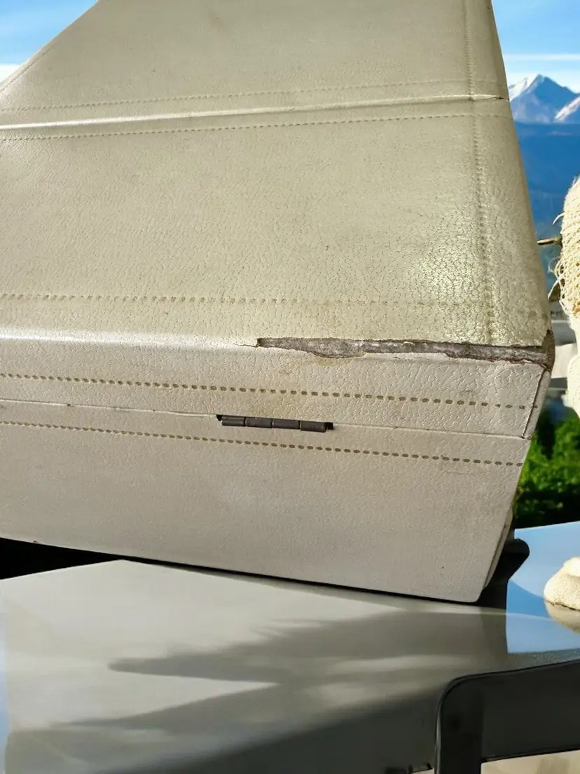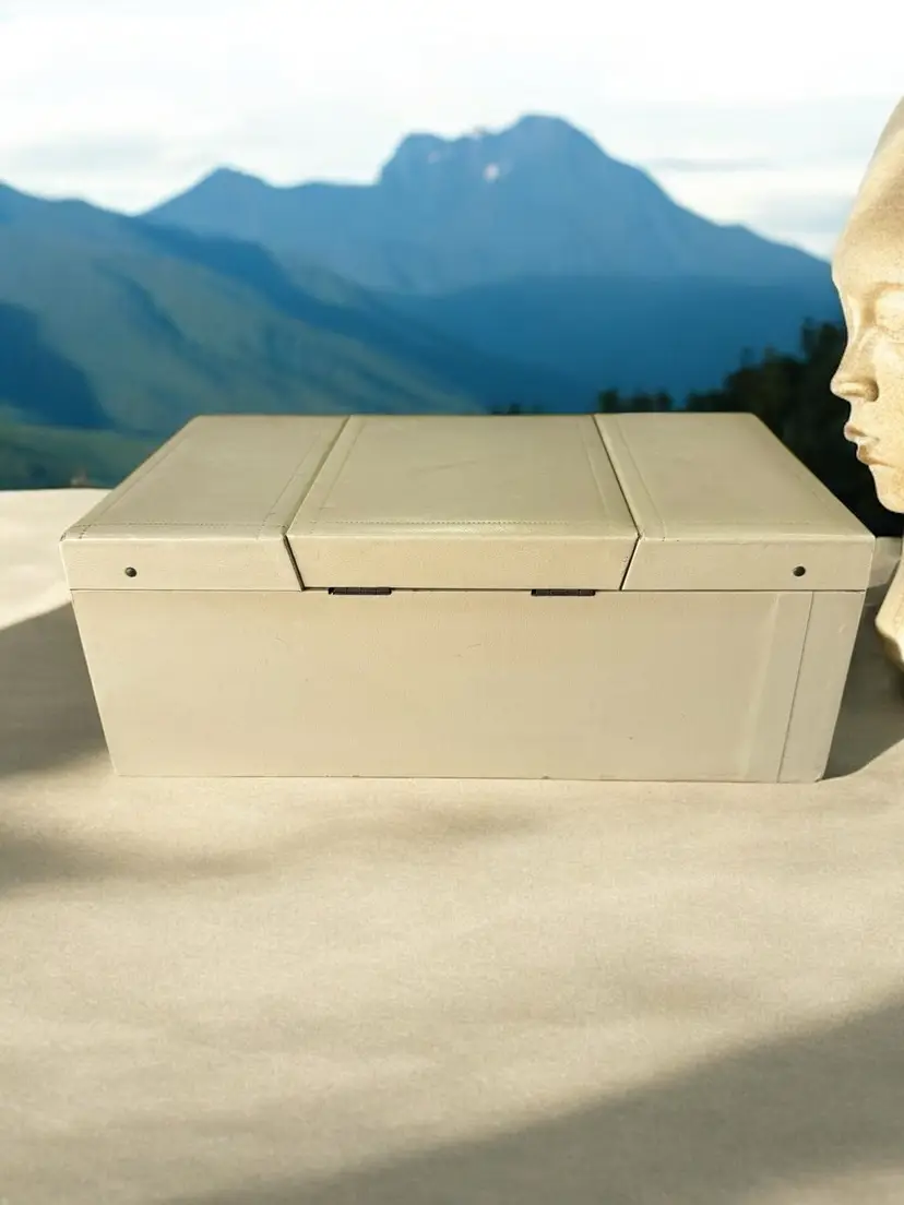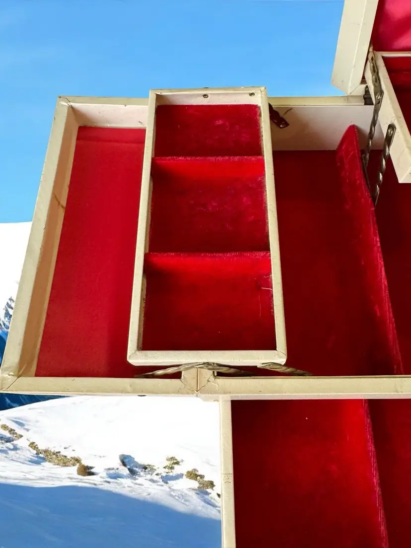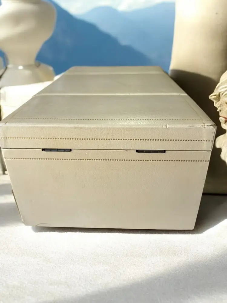 Great vintage 50’s cream colored, huge, jewelry box .. the edges are timmed in and front are trimmed in gold .. bottom large pull out draw with gold handles and 3 large divided sections , gold lock hardware , no key , the center piece opens with 2 storage areas and a red background on the back with a gold floral tree design , the other 2 sides open and layout to another divided storage area on each side . Beautiful unmarked Mele piece . Has a little wear on the left front cover as shown in pic. Green felt bottom .. Measures 22.5 in wide when opened , 14 in from side to side and 8 in from front to back stands 5.5 tall closed smoke and pet free