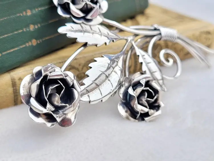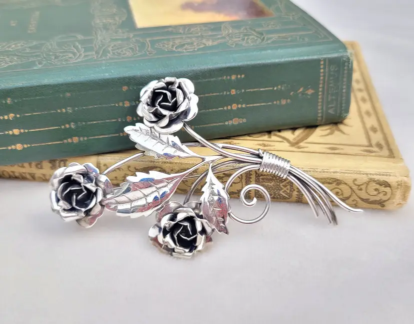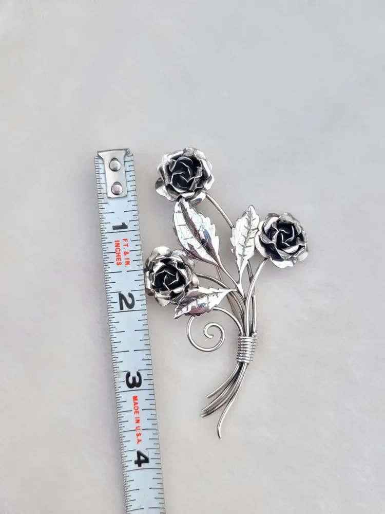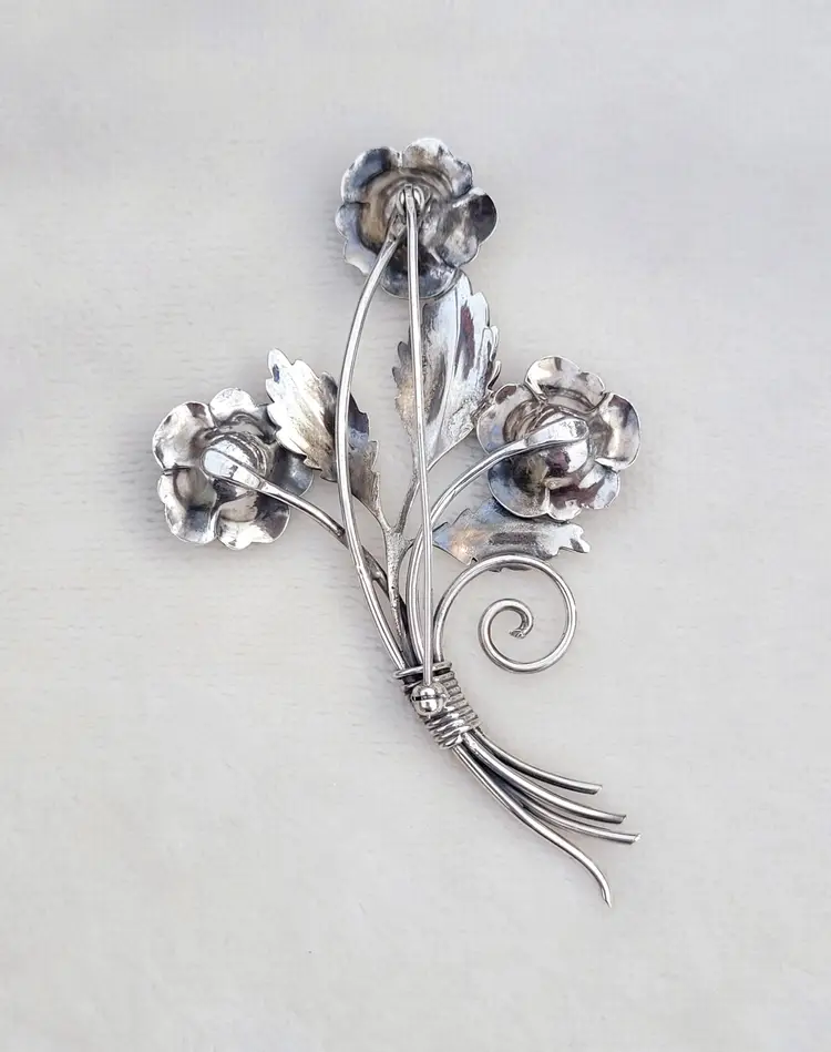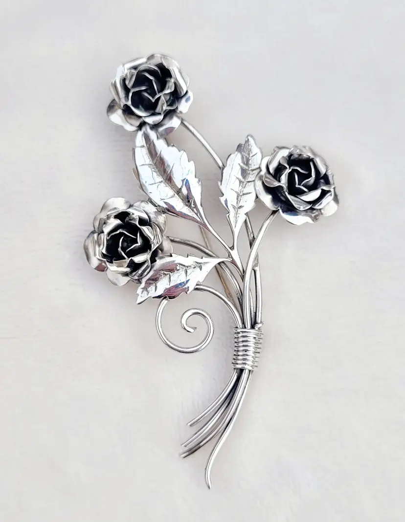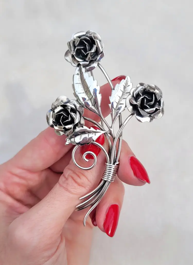 Big lovely statement of a brooch, depicting a bouquet of roses made of solid sterling silver. This is circa 1940s and in good condition from an estate. Please see pictures for details and measurements.