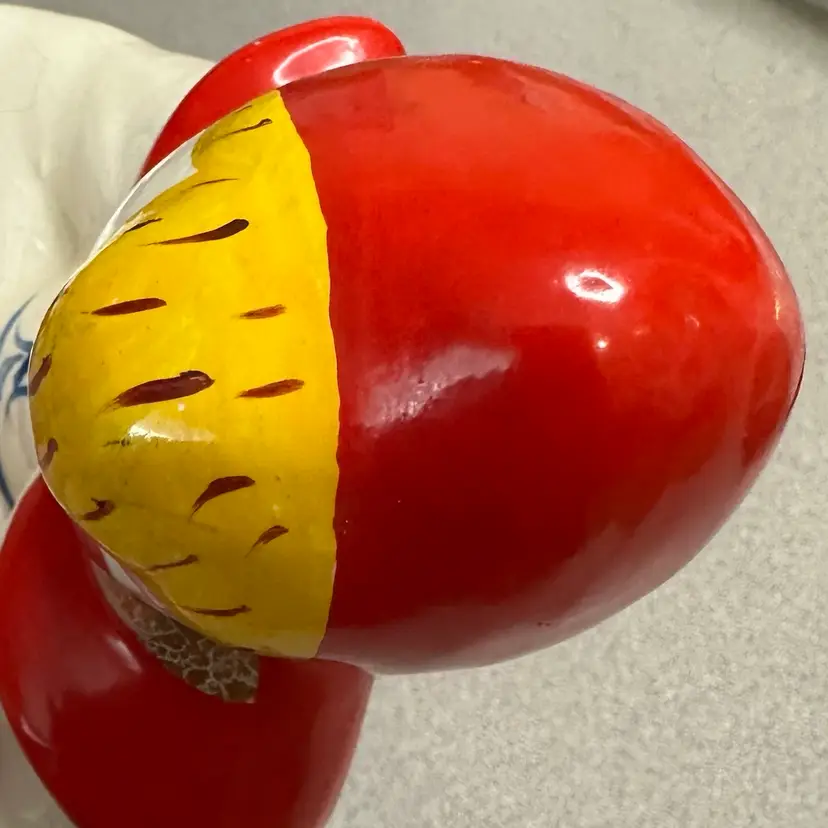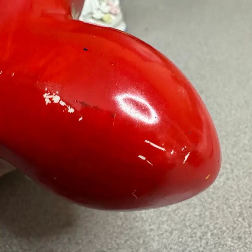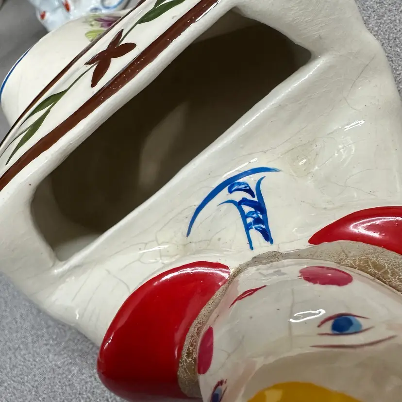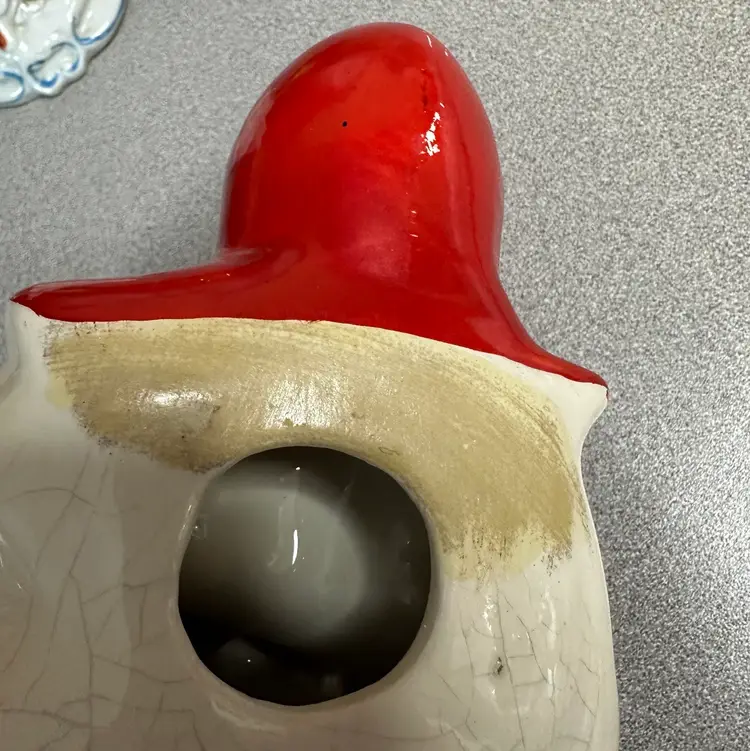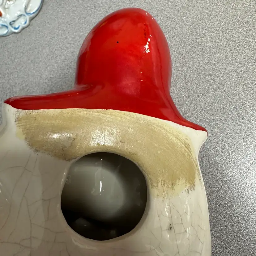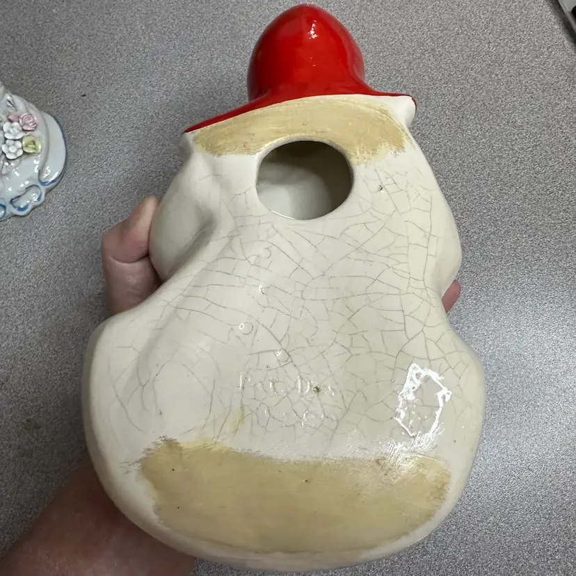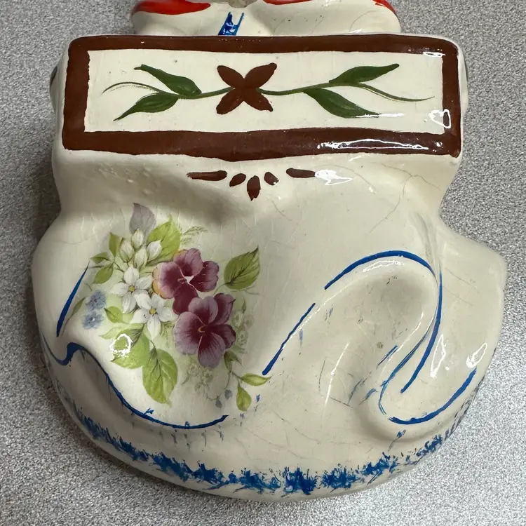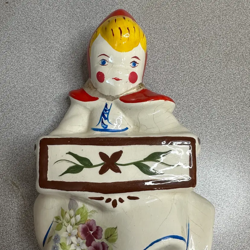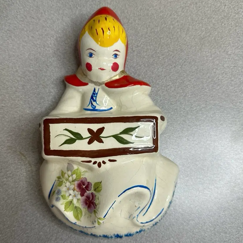 She is a nice lady who will hold your plan or your string or your honey sticks. She has crazing and a bit of red cold paint loss on the back of her head that isn't notifiable if displayed as intended.