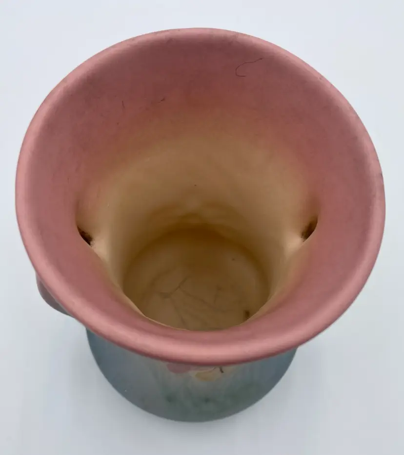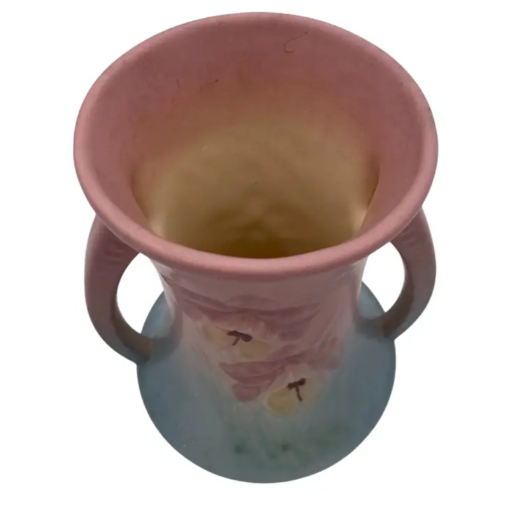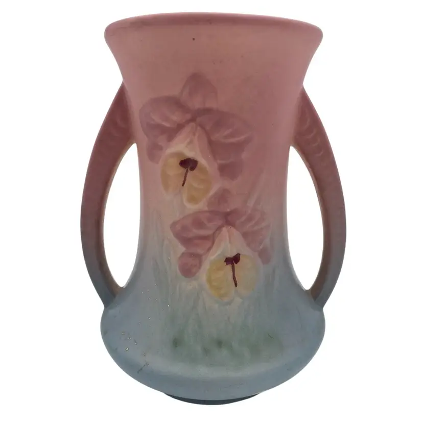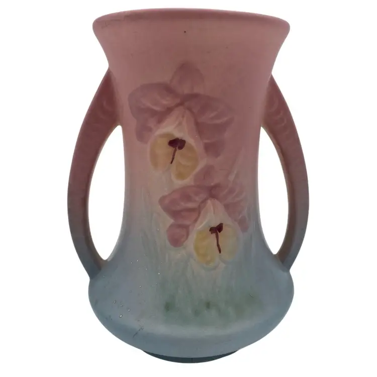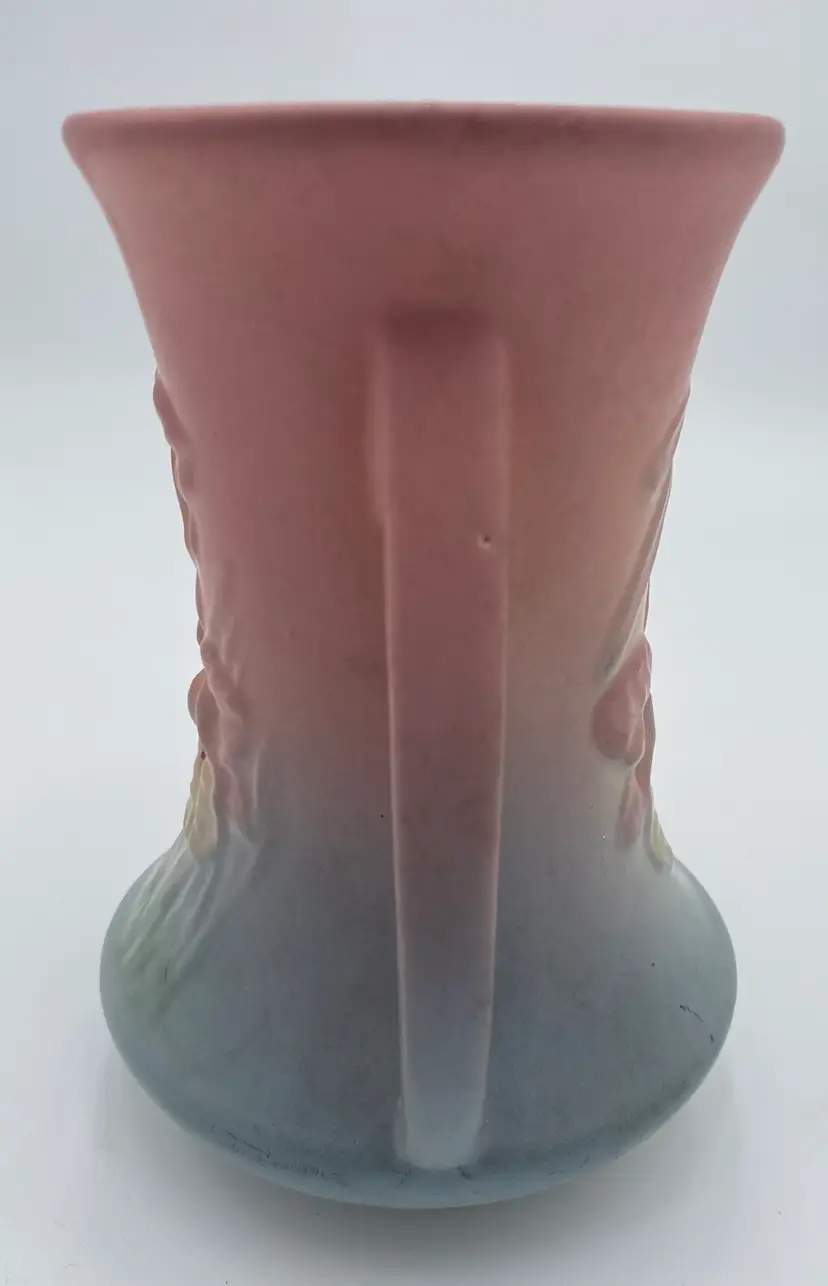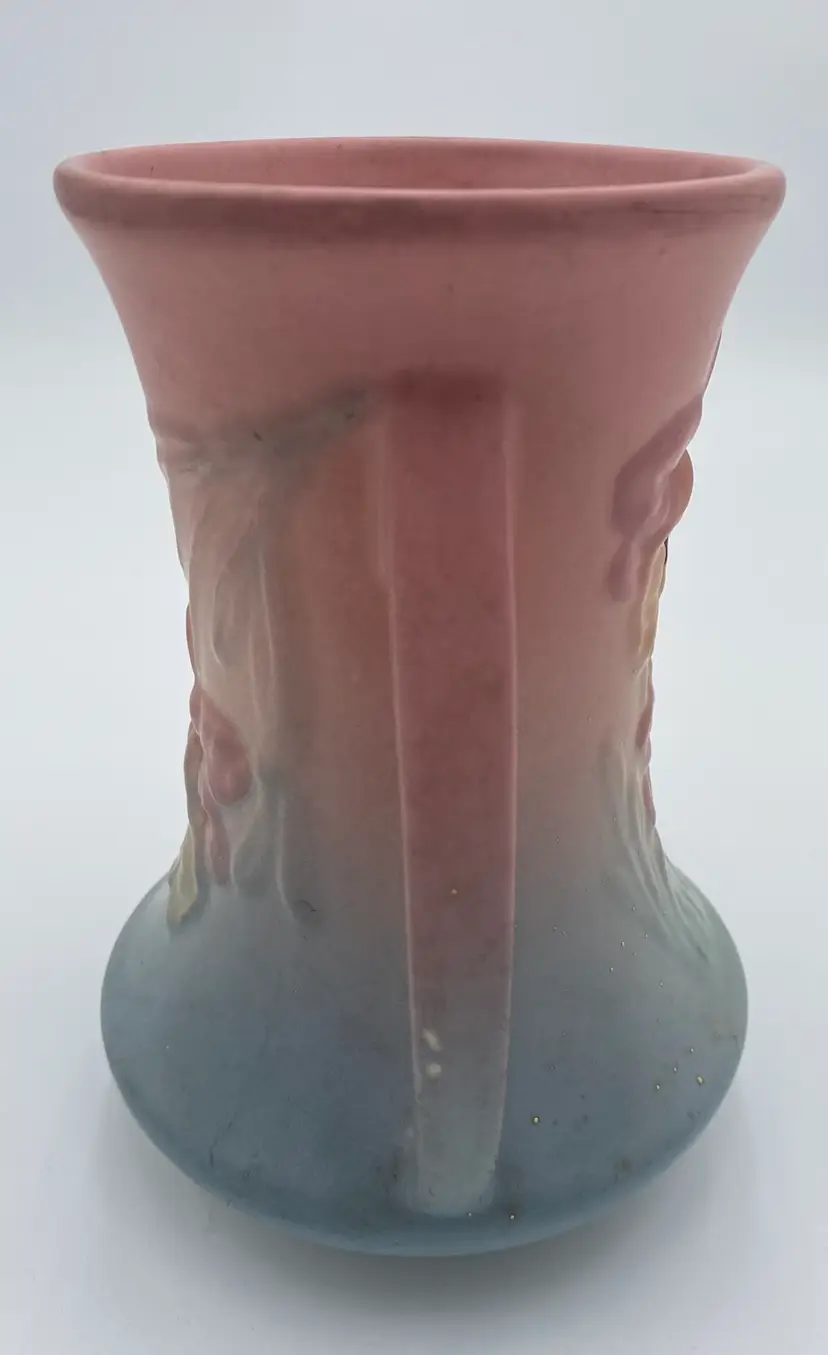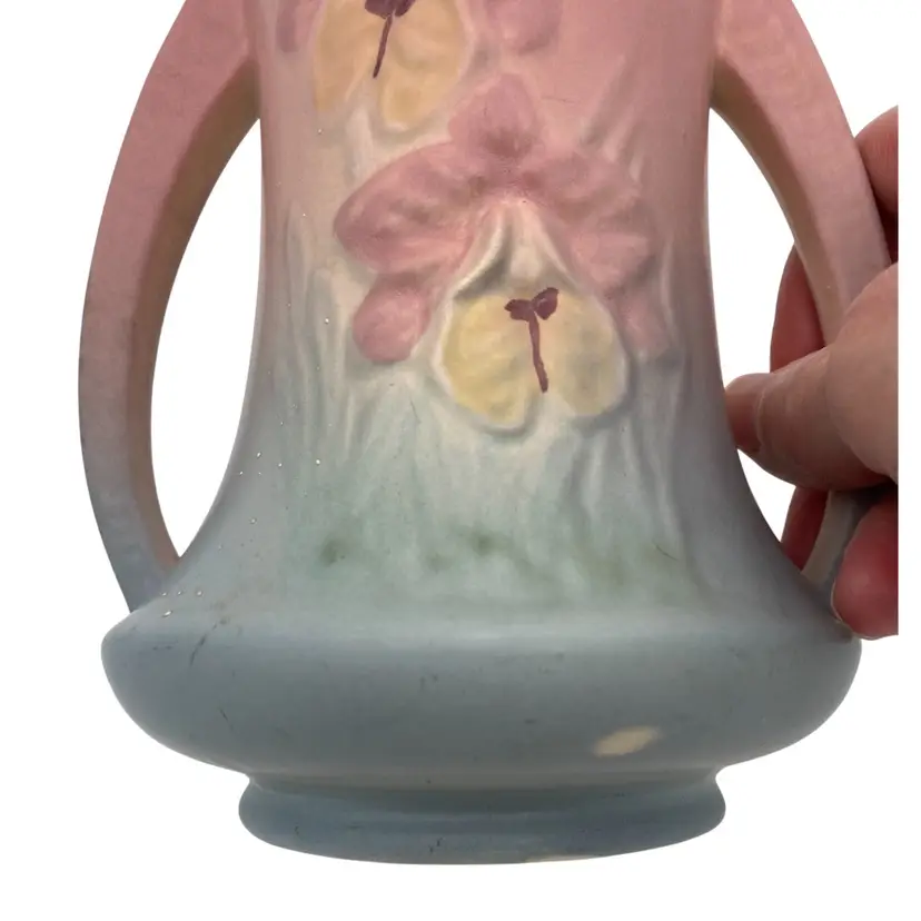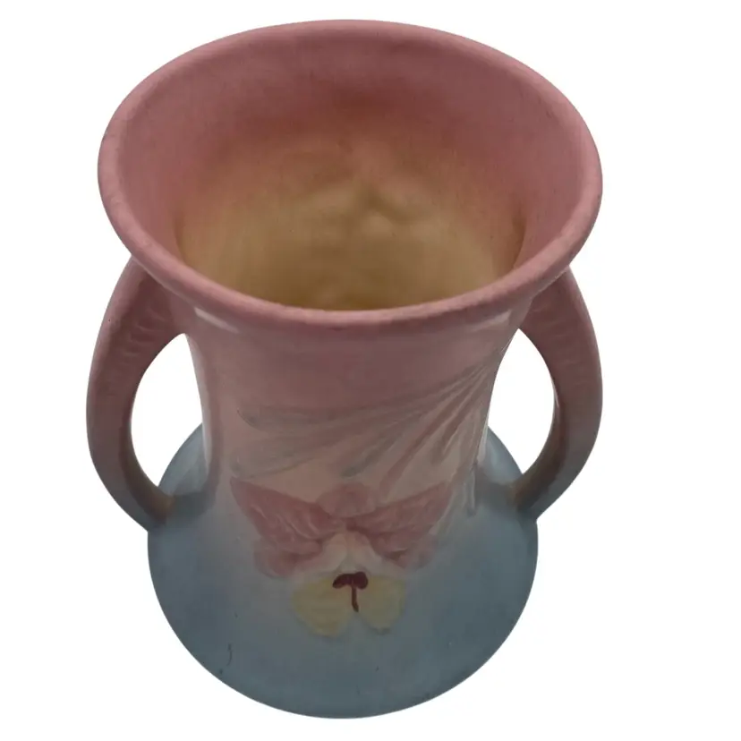This beautiful Hull Pottery vase is a vintage piece from the mid-20th century. It features a raised relief orchid pattern on a matte blue and pink finish. The vase has double handles and measures 6.5 inches in height and 5.5 inches in width. It is an original piece from Ohio, and weighs 1 pound and 6.5 ounces. The vase is perfect for any Mid-Century Modern decor and is a great addition to any collection.