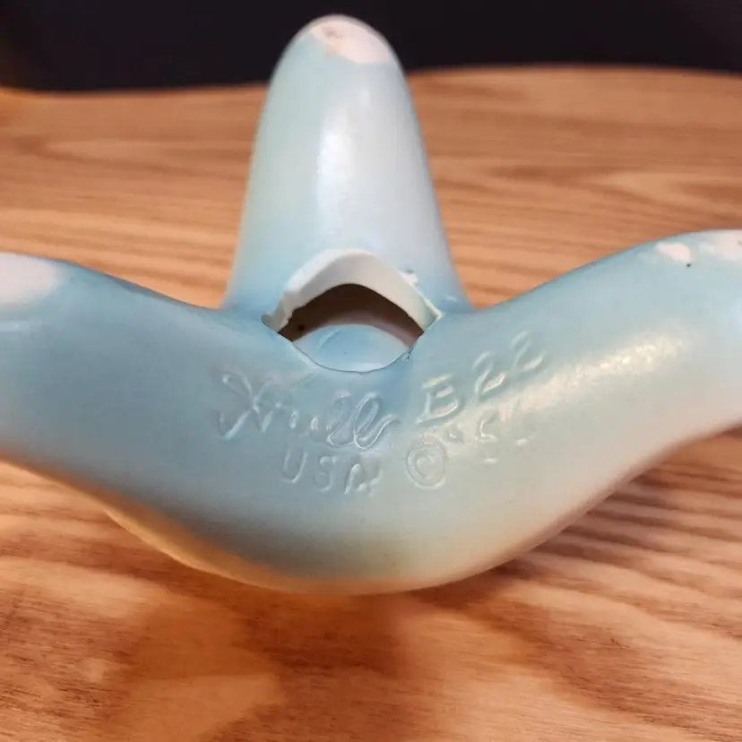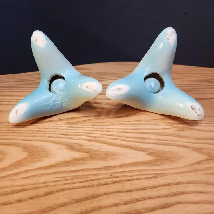 This is one of the many pieces from the Butterfly Collection from 1956 offered from Hull Pottery. They have an atomic meets nature quality. These particular candle holders have a creamy off white, matte glaze finish with a Robin's eggs blue blue fade. There is a pair vase that match this pair of candle holders available on my site as well as other pieces in the Butterfly Collection but with a splatter glaze.