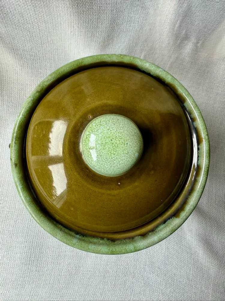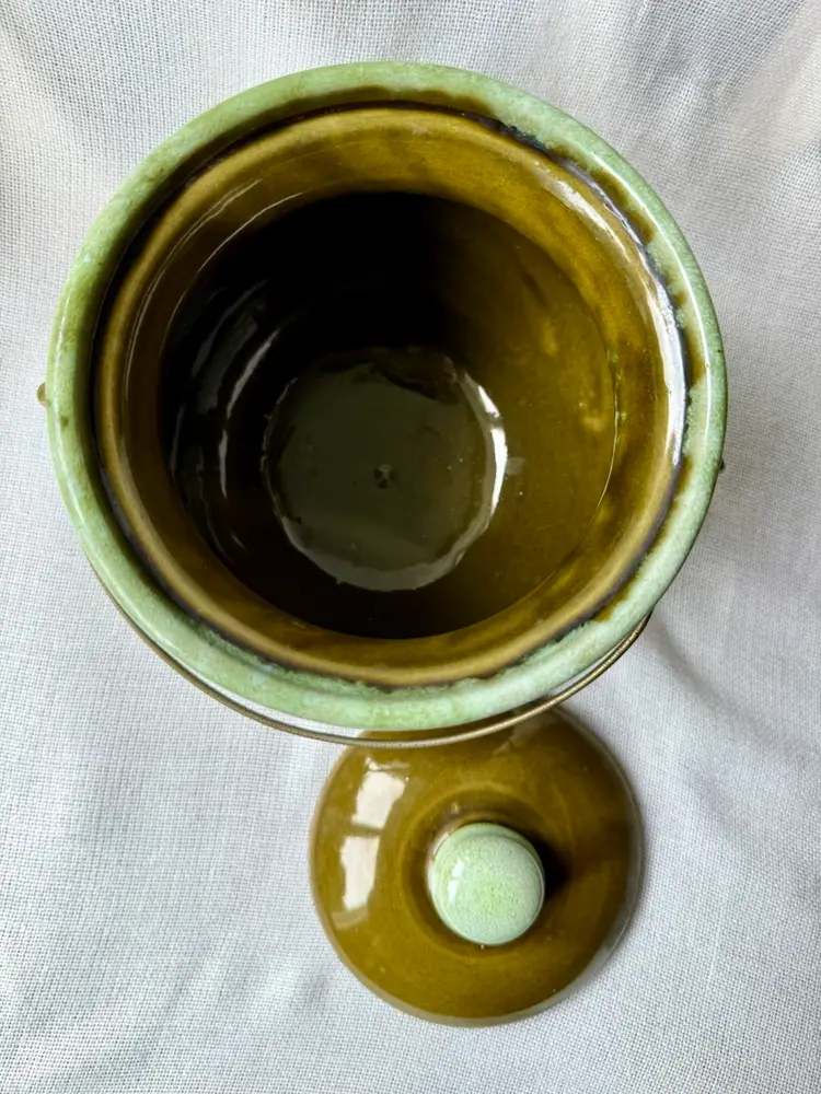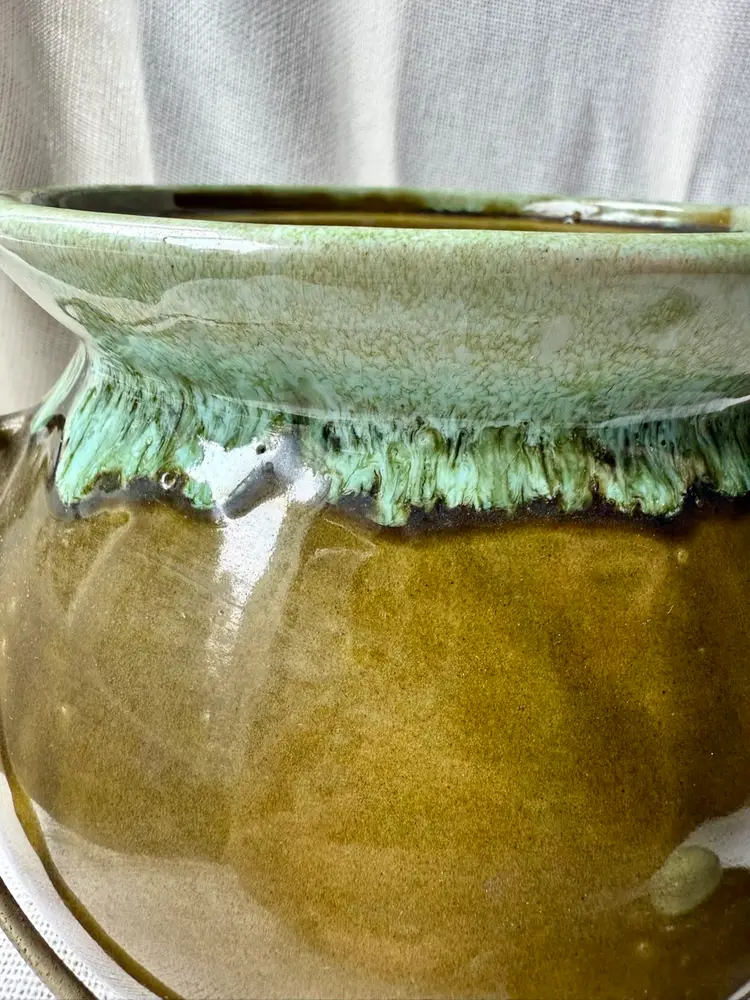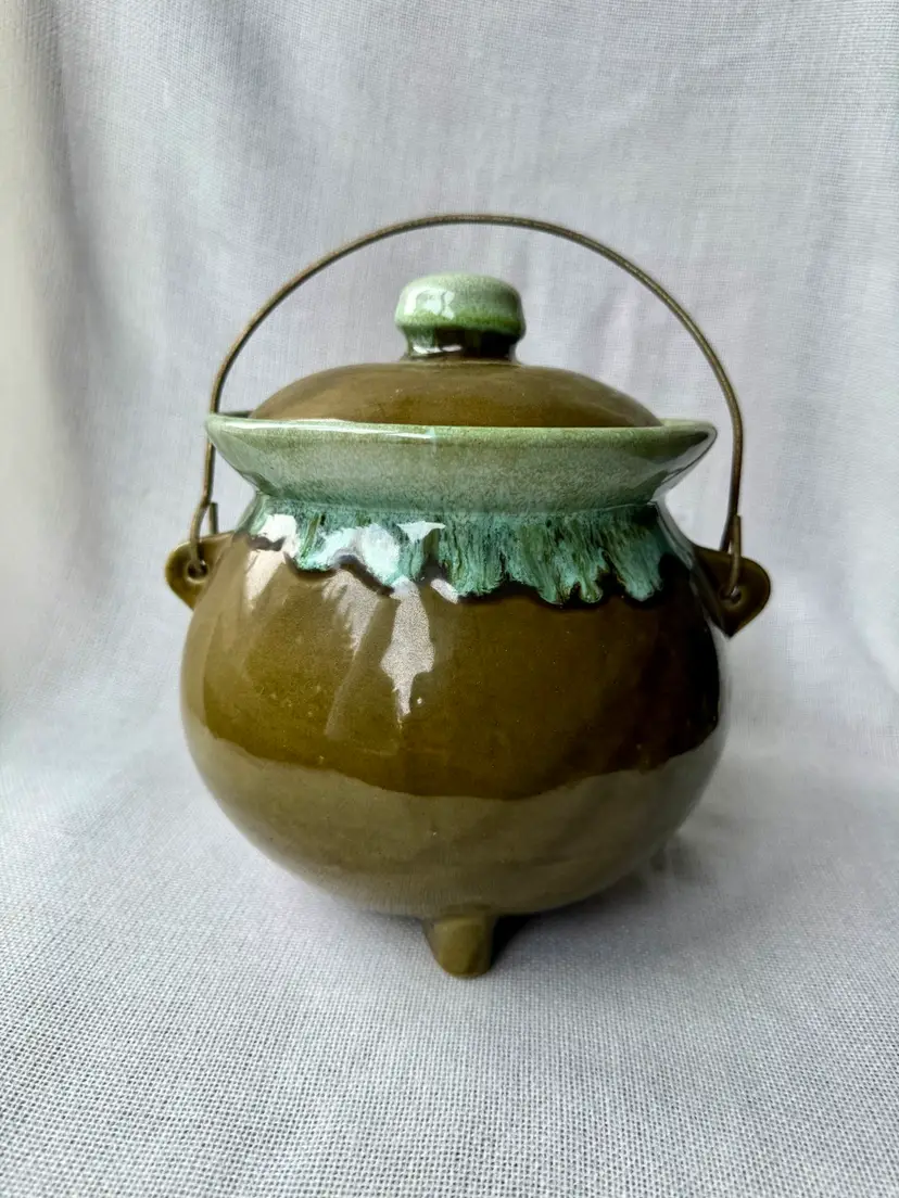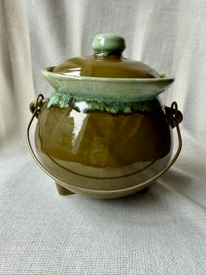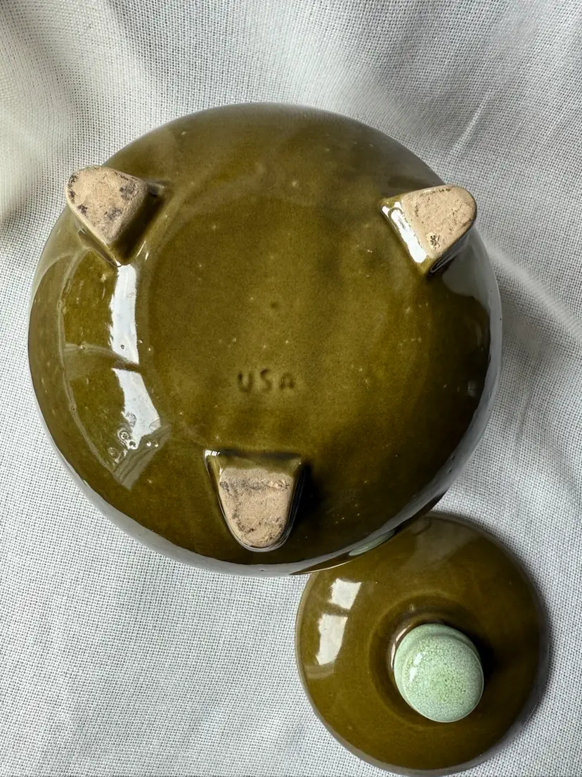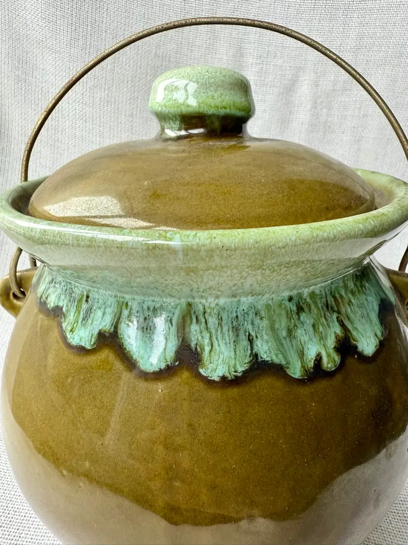 This gorgeous green drip glaze bean pot comes complete with the wire handle and is stamped ‘USA’ on the bottom. Its dimensions are about 8.5” x 6” with the lid on. I estimate it to be from the 1950s-1960s based on other Hull Pottery productions. The green colors used in the drip glaze create a new and captivating look for this piece!