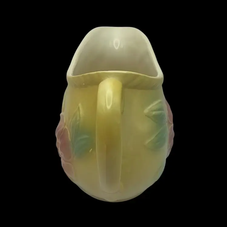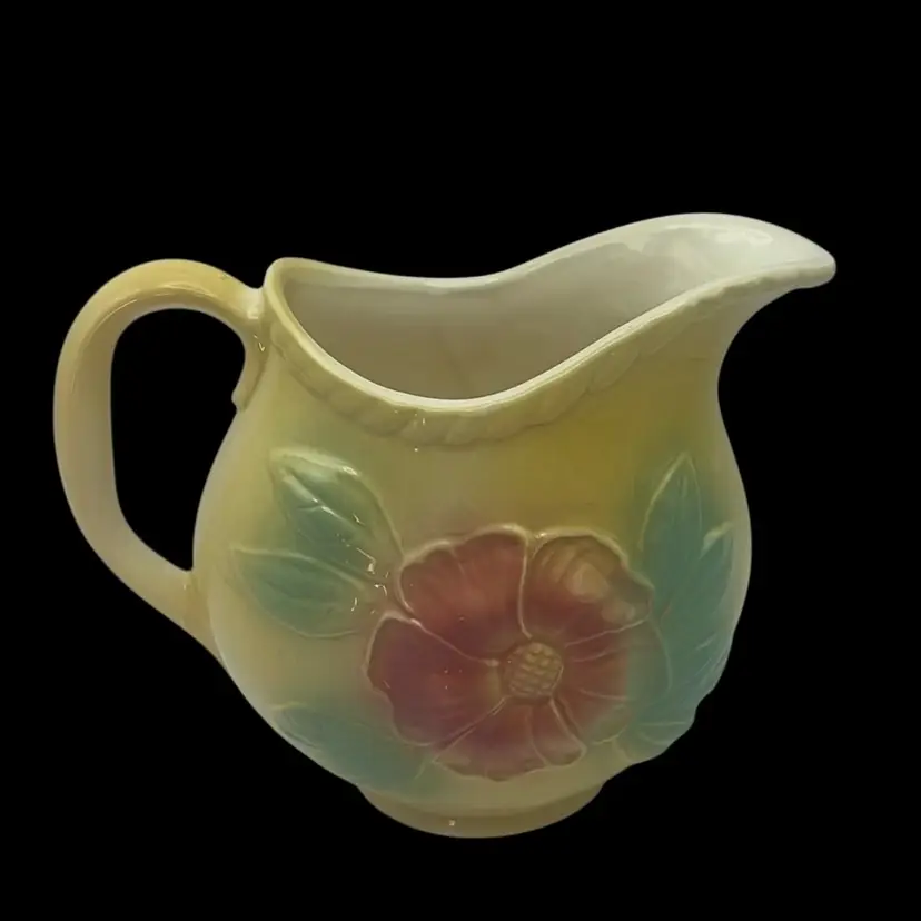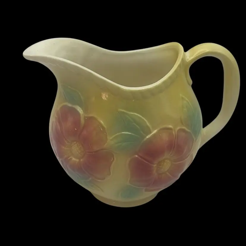 Featuring the Dogwood Sunglow Line, made of ceramic. A gorgeous yellow color with pink flowers and a rope trim around the top. Holds 24 ounces. Marked #52 USA on the bottom. Made in 1950-1959 and in great condition!
