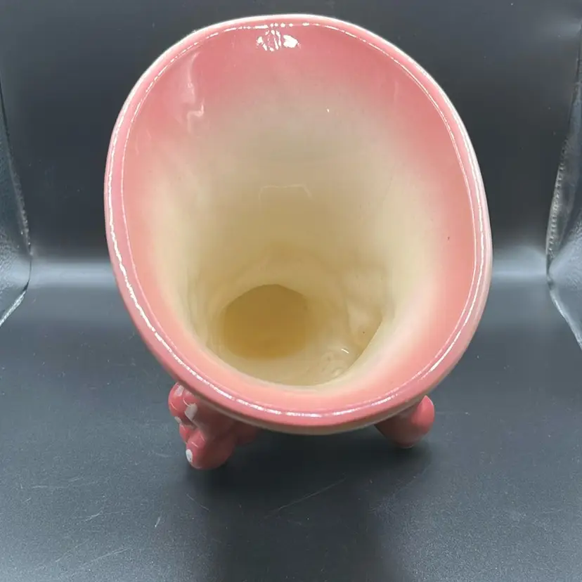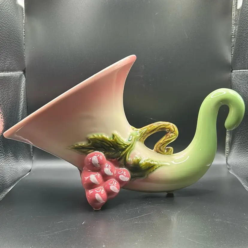 This item is a vintage Hull pottery Tokay cornucopia vase. It comes from the mid 20th century. It has a pink and green color scheme with a grapevine motif. It stands 7 1/2 inches tall and about 9 inches wide. There are no chips or cracks