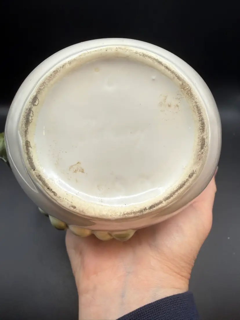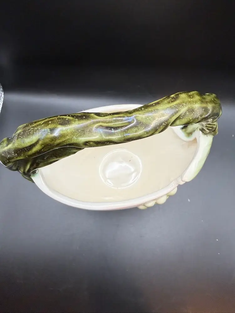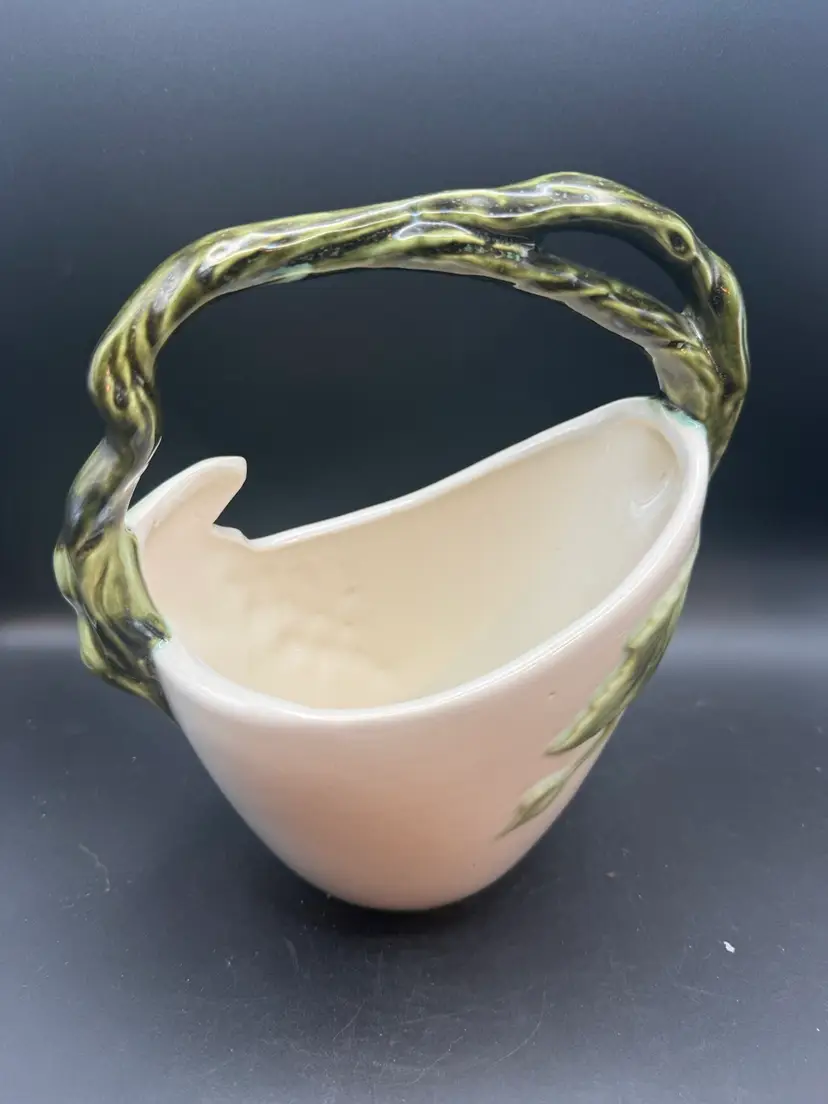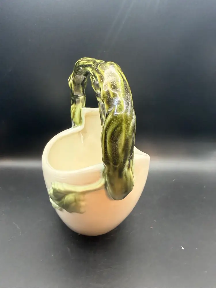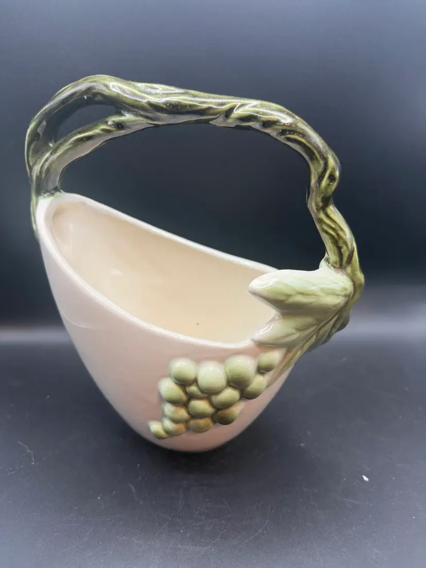 The 'Tuscany' line, introduced in the late 1950s, is characterized by its realistic grape and grapevine designs, often rendered in a mottled green glaze against a pastel-colored body. This particular piece, likely intended as a vase or decorative basket.