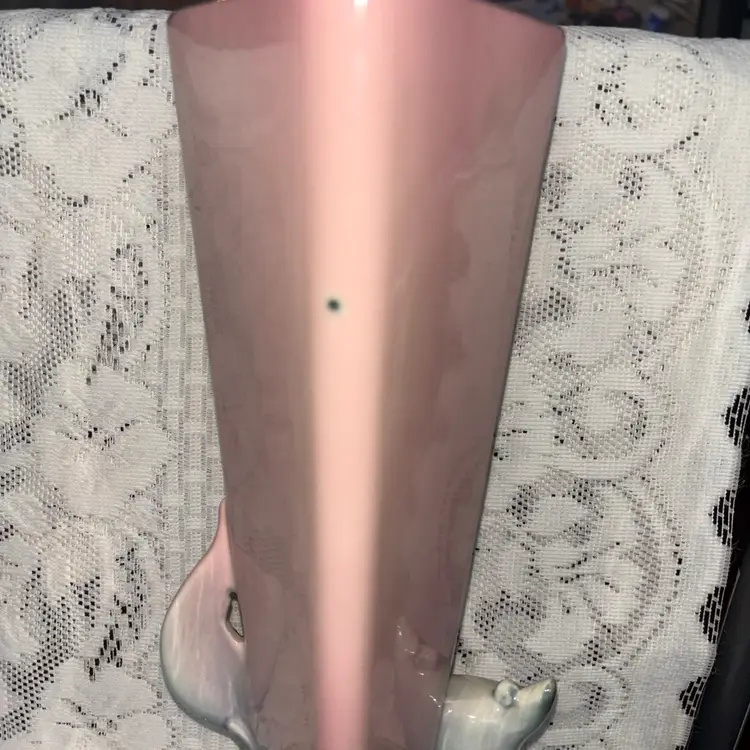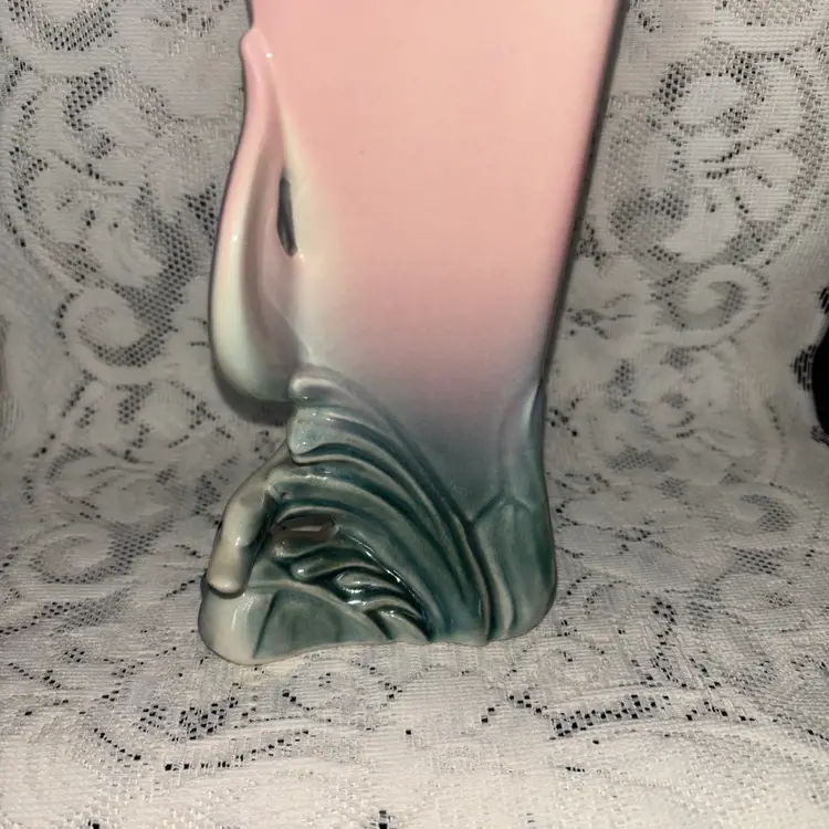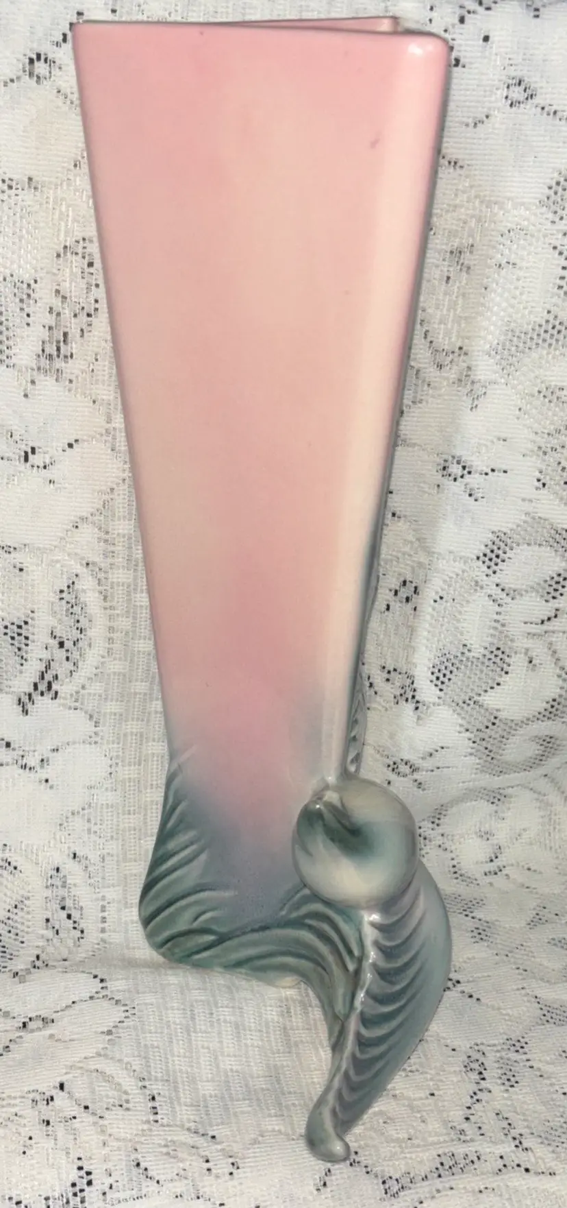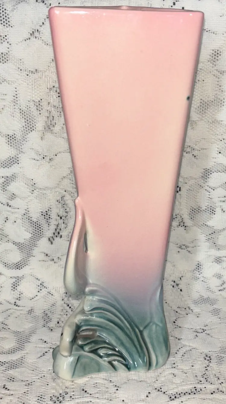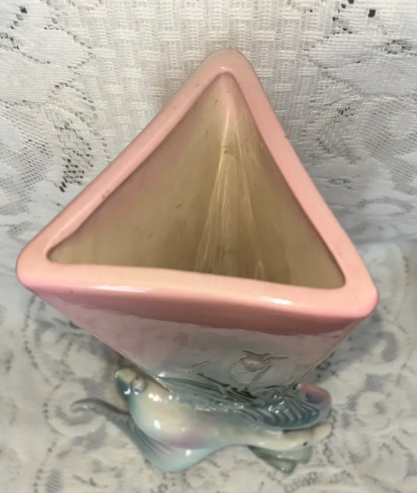 This Vintage Hull Pottery Vase features a unique design of a triangular vase with a flying duck or goose with cat tails in pastel pink and green colors.