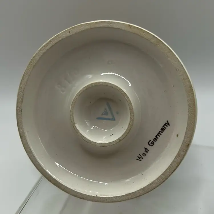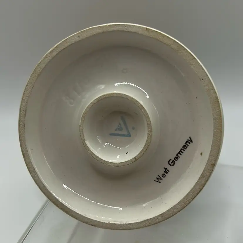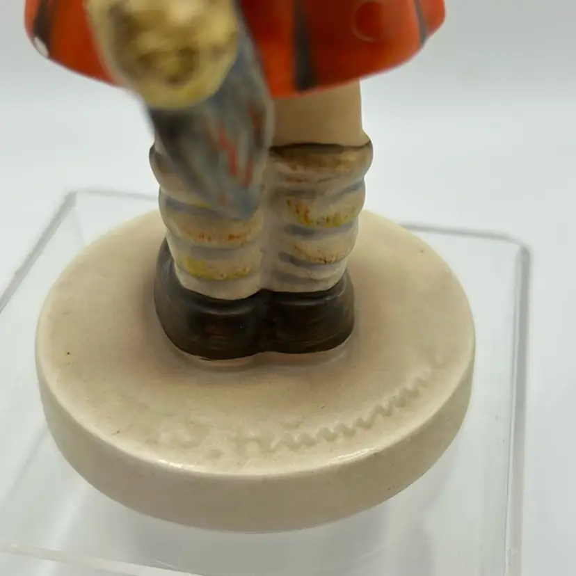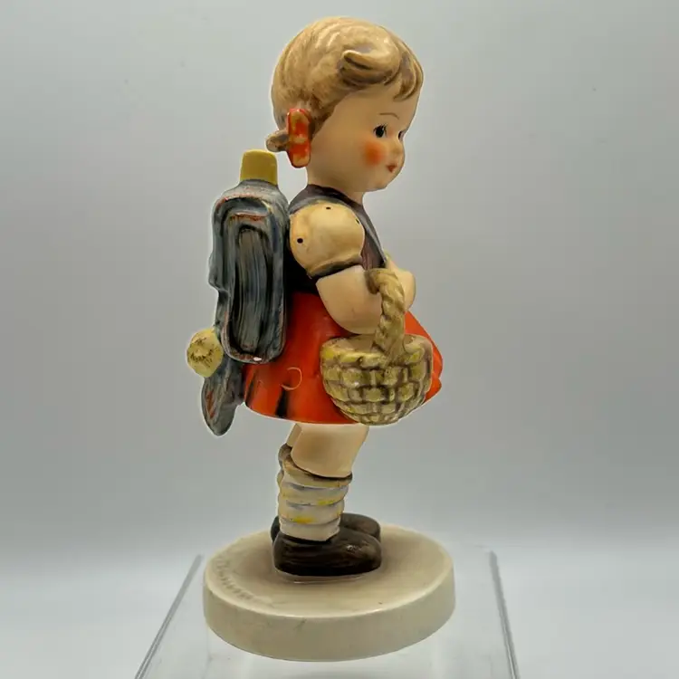 This is a humble figurine made in West Germany. This pace is entitled school girl. She stands 5 inches tall and about 2 1/2 inches wide. She does have three small condition issues. She has a paint scuff on the corner of her backpack, the left-hand side of her dress, and the most significant one is on the back of the bow on her left-hand side. None of these blemishes can be seen from the front.