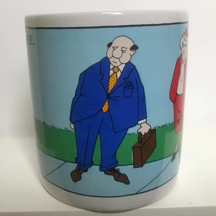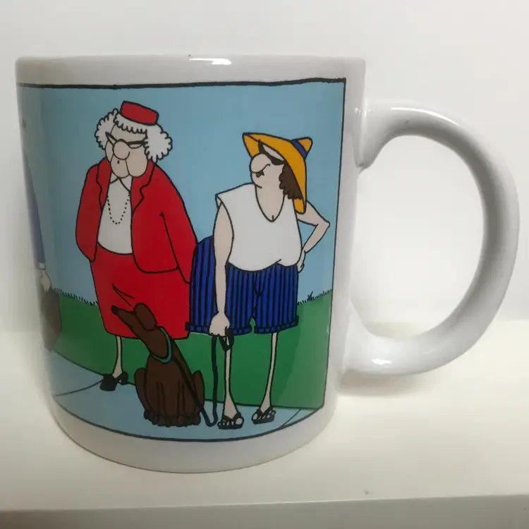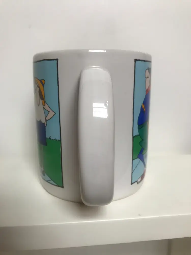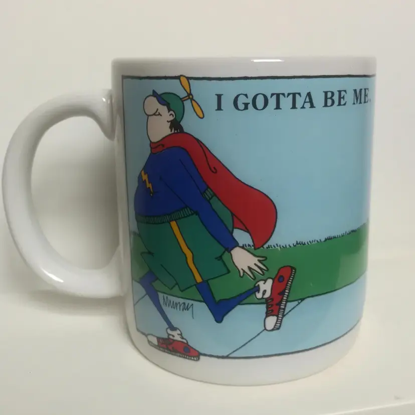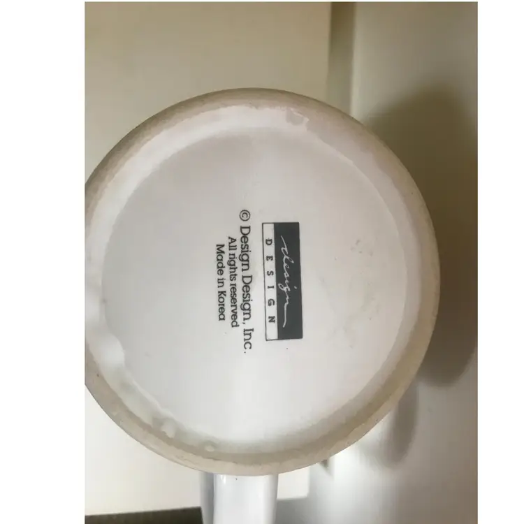 This is a mug by Design Design Inc., made in Korea with a goofy guy cartoon on it. No chips or cracks.