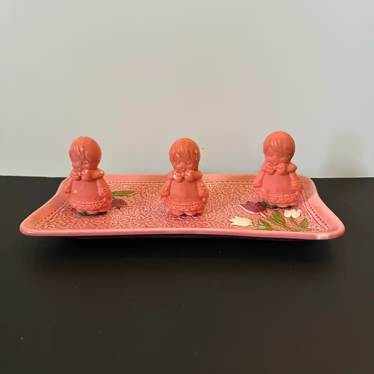 This is a vintage porcelain trinket dish imported by I.W. Rice & Co. Made in Japan. Collectible ceramic trinket box. Three vintage Avon soaps in a vintage card box.