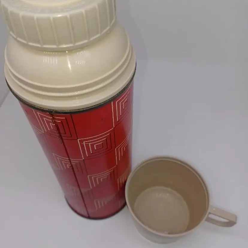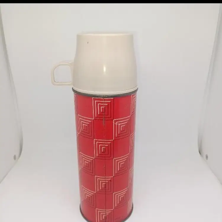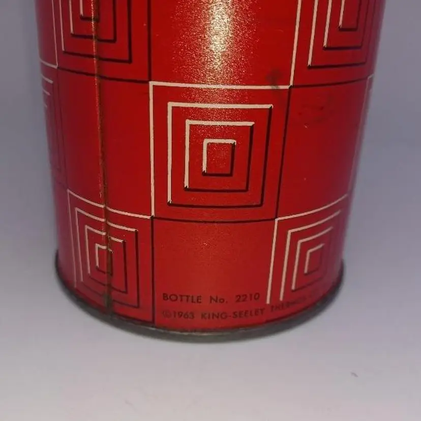THIS IS A GREAT ICONIC THERMOS BRAND QUART THERMOS. IT HAS A GREAT VINTAGE MID-CENTURY GEOMETRIC MOTIF.