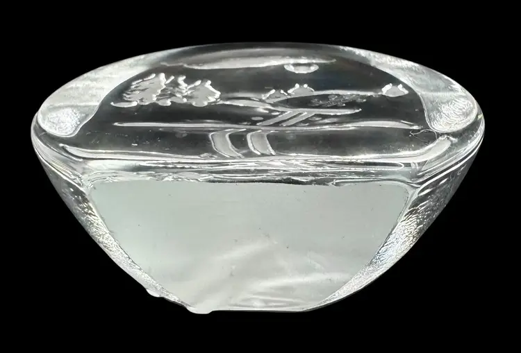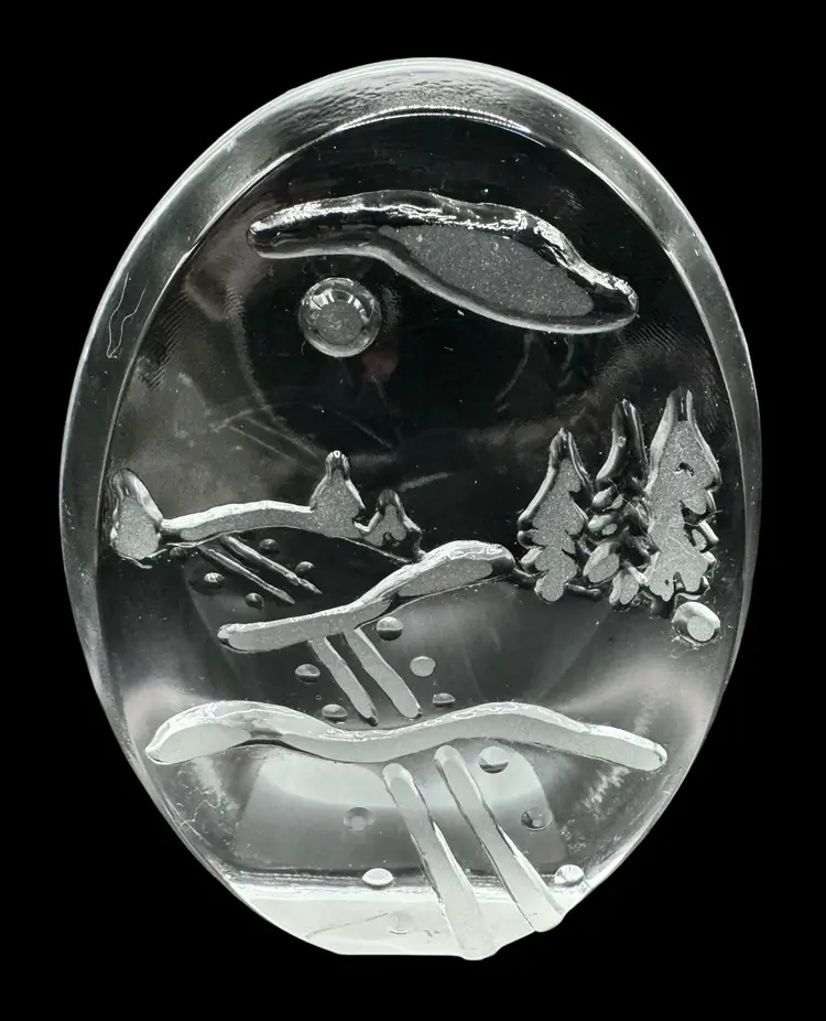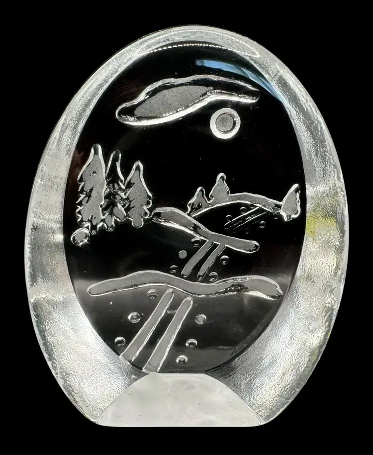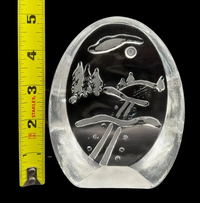Vintage Iittala Clear Art Glass Paperweight Latu Ski Trail Slope Winter Snow 5”