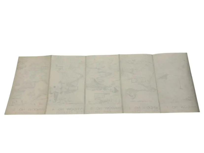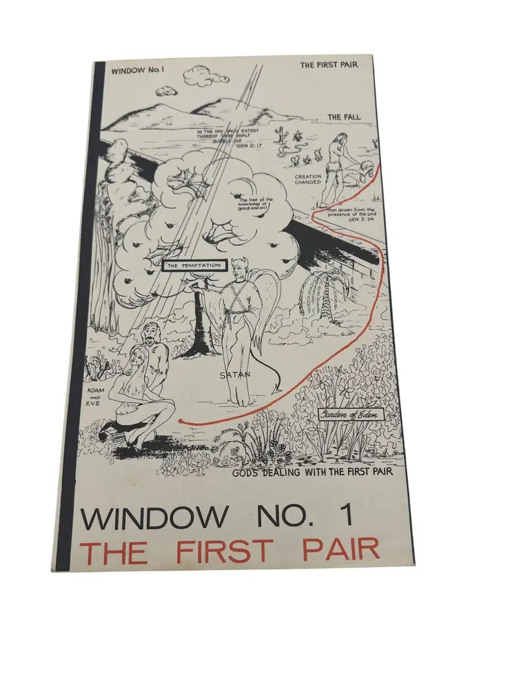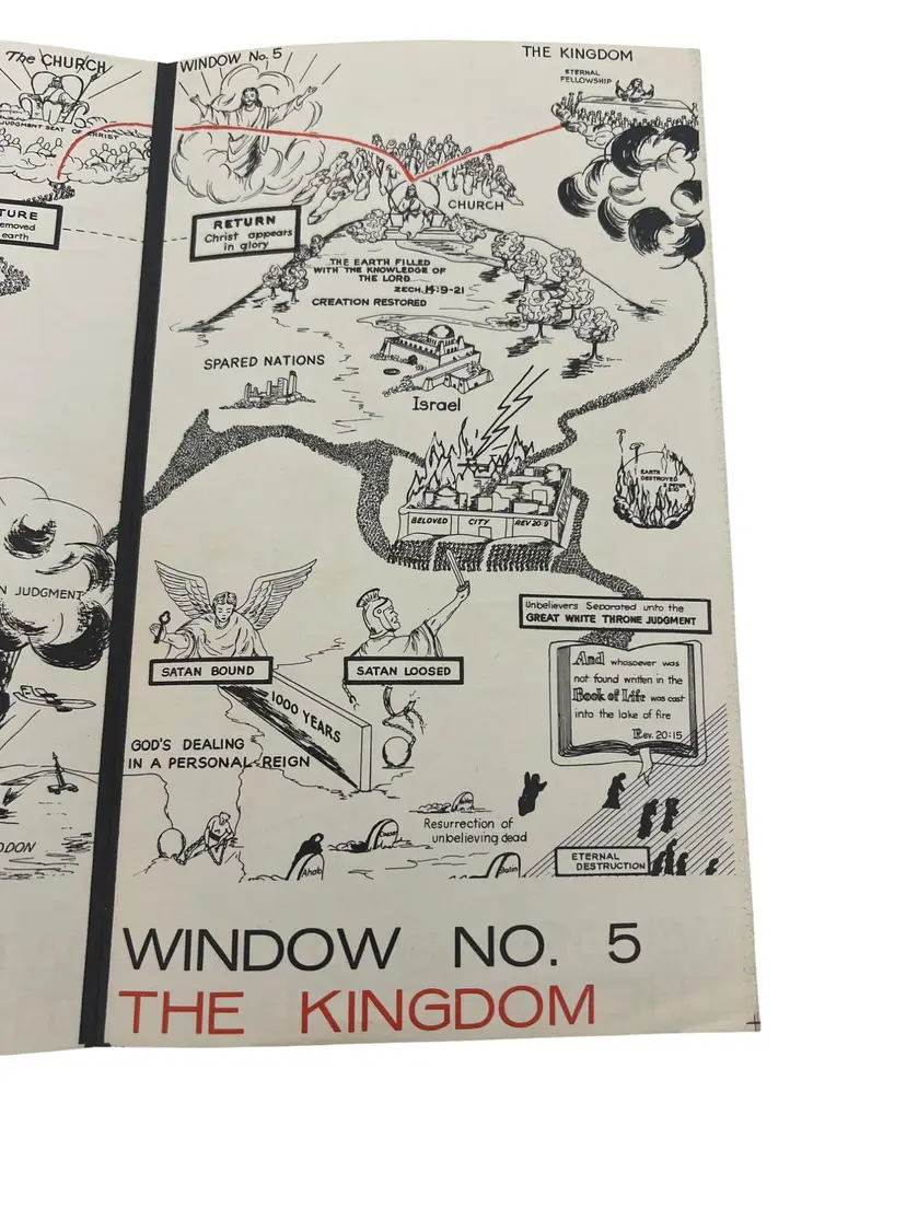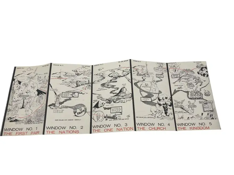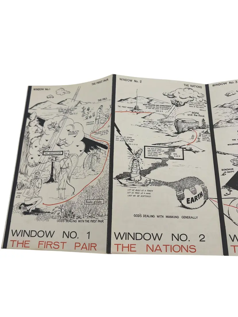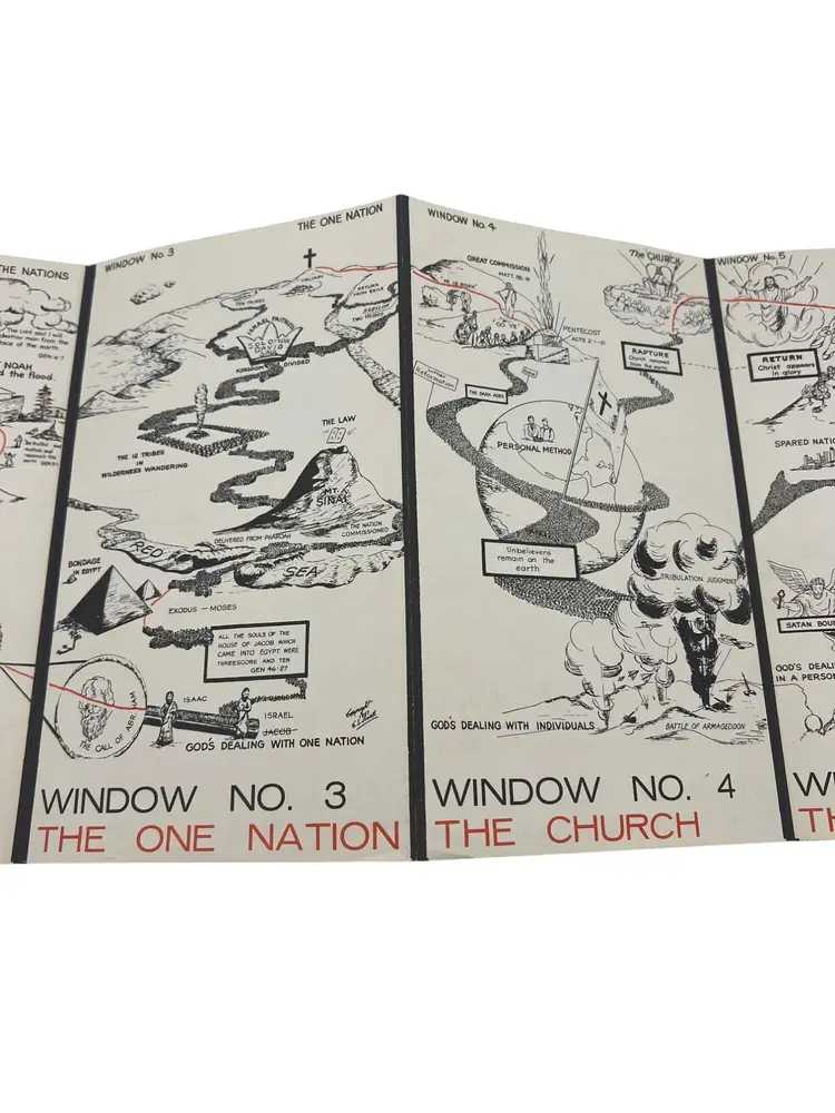 This illustrated fold-out pamphlet dealing with the Five Windows of Biblical Prophecy offers a unique, visual exploration of prophecy interpretations from The Bible. It measures 22" x 7..5" when unfolded. There are no markings to indicate age or maker but it appears to be vintage.