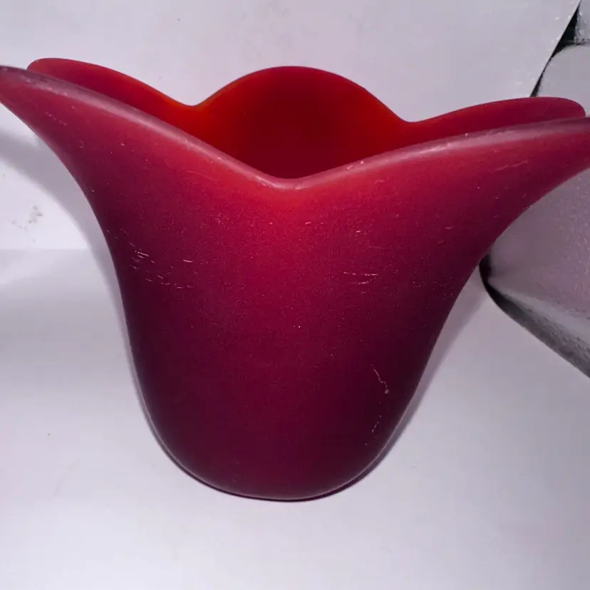 Transform your space with the exquisite Vintage iM Glass Portugal Red Frosted Glass Candle Votive Holder. Handcrafted by skilled artisans, this stunning piece adds a touch of elegance to any room while creating a warm and inviting ambiance. The rich red hue and delicate frosted finish beautifully diffuse candlelight, enhancing your relaxation experience. Perfect for romantic dinners, cozy nights in, or as a thoughtful gift, this votive holder is a versatile addition to your home décor. Its unique design effortlessly complements both modern and traditional settings. Smoke Free Home.