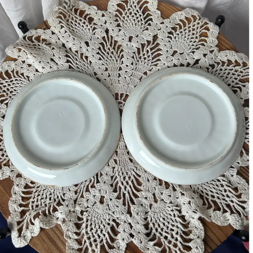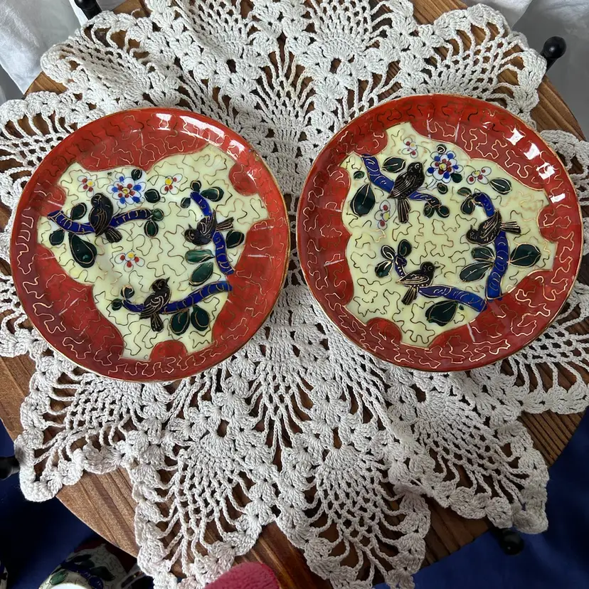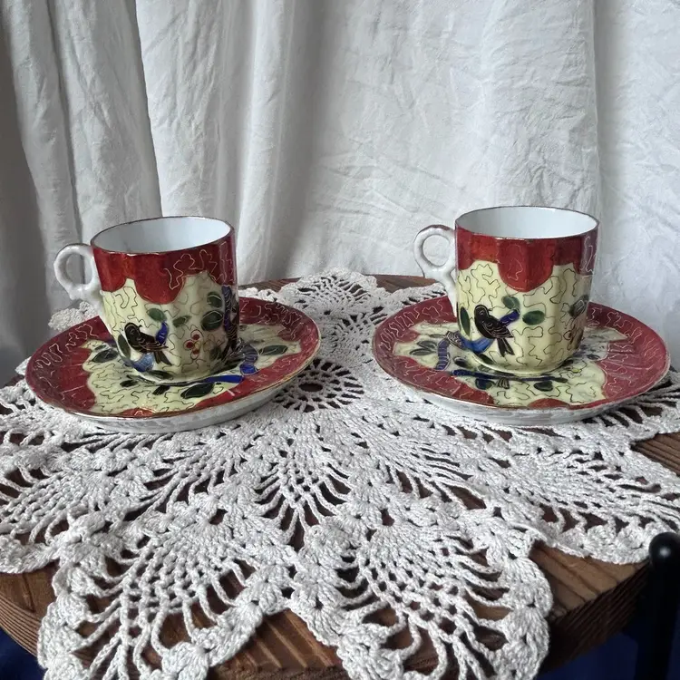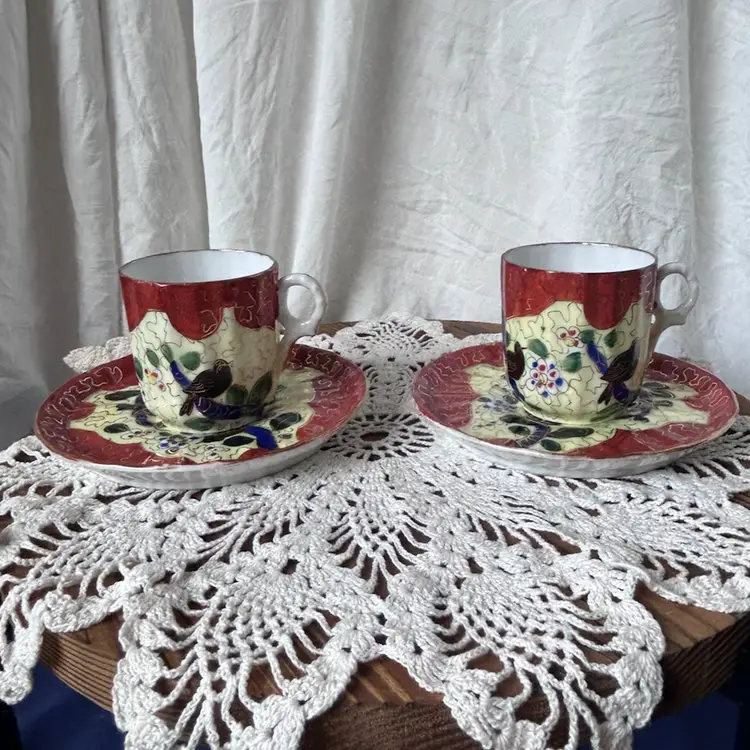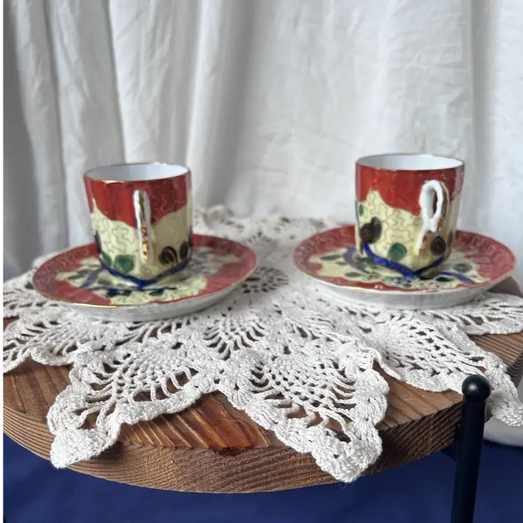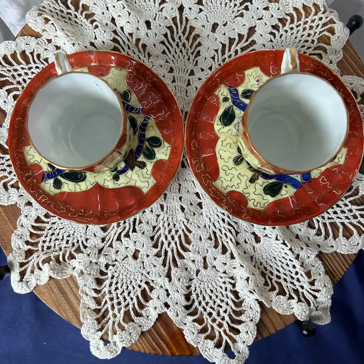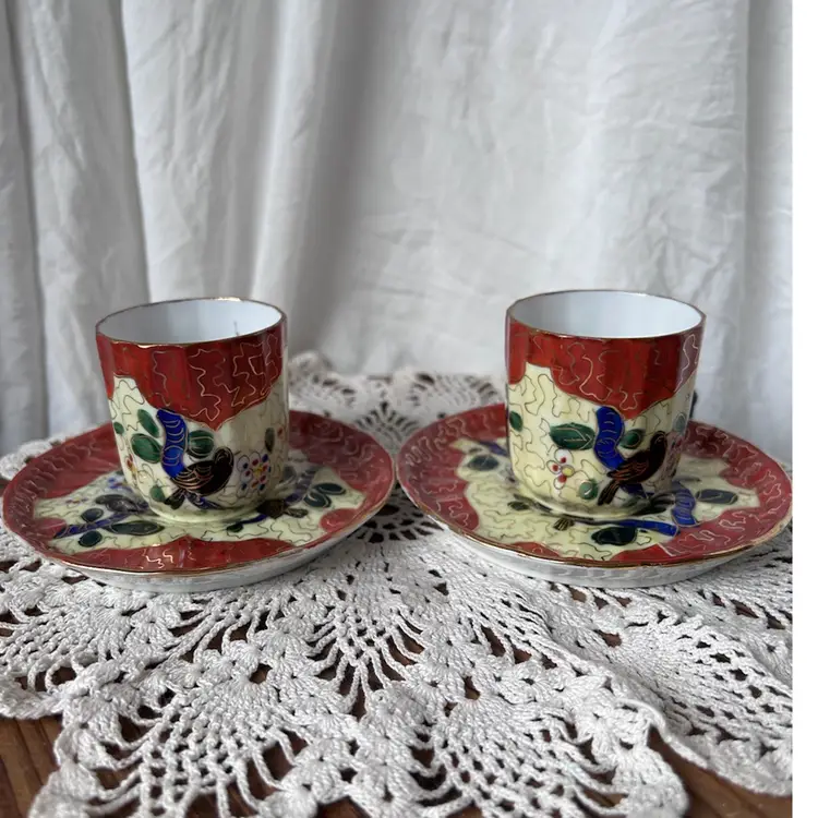 Made of bone china, hand painted to look like cloisonne, and has gold guild. Some of the gold has worn off around the edges of the saucers but no other flaws. Cup measures 2.5” tall by 2.25” in diameter and saucer measures 5” in diameter.
