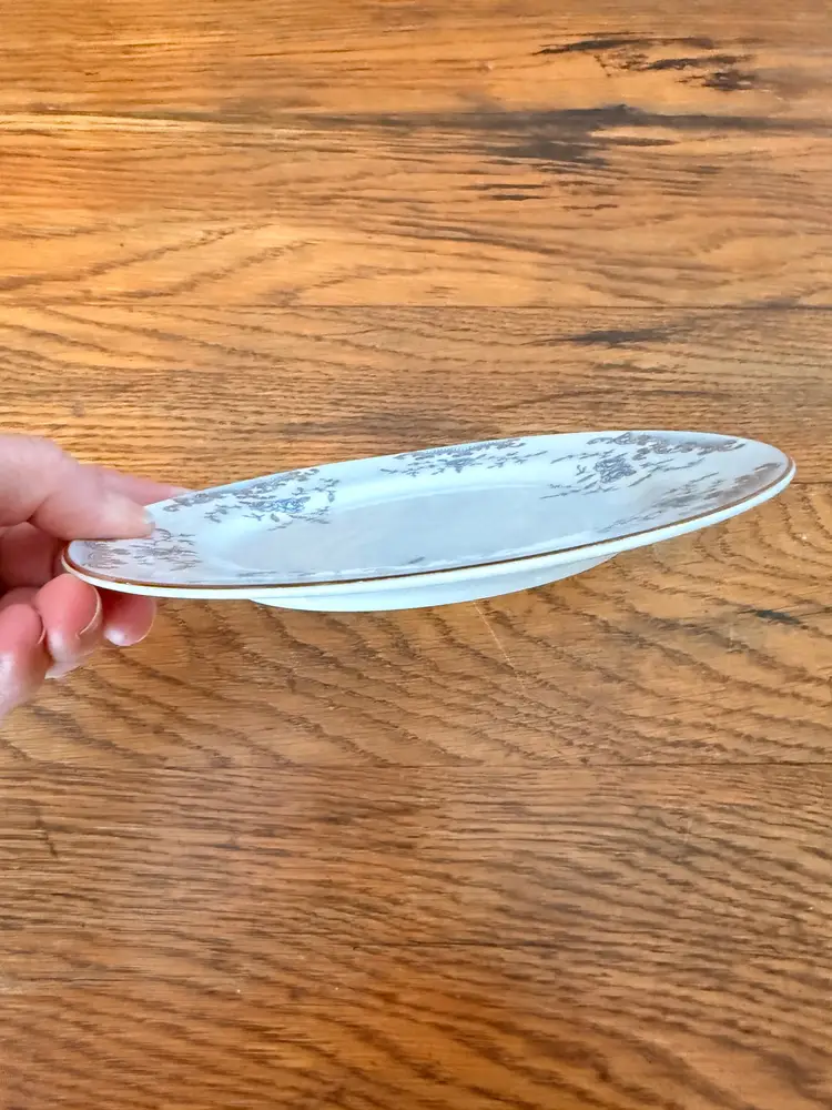 DETAILS Maker: Imperial China Designer: Ed Dutton Pattern: Seville Pattern Number: 5303 Origin: Made in Japan Era: Mid-Century (circa 1950s–1960s) Diameter: Approx. 6.5 inches Material: Porcelain Color: White with blue floral design, gray scrollwork, gold trim Quantity: 1 plate