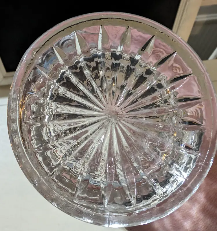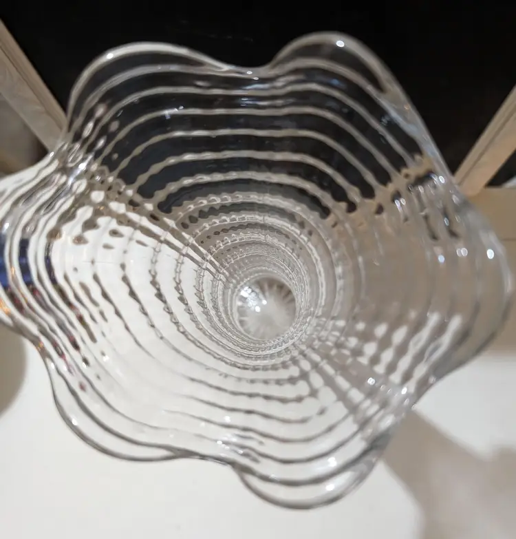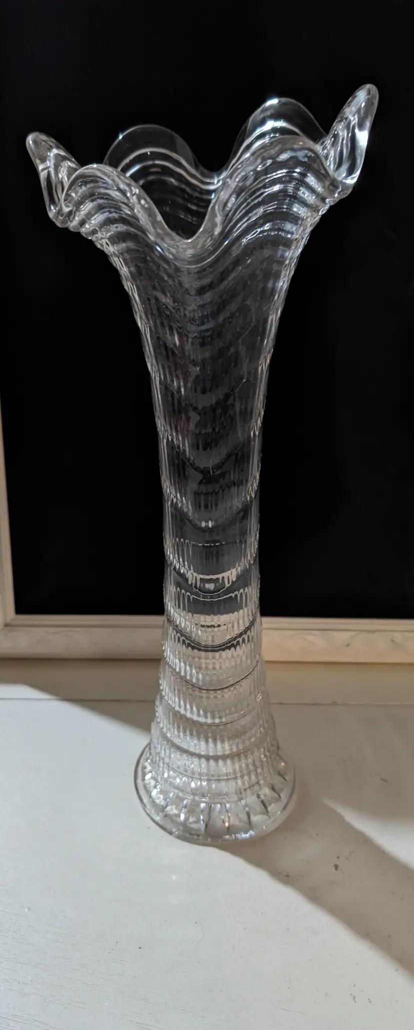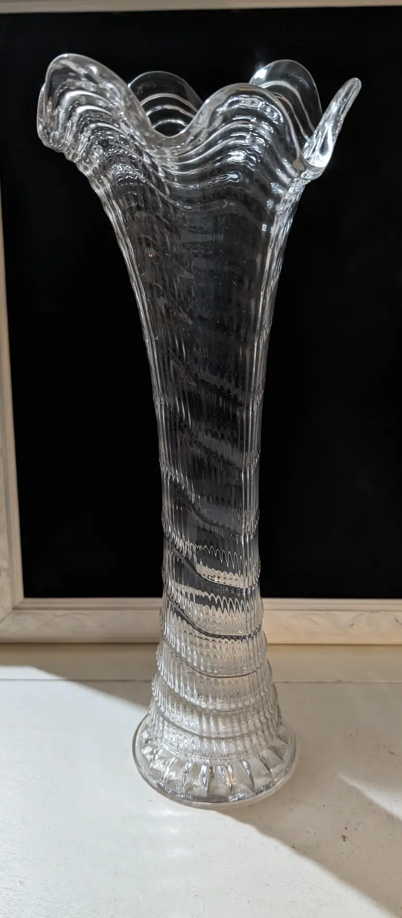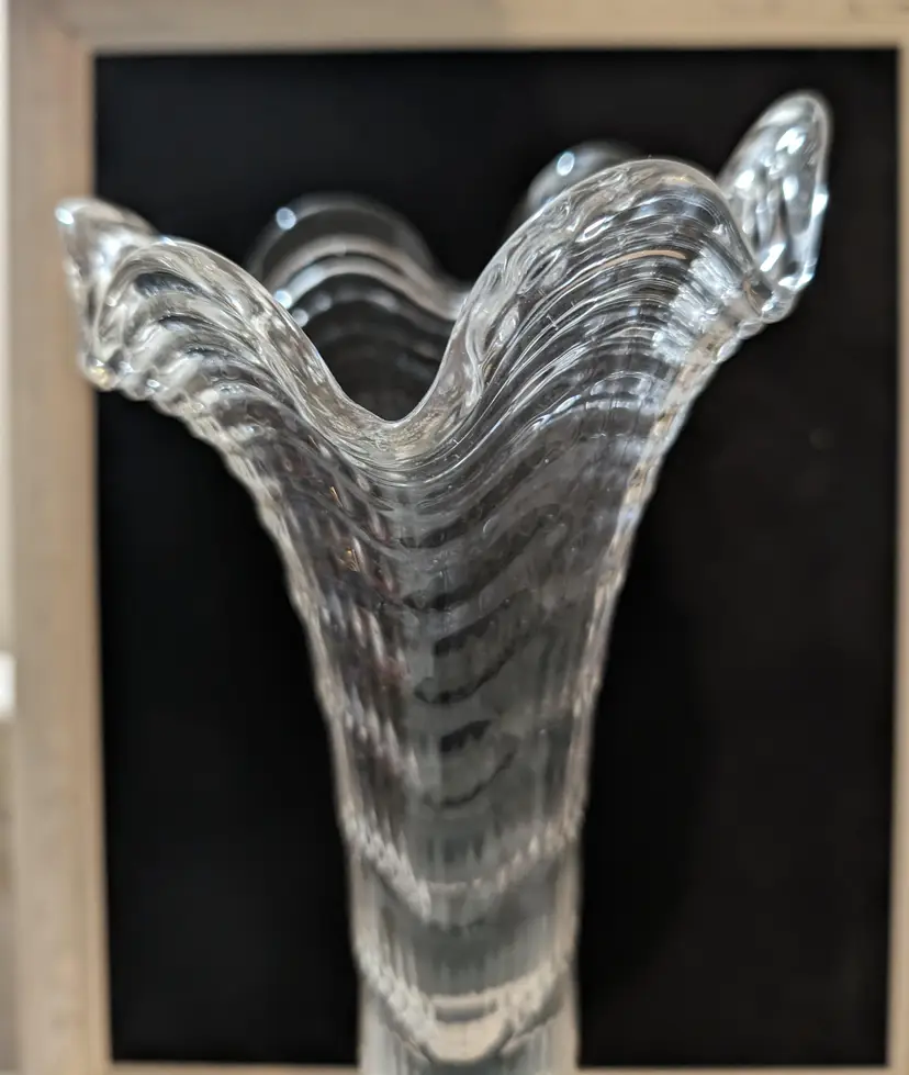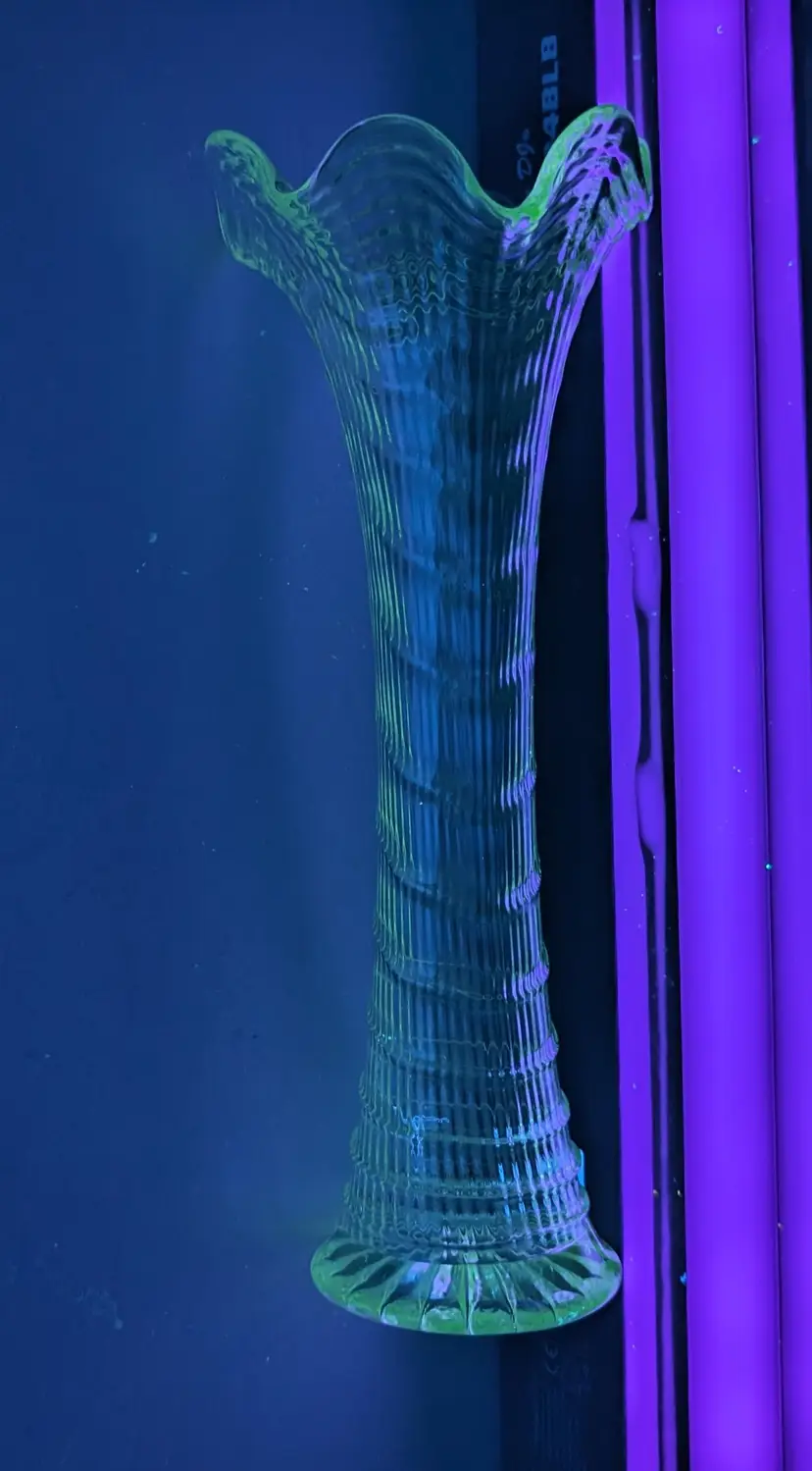 Beautiful Imperial Ripple and Ribbon Clear Glass Swung Vase. Piece is used but is in Amazing condition with no cracks or chips and Glows under UV light. Vase is approximately 13 inches height with a 5 inch width at top of vase and 4 inches width at bottom and weights 1.2 lbs. Beautiful and elegant look piece that is perfect for display any floral arrangement.