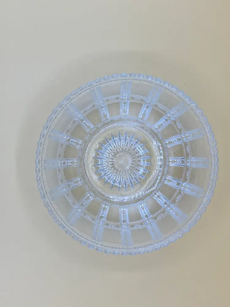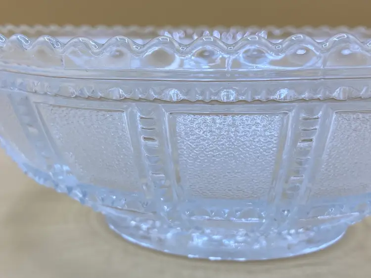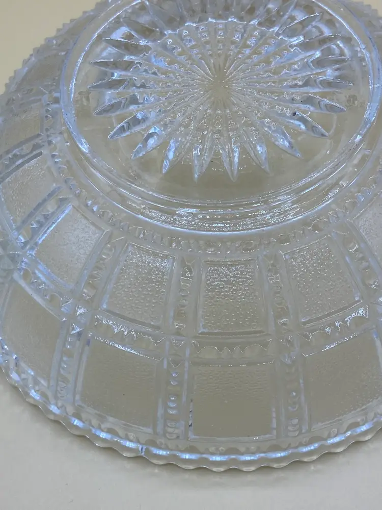 2.5” height, approximately 7” diameter. Small crack at the base of a scallop edge that is not rough- may have been done in manufacturing.