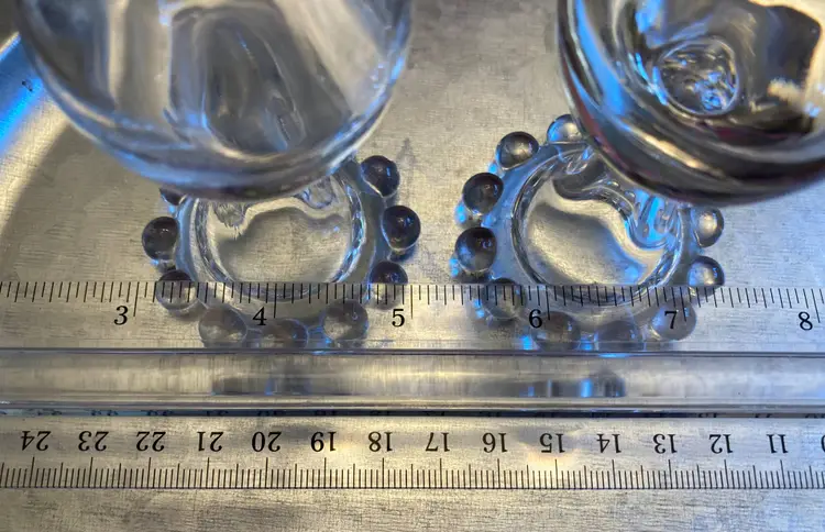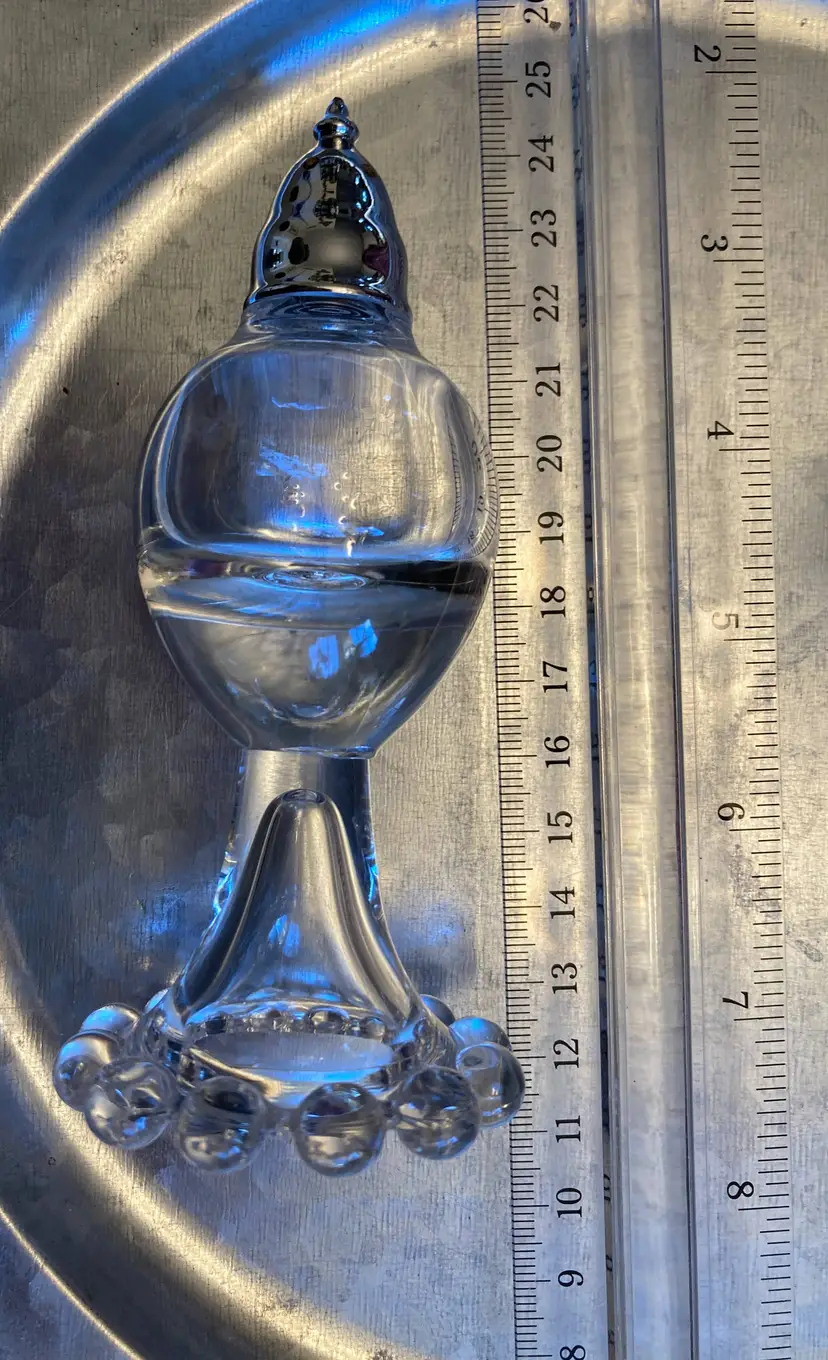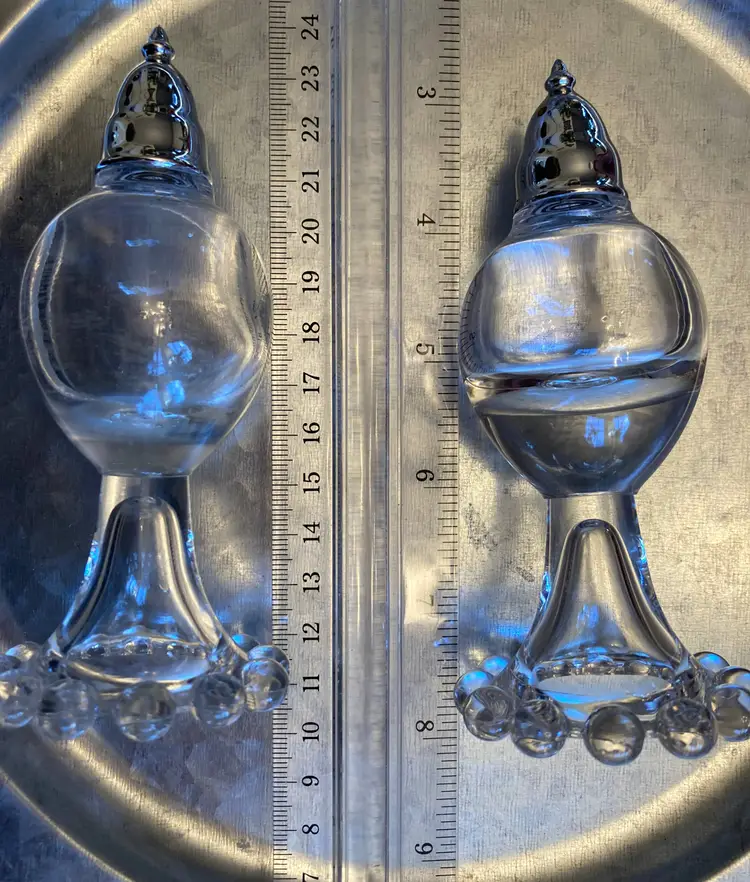 Imperial Glass Candlewick Salt & Pepper Shakers, Vintage Clear Glass Body Individual Beads applied to Base Metal Screw-on Shaker Tops Approximate 5" tall Approximate 1" in diameter at base Imperial Glass Candlewick Base - NOT Anchor Hocking Boopie Glass Due to age, there may be some flaking to the metal tops Estate Sale Find