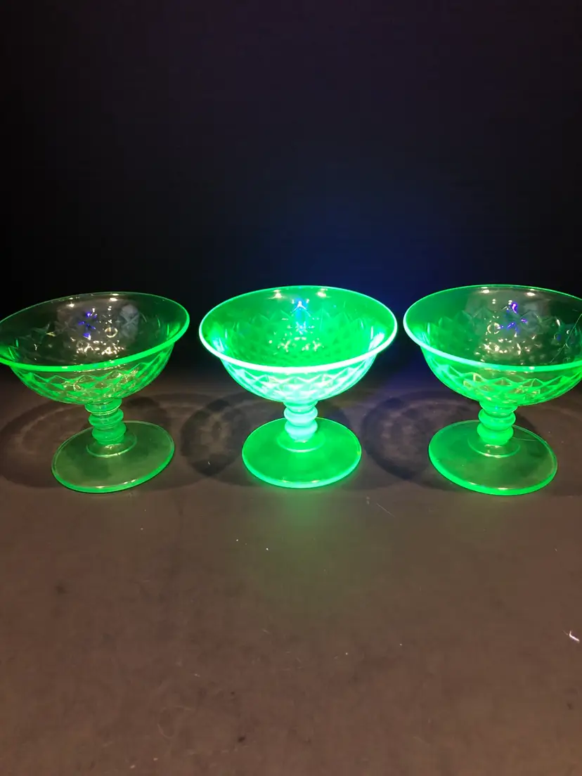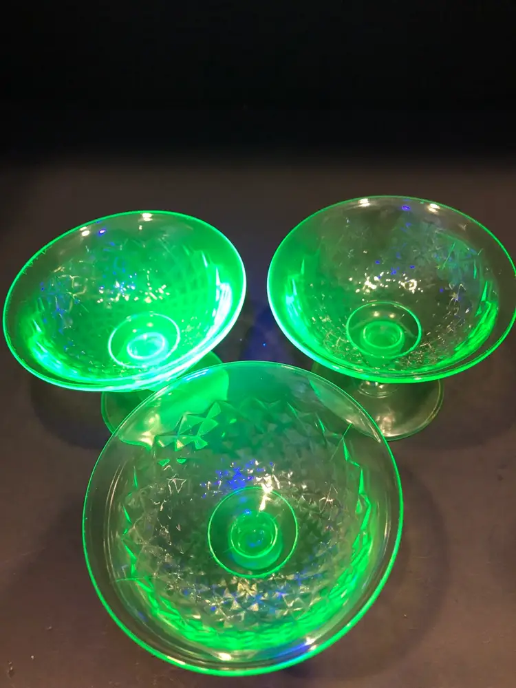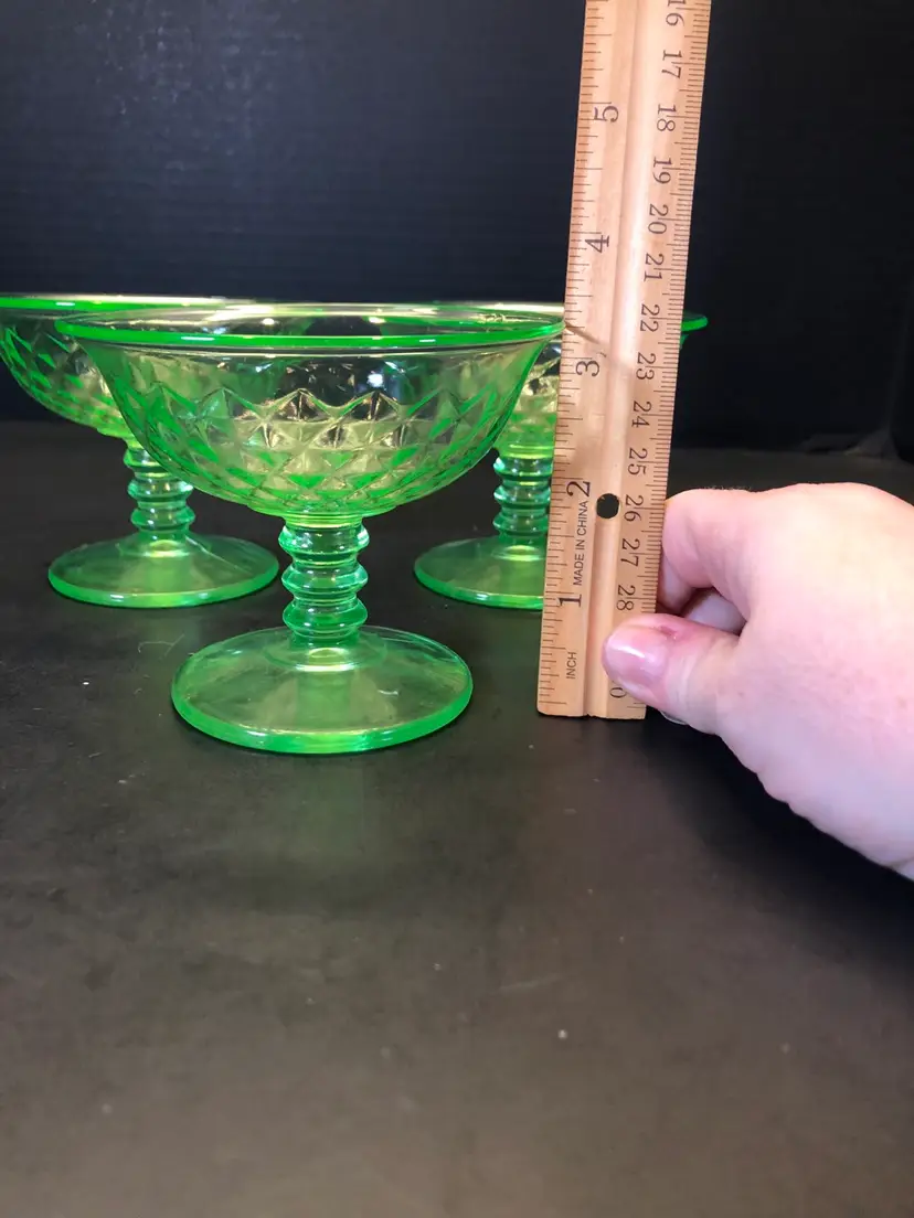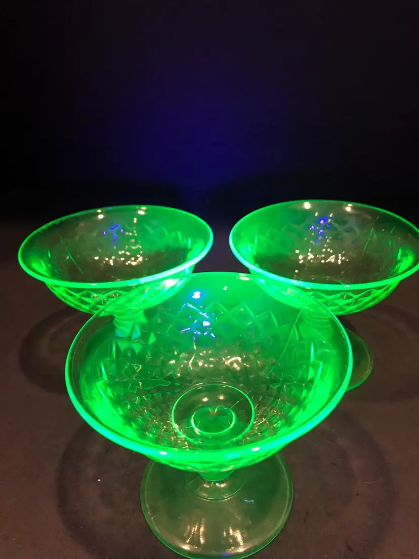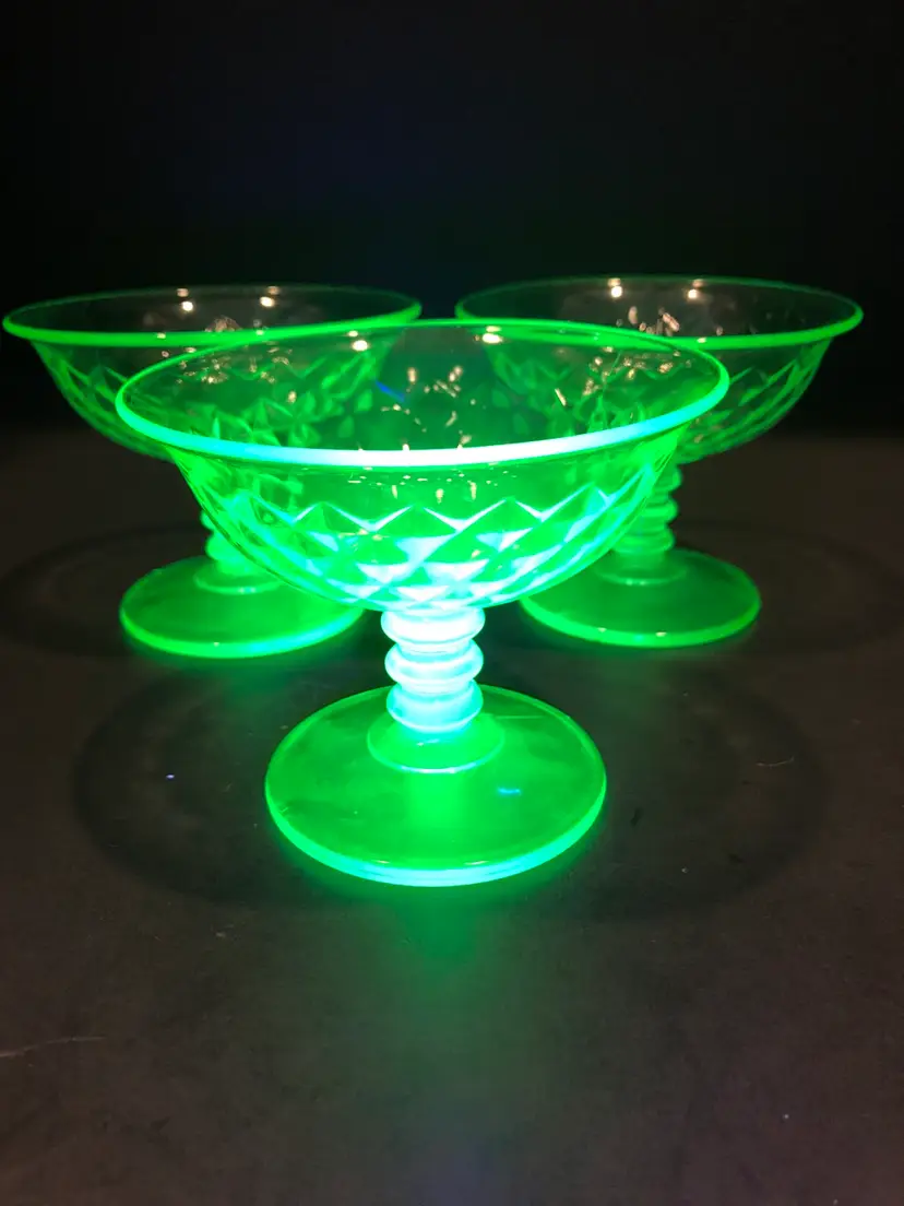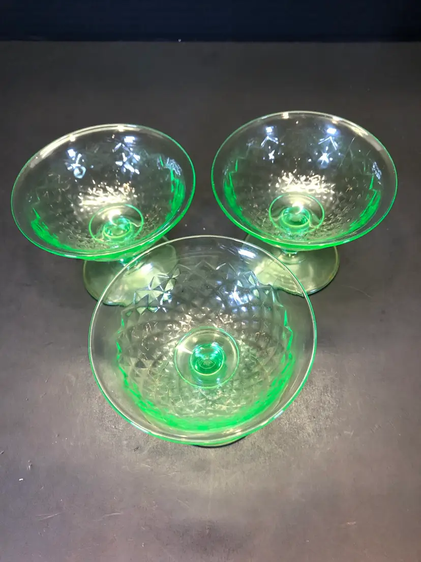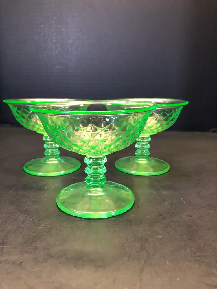 These were made by the Imperial Glass Co. They are 3 1/4 “ tall. No chips or cracks. Set of 3.