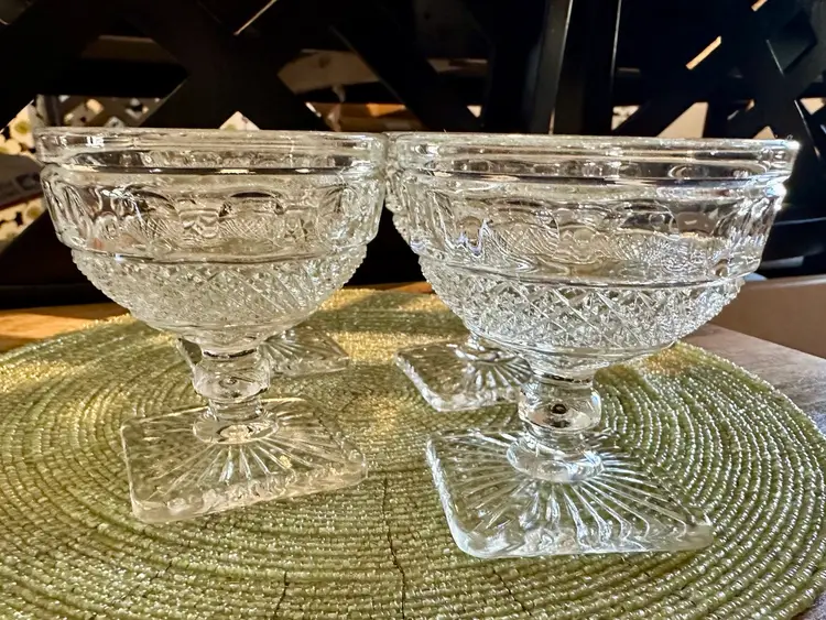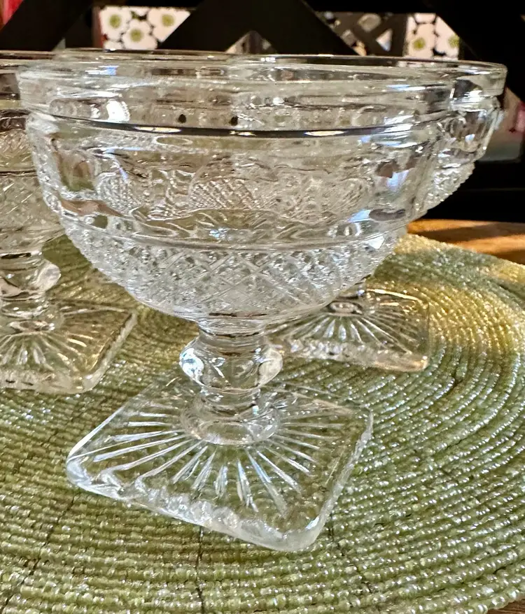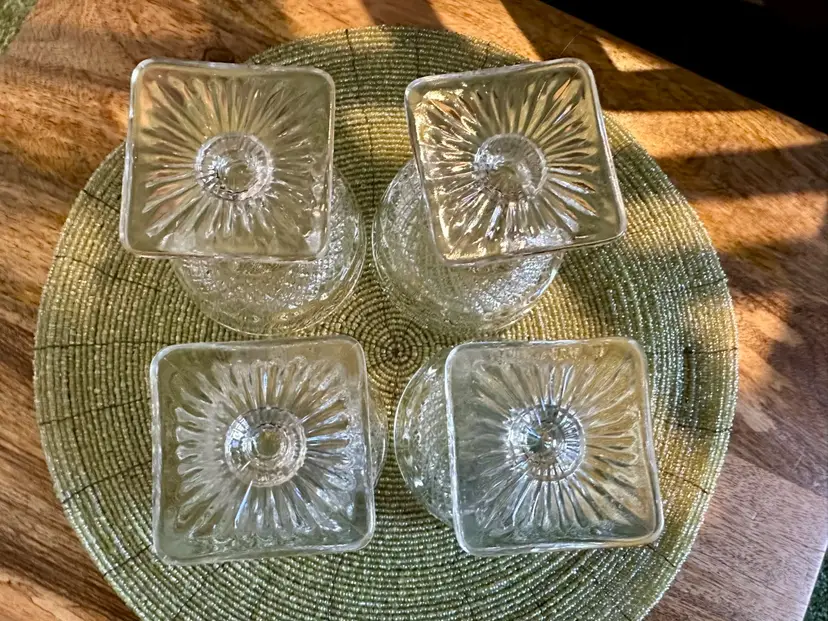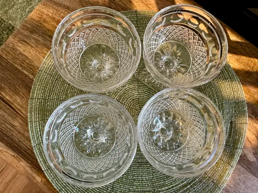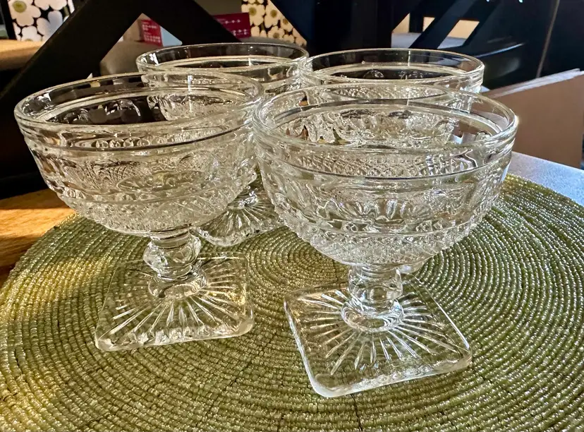 Set of 4 vintage Imperial Glass Ohio Tradition Pattern champagne sherbet glasses. These 3 1/2” tall glasses can be used for drinks or dessert, or any way you choose. These clear glasses match any color, making them a versatile addition to your collection. No cracks or chips.