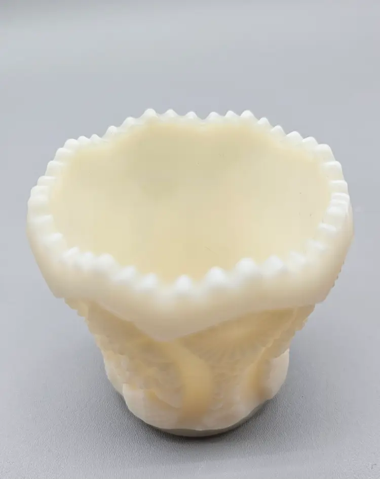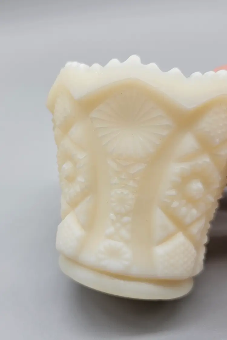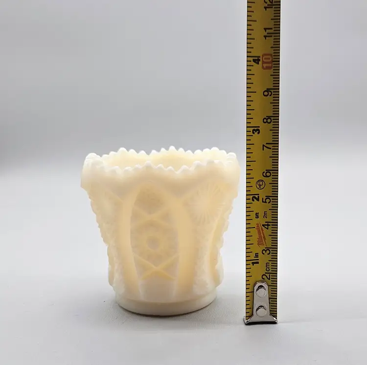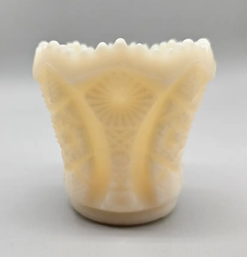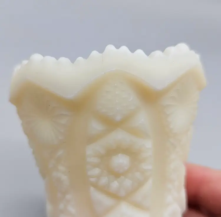 Vintage (1970's) Imperial by Lenox custard satin glass toothpick holder, in Bellaire Octagon pattern. It is in Good, Pre-owned condition. It is approximately 2 1/2" tall and 2 1/2" wide. It does show some wear and flaws due to the making and previous use (shown in photos). See all photos of description