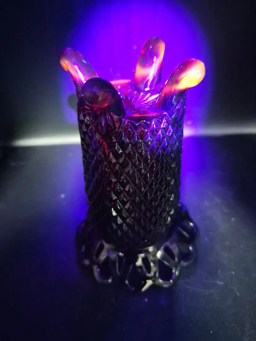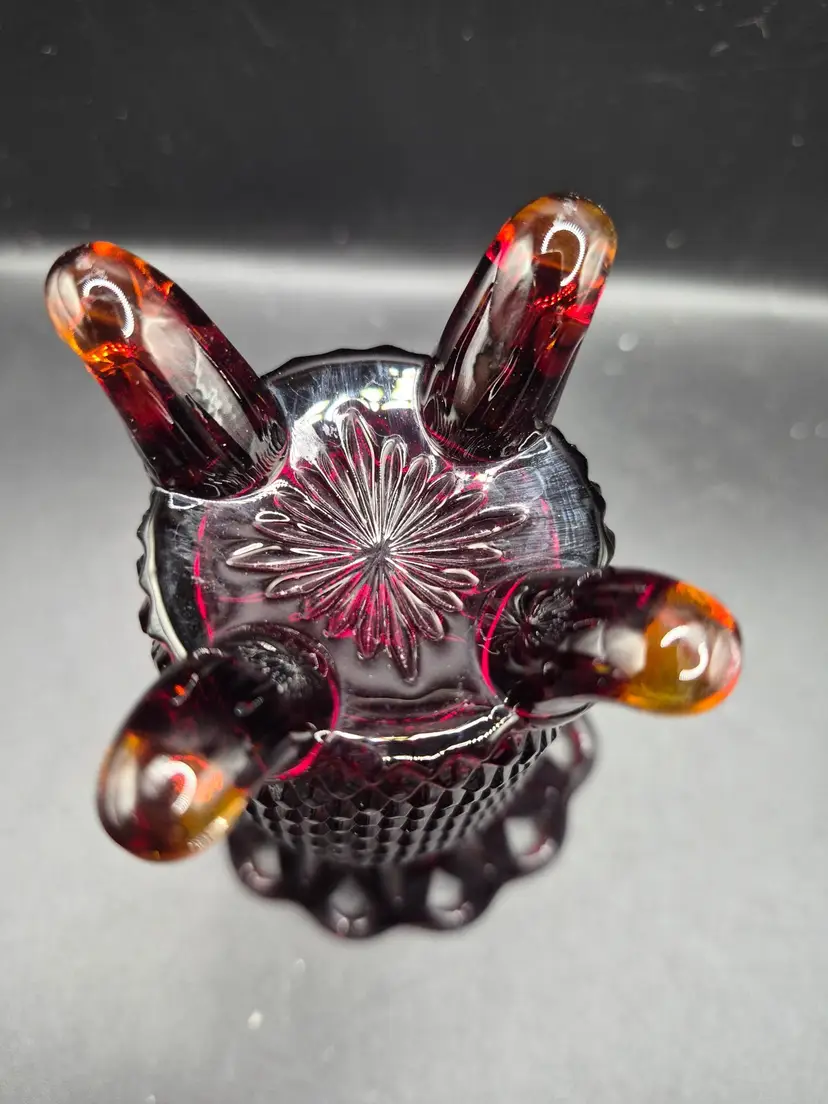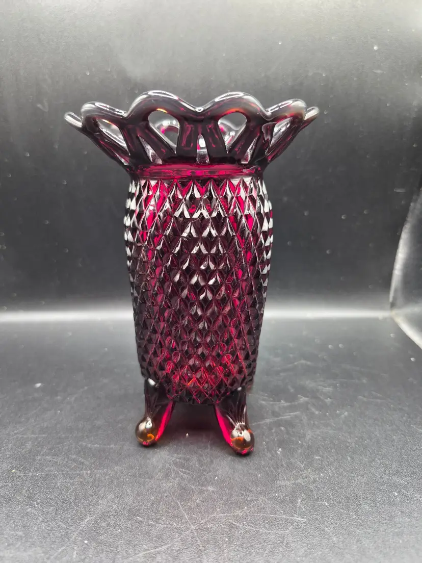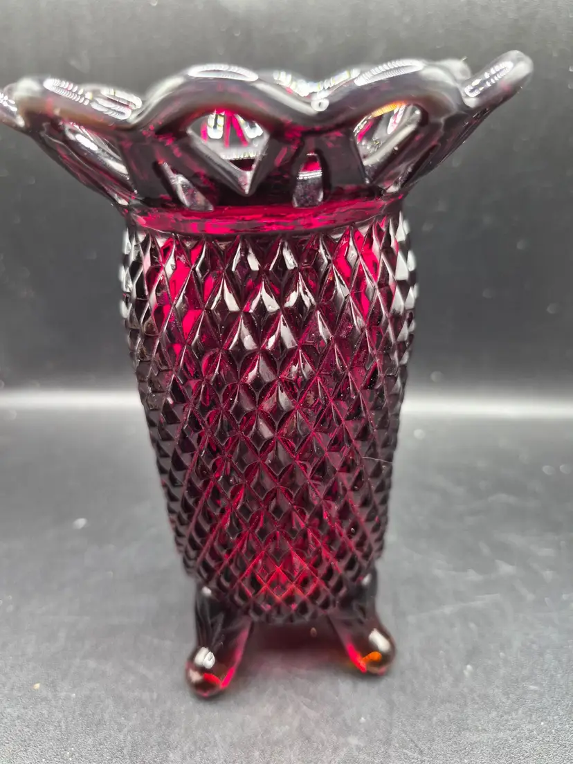 In the heart of a cozy Victorian parlor, this ruby-red vase once stood proudly, radiating its timeless charm. Its diamond-cut pattern catches every flicker of candlelight, while the delicate scalloped rim whispers of elegance. Supported by four sturdy feet, it holds not just flowers, but the essence of history and grace.