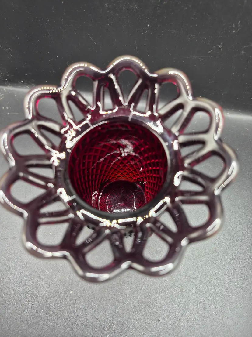 • Diamond-cut textured glass • Scalloped rim for added elegance • Four sturdy pedestal feet • Vintage collectible design • Deep ruby-red hue