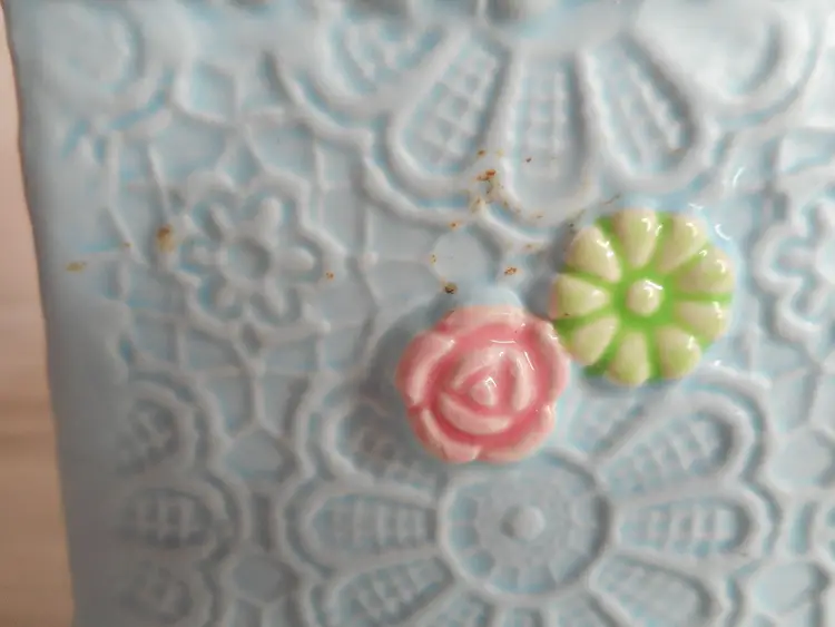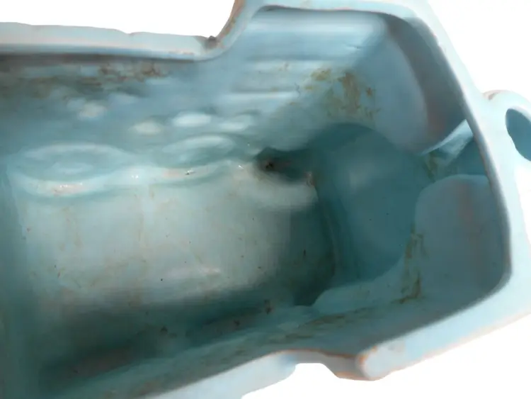 Preowned - no obvious imperfections, no cracks, chips, crazing; there is a small area of discoloration/smudging on the back, I wiped it off and it came off a bit, I think it needs a toothbrush and a little soap and water, and It may come off completely. The marks aren't obvious in any case, it has been used so there is discoloration inside that I did not try to remove and it is probably dusty in there as well.