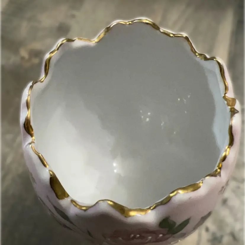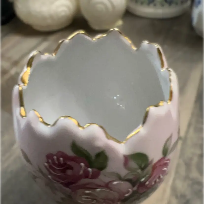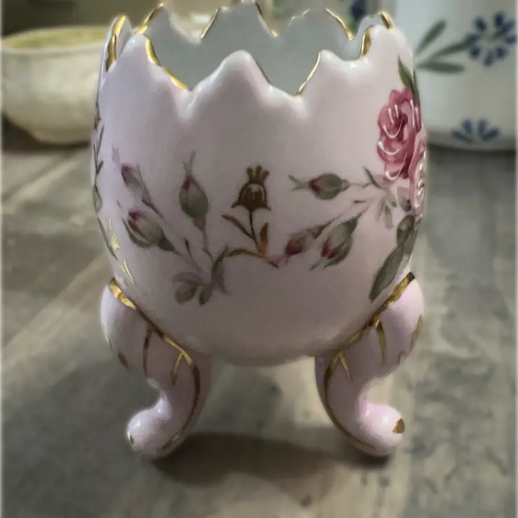 Vintage Inarco porcelain egg-shaped 3-footed vase with hand-painted roses and gold trim. 4”