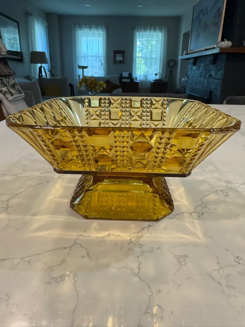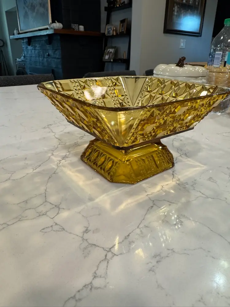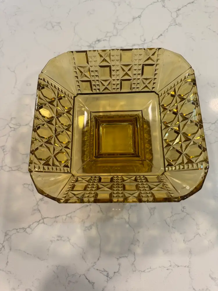 Vintage Indiana glass amber carnival glass diamond shape footed candy dish. This stunning piece features a rich amber color and an intricate diamond pattern, making it a beautiful addition to any collection. Perfect for display or serving small candies and treats. Adds a touch of vintage charm and elegance to any decor.