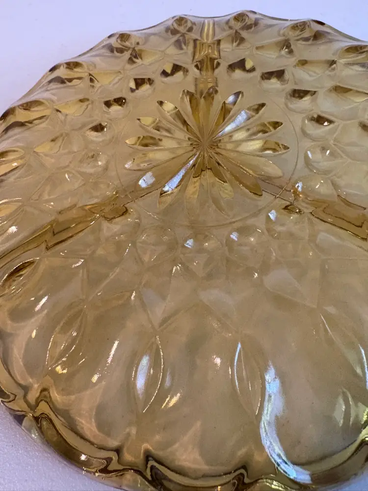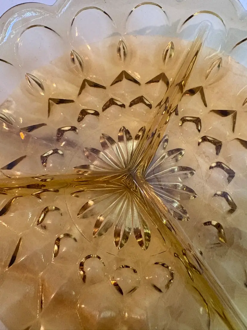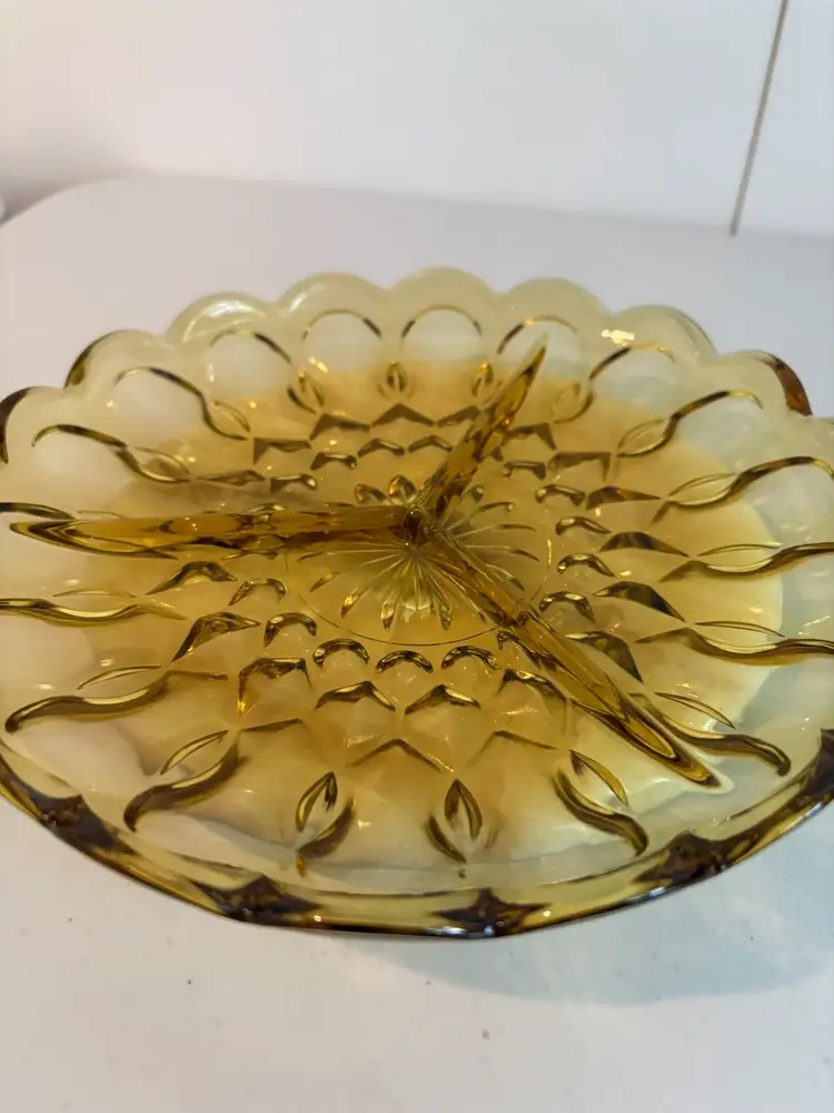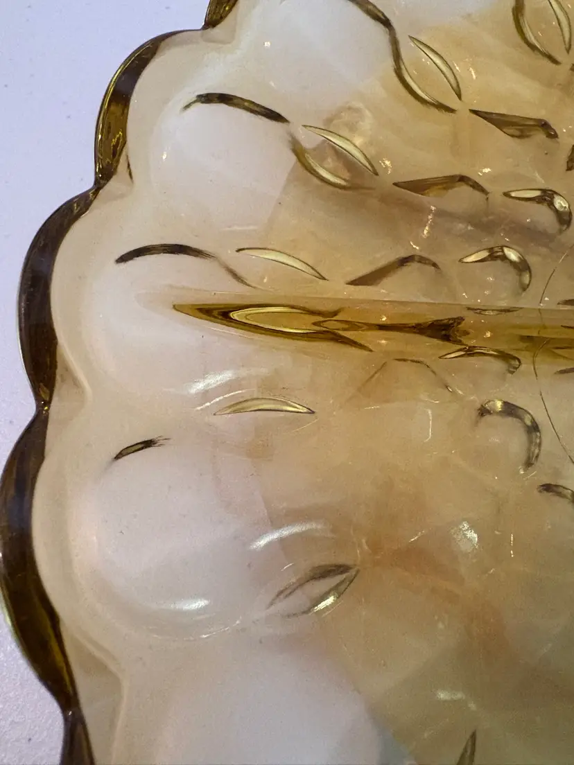 Perfect for your fall holidays. Vintage Indiana Amber Glass Serving Dish 3 Way Divided Plate Scalloped Edge. 8 1/2” across