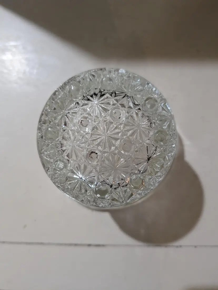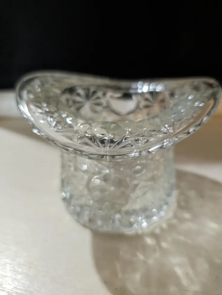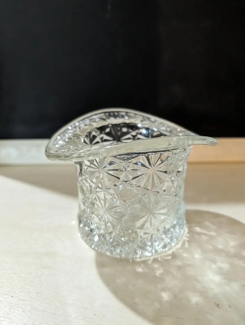 Charming vintage clear glass vase in the shape of a hat with a beautiful Daisy and Buttons pattern. This piece is used but in excellent condition with no cracks or chips. The intricate design catches the light beautifully, making it a lovely display piece for any room. The vase is approximately 3 inches in height and 4.5 inches in width and weights 9 oz. Perfect for holding small flowers or as a decorative item on its own.