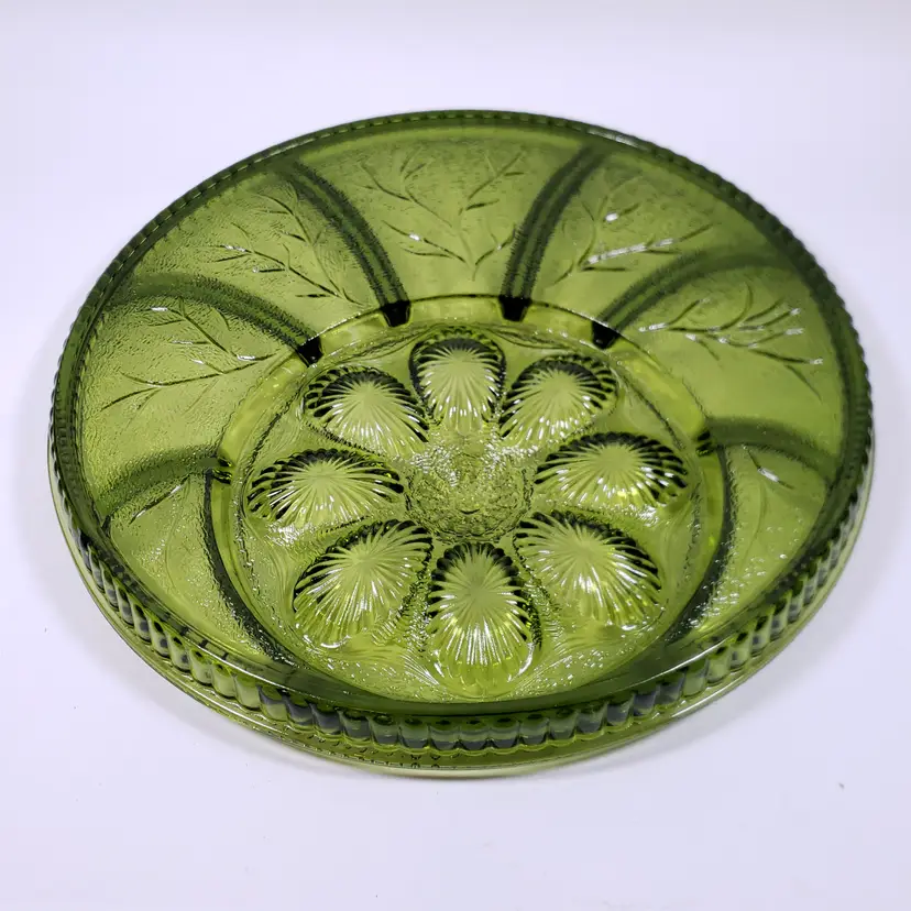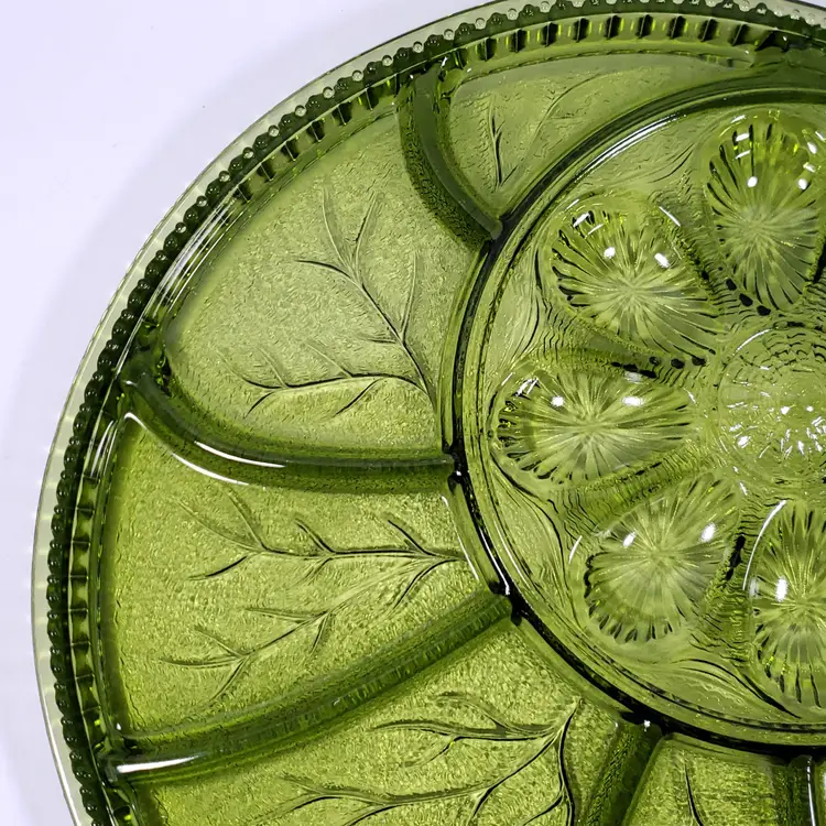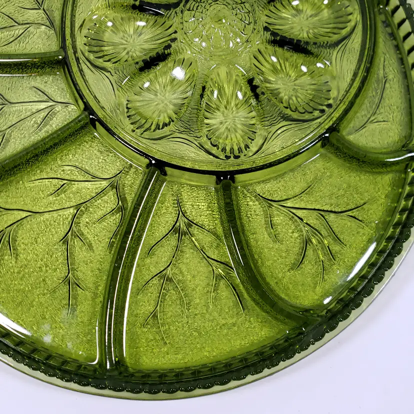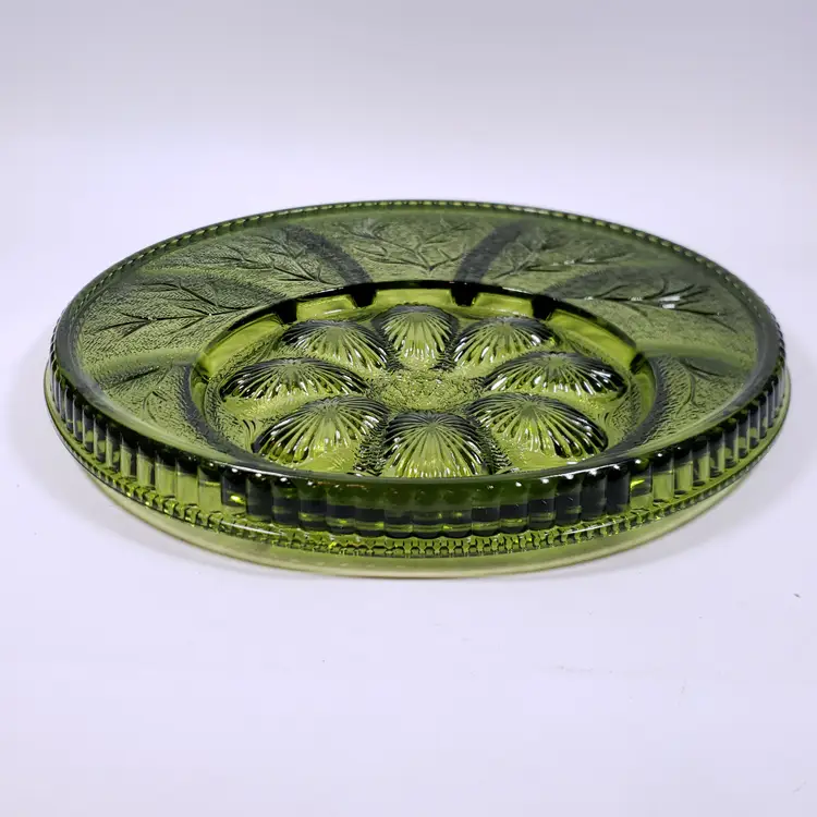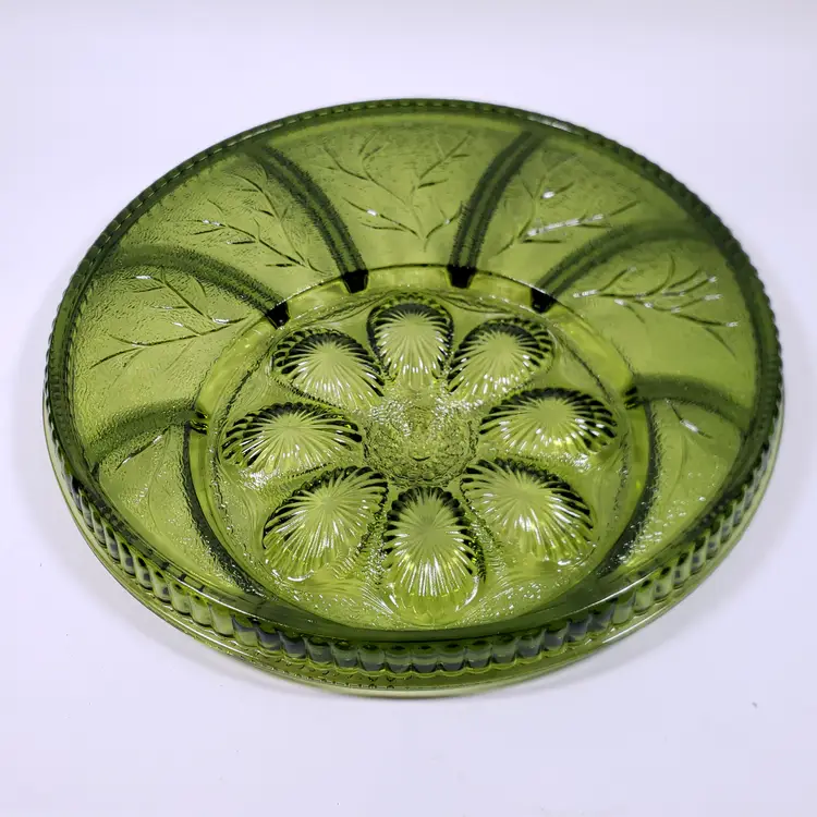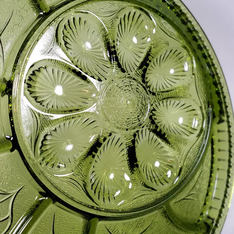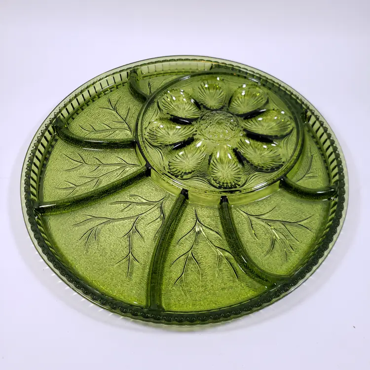 Vintage INDIANA GLASS Avocado Green Pebbled Leaf Deviled Egg Relish SERVING TRAY