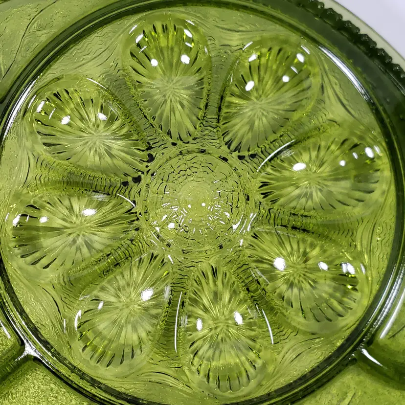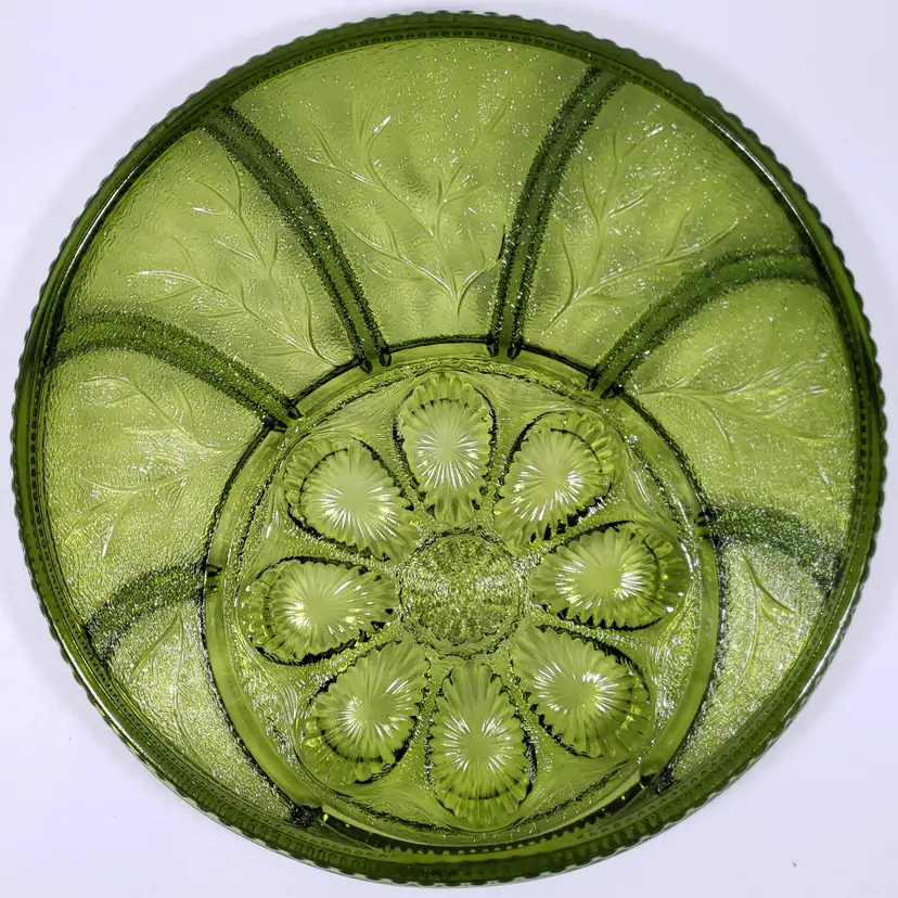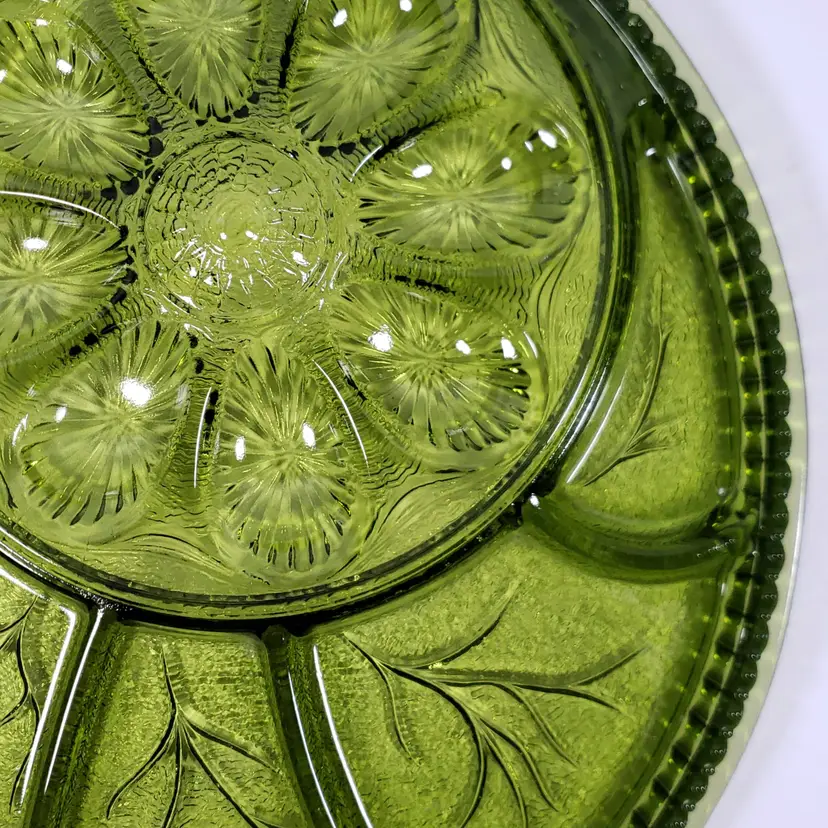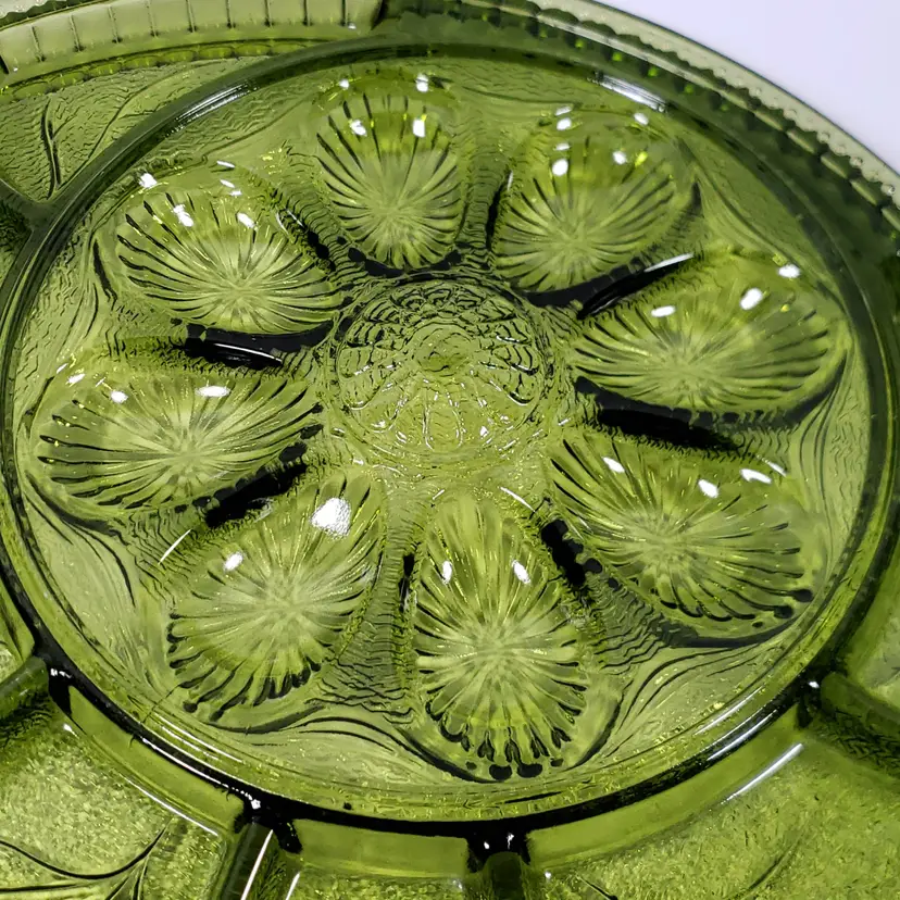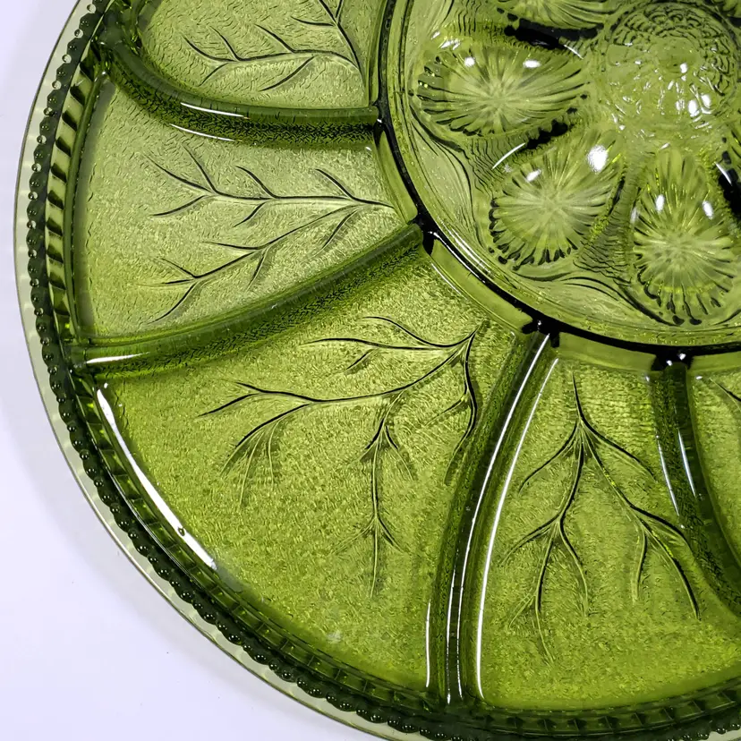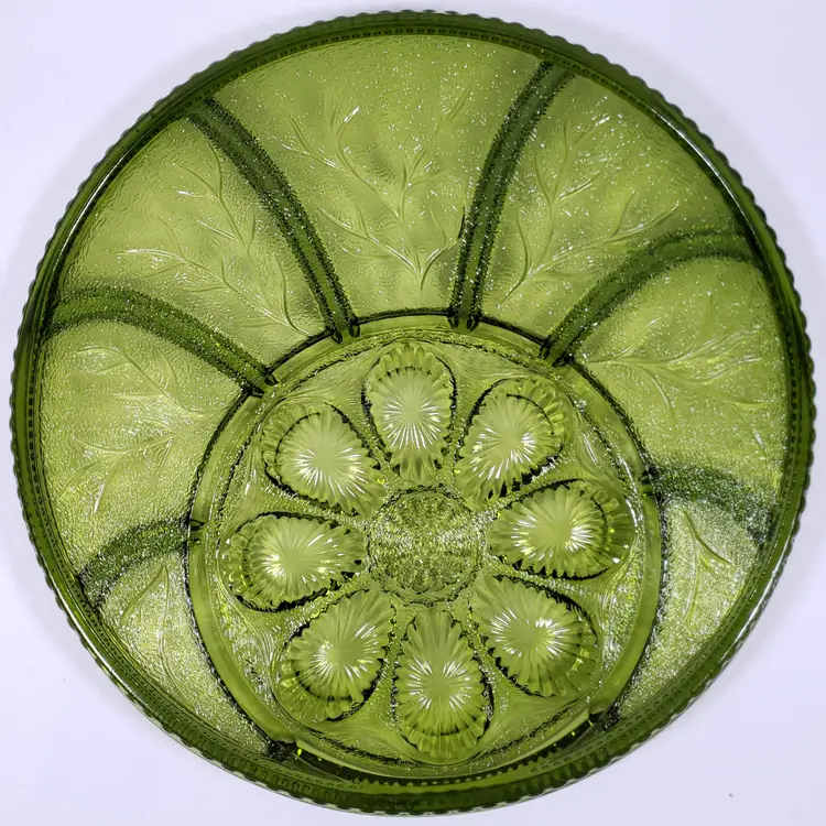 Vintage INDIANA GLASS Avocado Green Pebbled Leaf Deviled Egg Relish SERVING TRAY