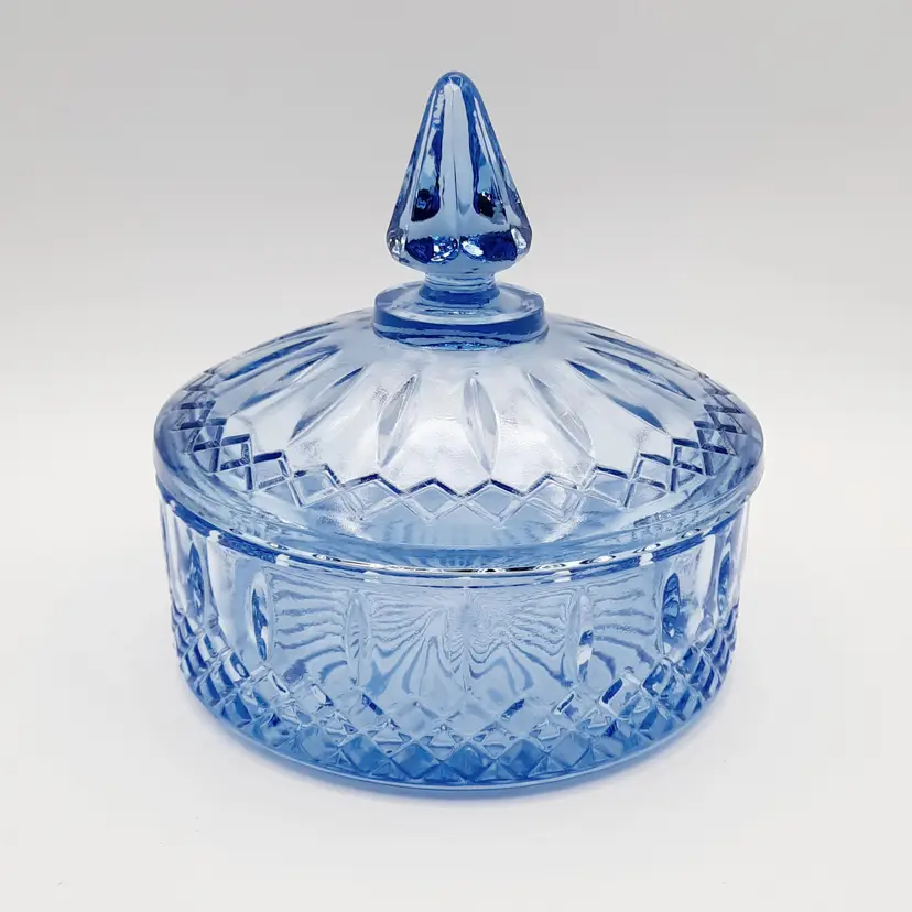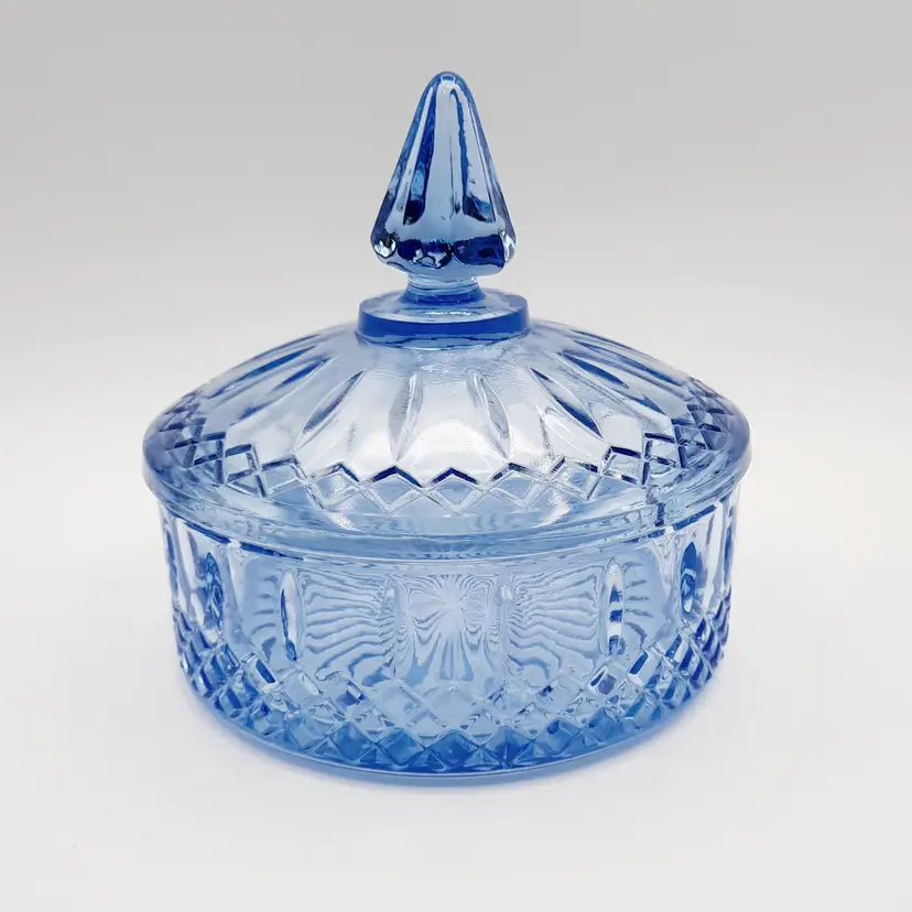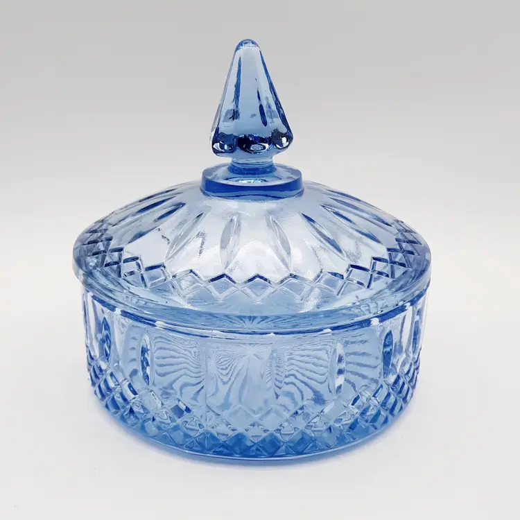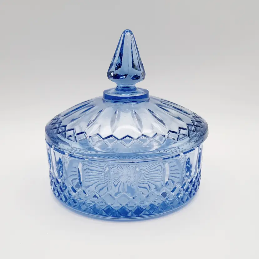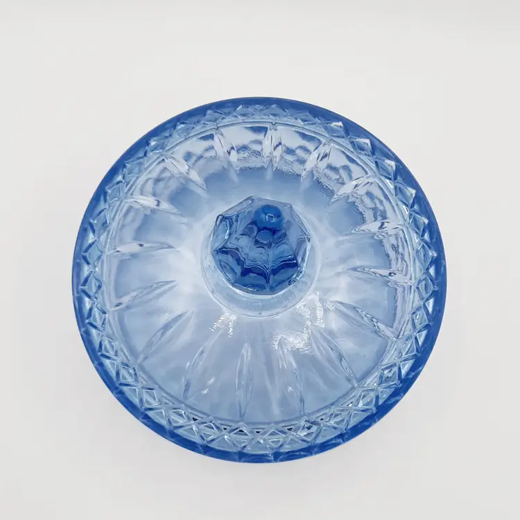 Beautiful light blue dish is 6"H x 6"W in great condition with a few small scuffs and air bubbles in glass