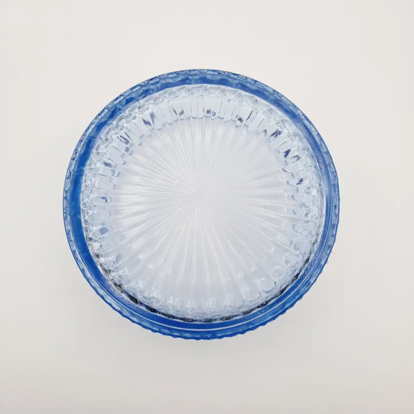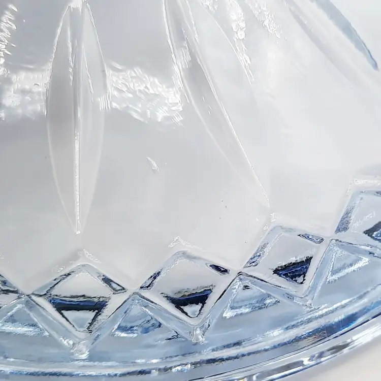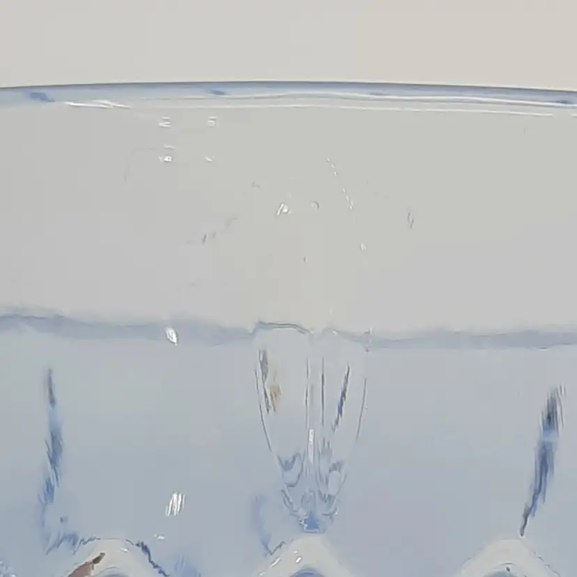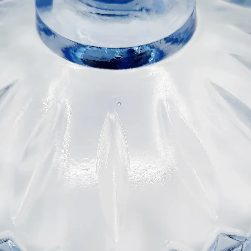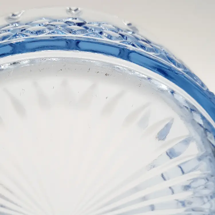 Beautiful light blue dish is 6"H x 6"W in great condition with a few small scuffs and air bubbles in glass
