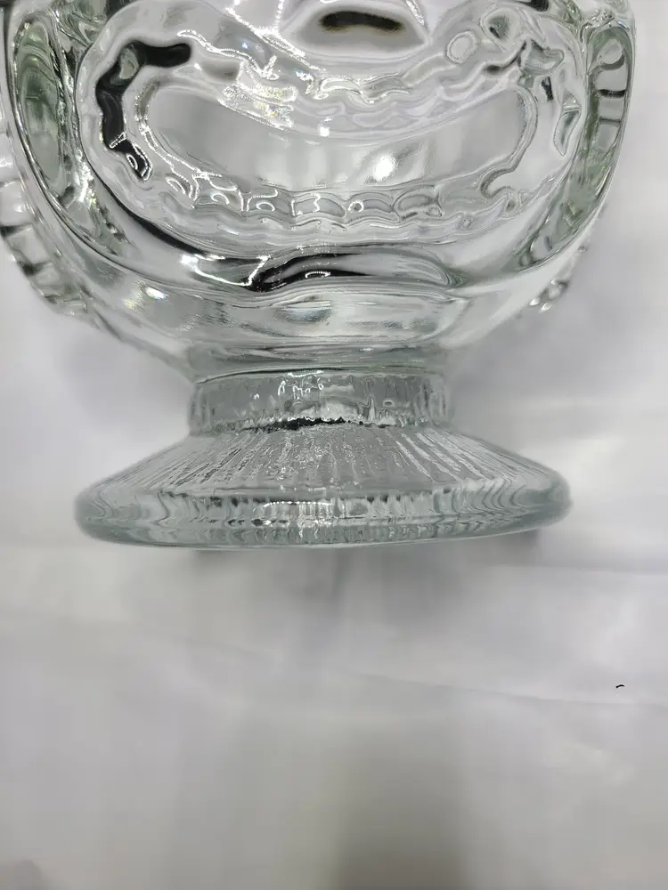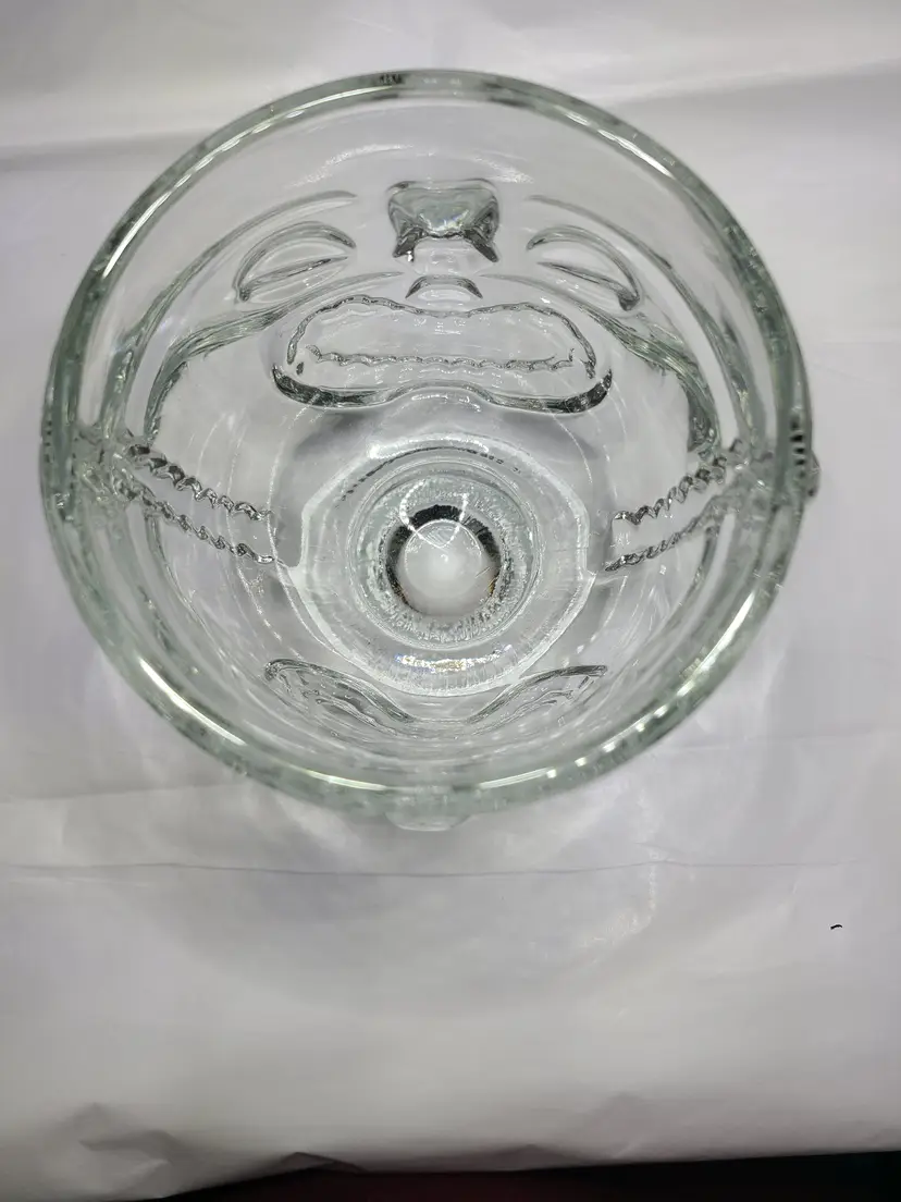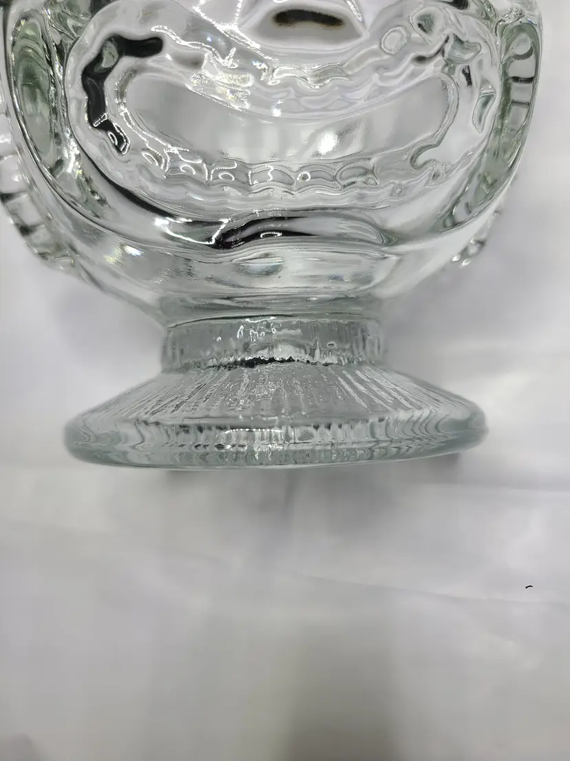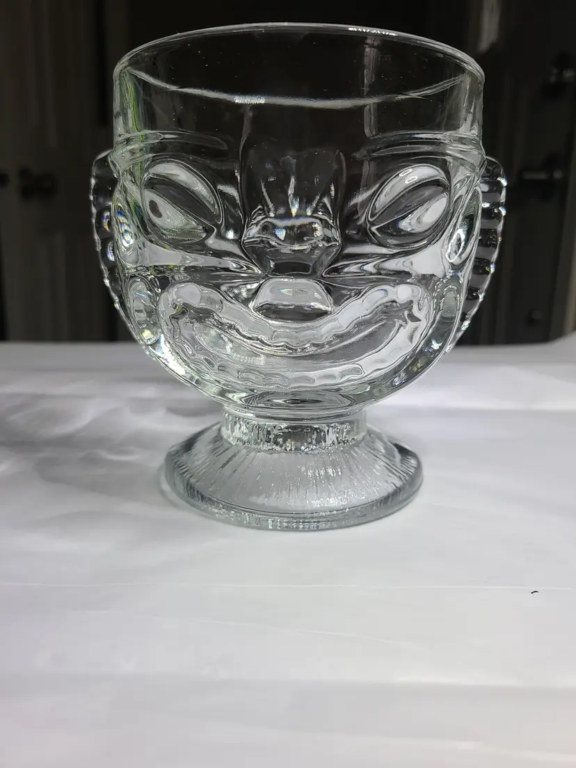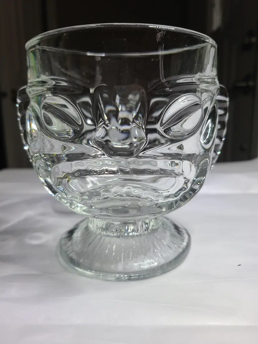 Heavy vintage Indiana Glass Clear Tiki Decorators Bowl with Sad & Happy Faces. Produced in the 70s. Apparently, there is a debate as to whether this is a drinking glass, planter, bowl or vase. I'll let you decide. Use as a vessel for your favorite tropical drink or a centerpiece for your next Hawaiian Luau party. Excellent condition. No chips, cracks or scratches, but typical characteristics of vintage pressed glass, including shear line. Approx 4-5/8" tall, 4" wide at rim.