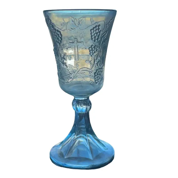 Standing at 7 inches tall and 3 inches wide, this goblet is perfect for both display and use. The frosted stem adds a touch of sophistication, making it a standout addition to any collection. Whether you're a collector of religious artifacts or simply appreciate the beauty of vintage glassware, this goblet is sure to impress.