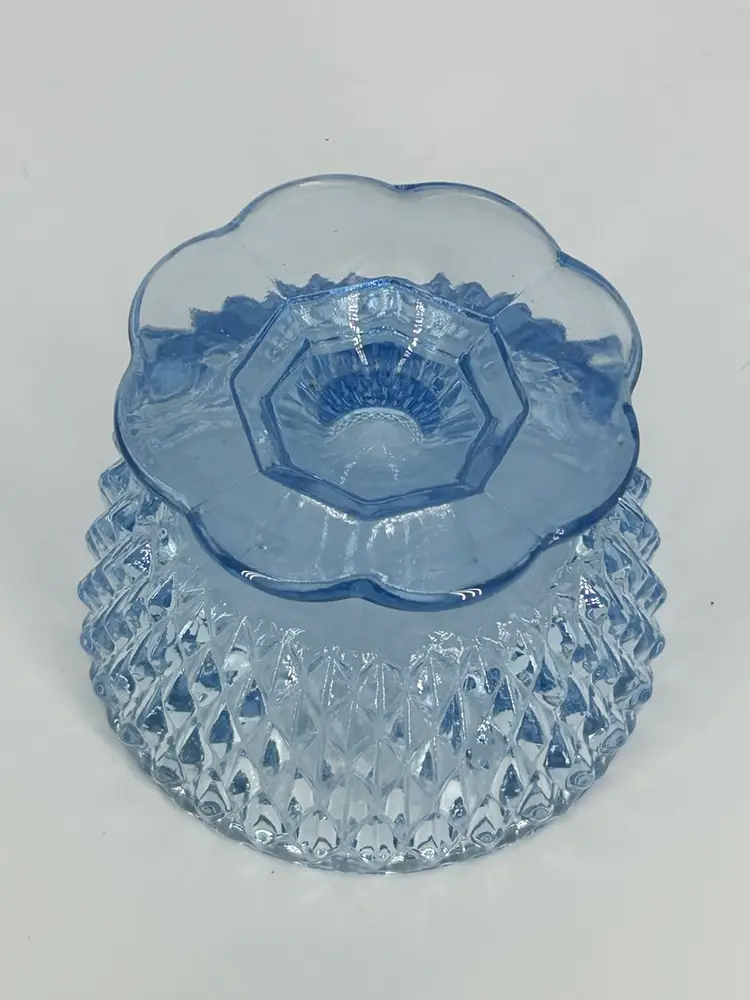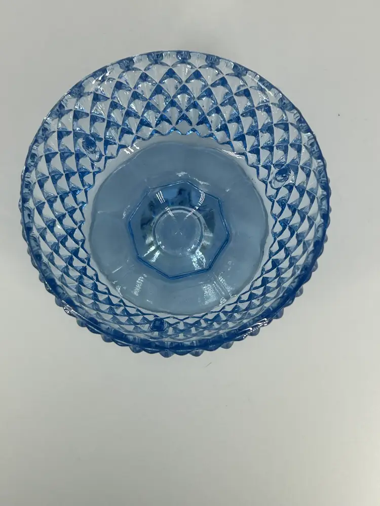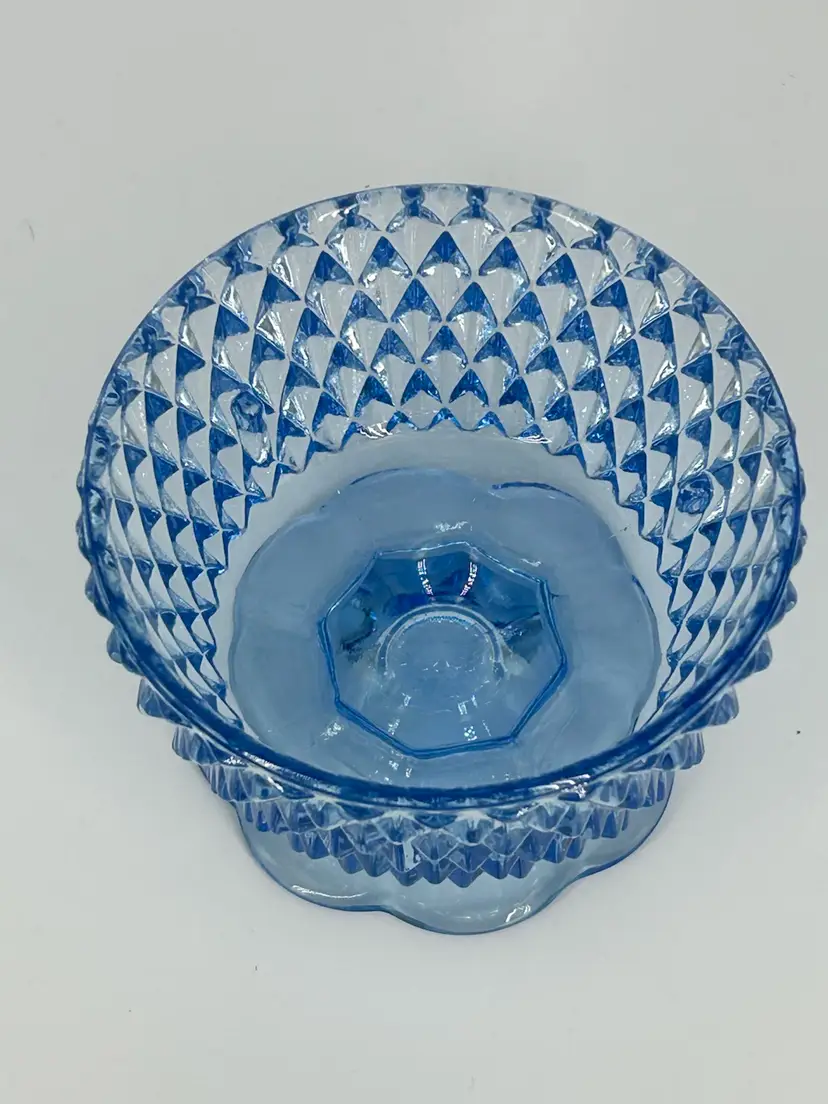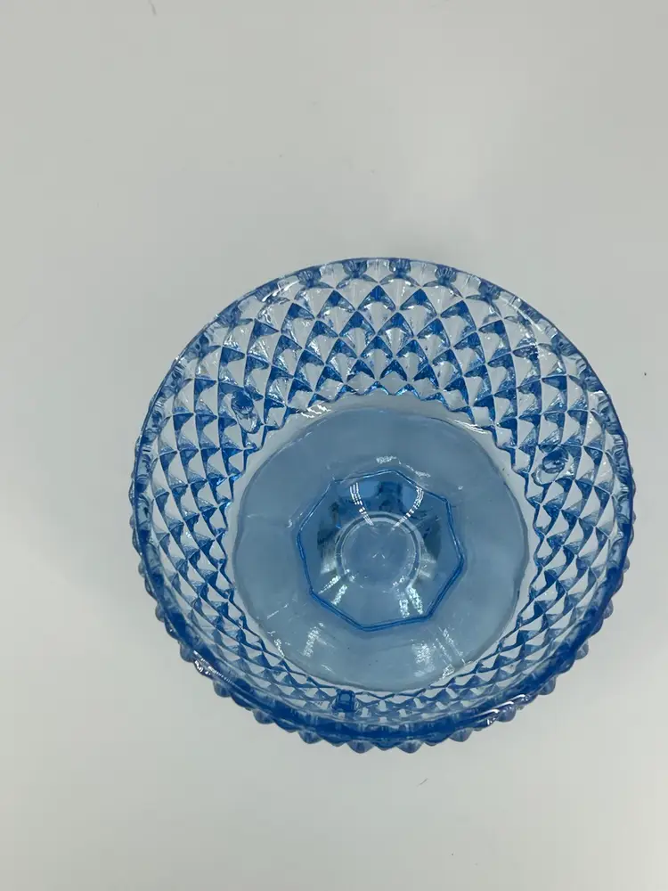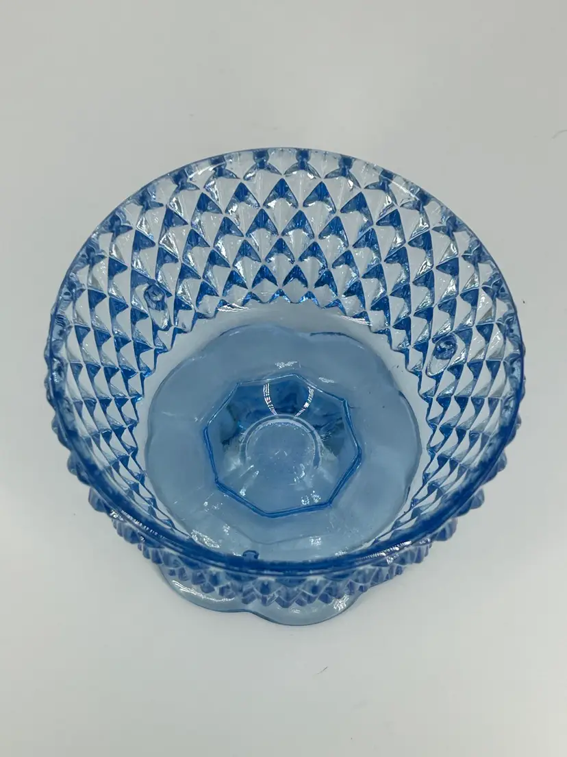 Add a touch of vintage elegance to your space with this stunning blue glass base from Indiana Glass, featuring the iconic Diamond Point pattern. Crafted in the mid-20th century in the USA, this versatile Mid-Century Modern piece works beautifully as a candle holder, trinket dish, or decorative accent. The textured diamond design and rich blue hue offer a timeless retro charm perfect for any setting or occasion.