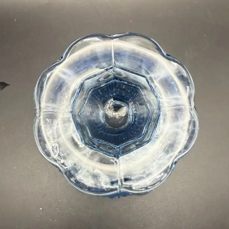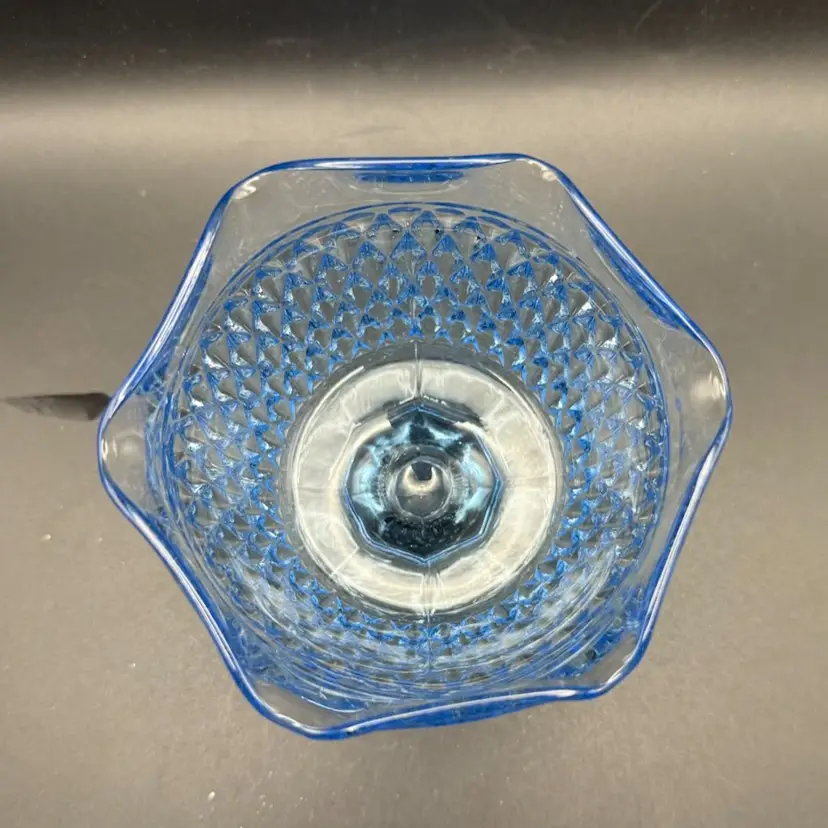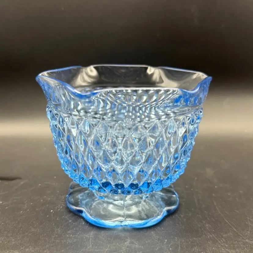 This particular piece showcases the typical pressed glass technique of the era, where molten glass was forced into a mold to create intricate patterns. The ice blue color is a classic choice for this pattern, and was produced between 1982 and 1987. It is 3.25 inches high and 4 inches wide.