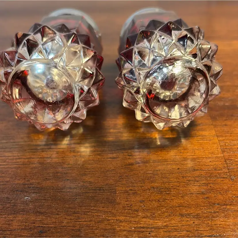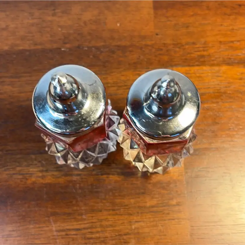 This set of salt and pepper shakers features ruby flash glass. They are made by the Indiana Glass Co The metal lids are typical of shakers from the mid 20th century. They stand 4 inches tall. The ruby flash is in excellent condition. There are no condition issues.