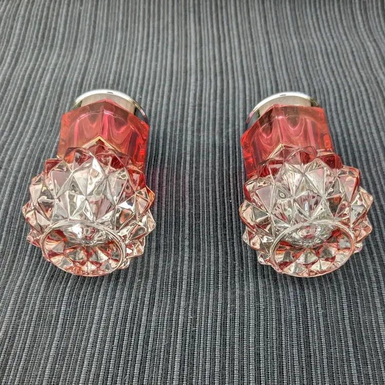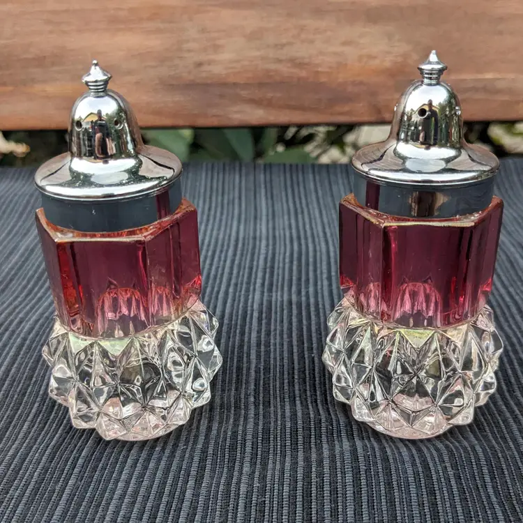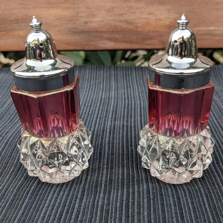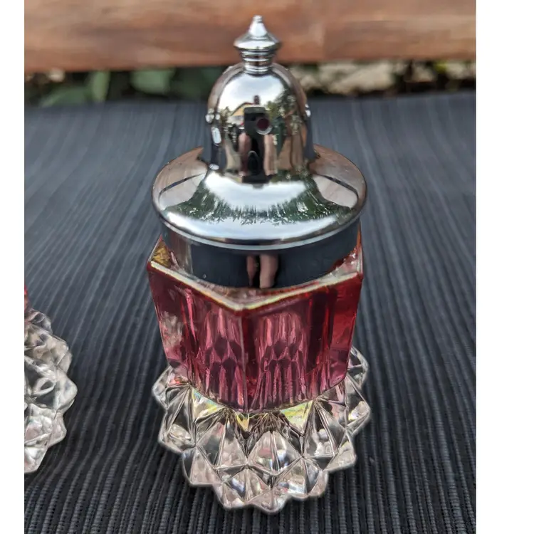 Very pretty set. The lids are silver colored plastic. The ruby flash is in great condition. No chips, cracks, breaks or repairs. All pictures provided are a part of the item's description. Shipped with USPS Ground Advantage.
