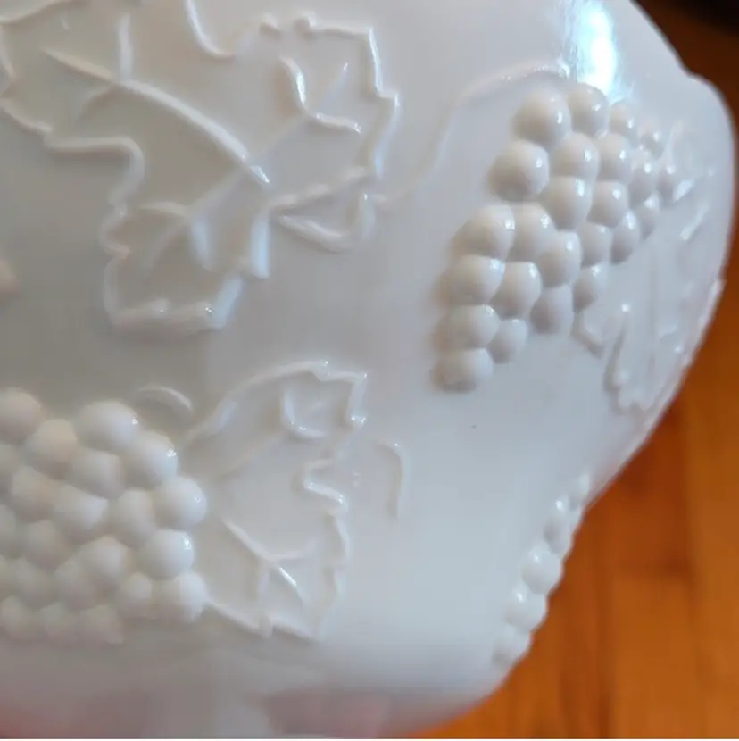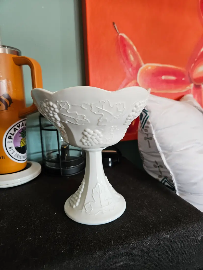 Elevate your table setting with this charming vintage ceramic pedestal bowl, featuring an elegant grape/leaf motif. Perfect for displaying fruit or as a centerpiece. 8x7