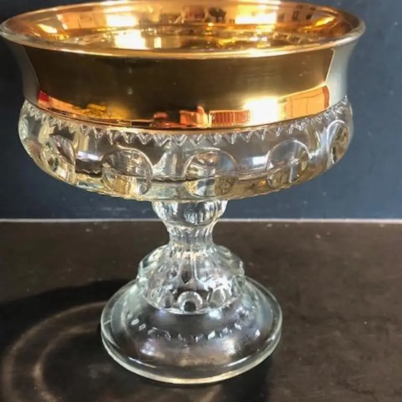 Vintage Indiana Glass Kings Crown Gold Rim Thumbprint Glass Compote Pedestal. Good condition. 5-1/4" tall, 5" wide