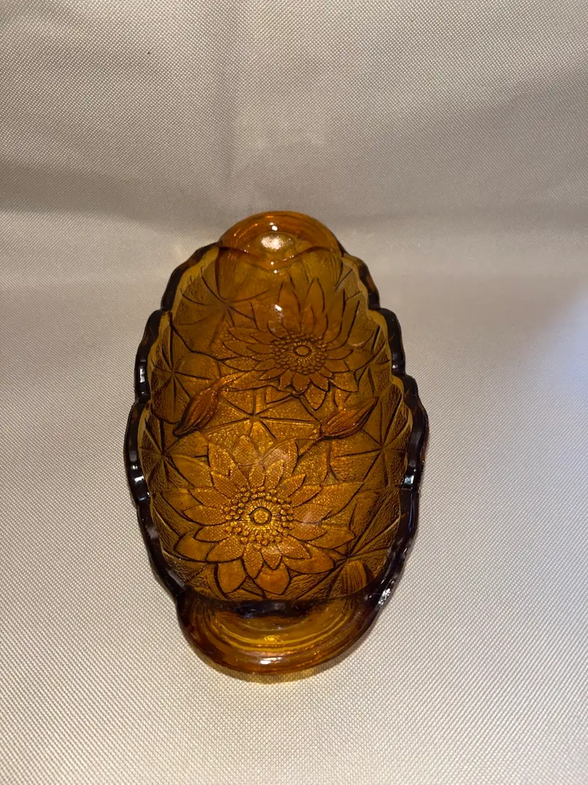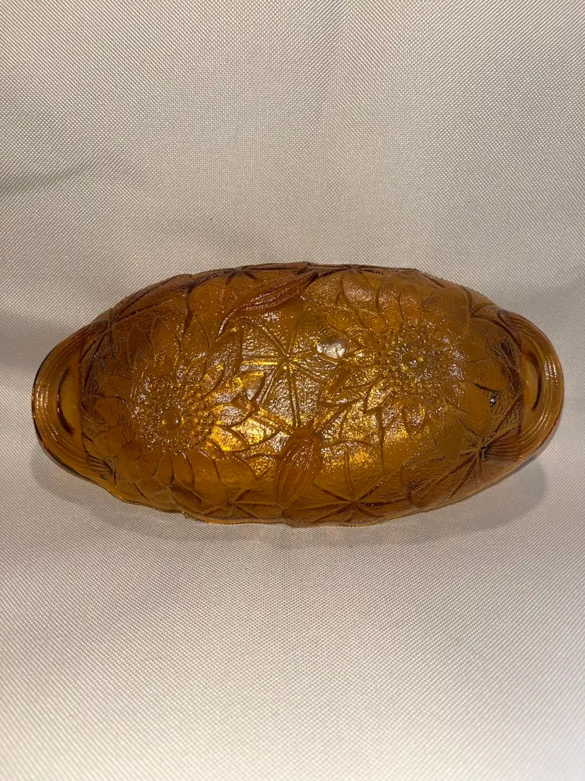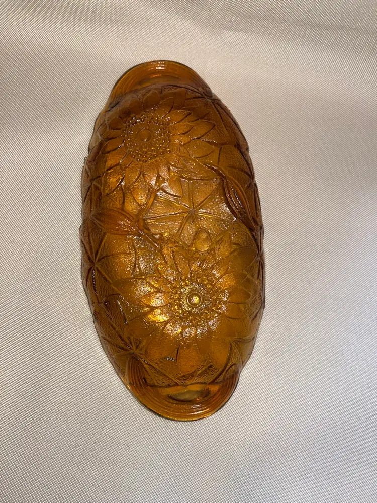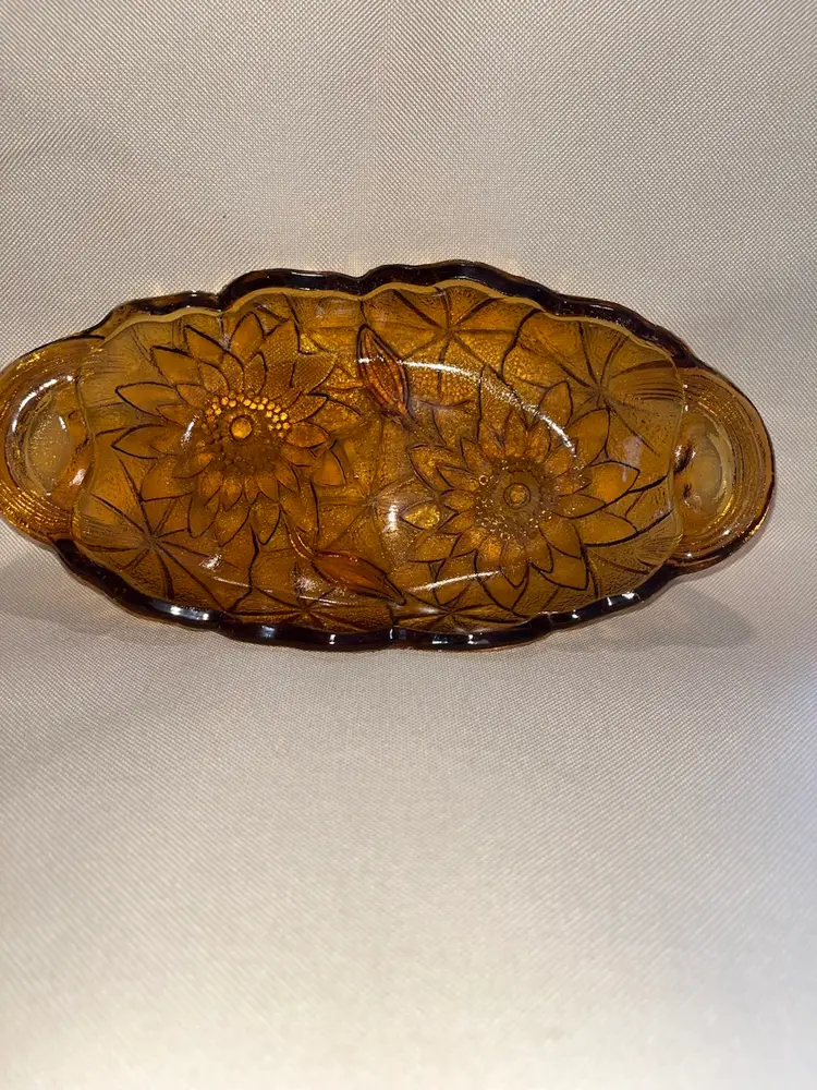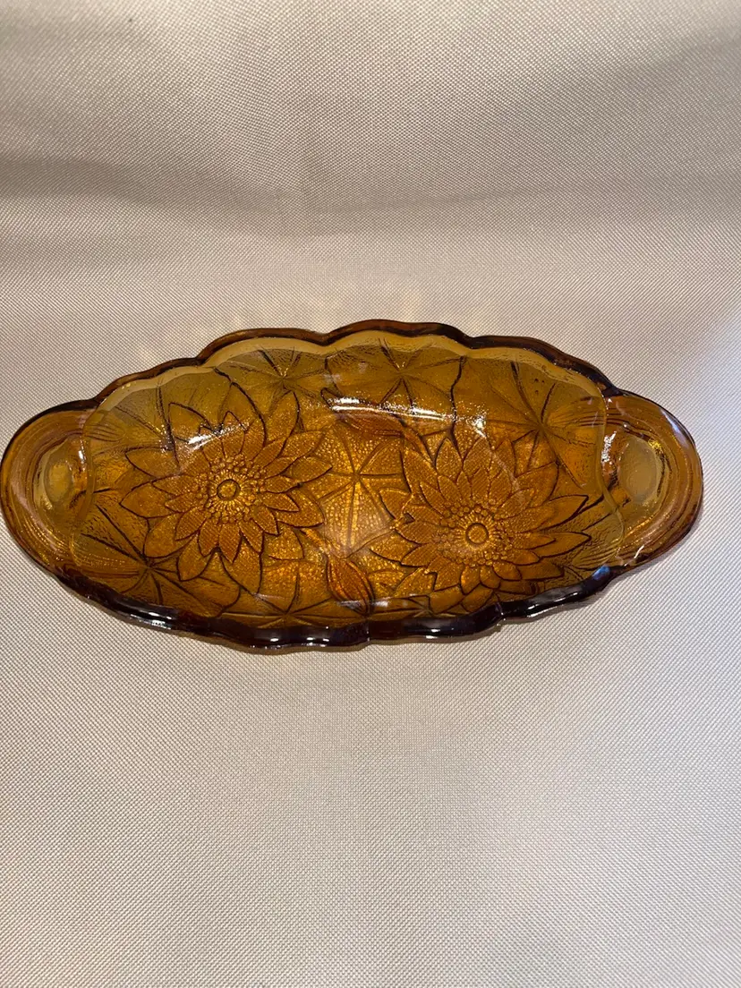 Beautiful vintage amber Indiana glass pattern Lily Pons relish/trinket dish. 9 1/2” long 1 1/3” tall. In great condition no chips or cracks.