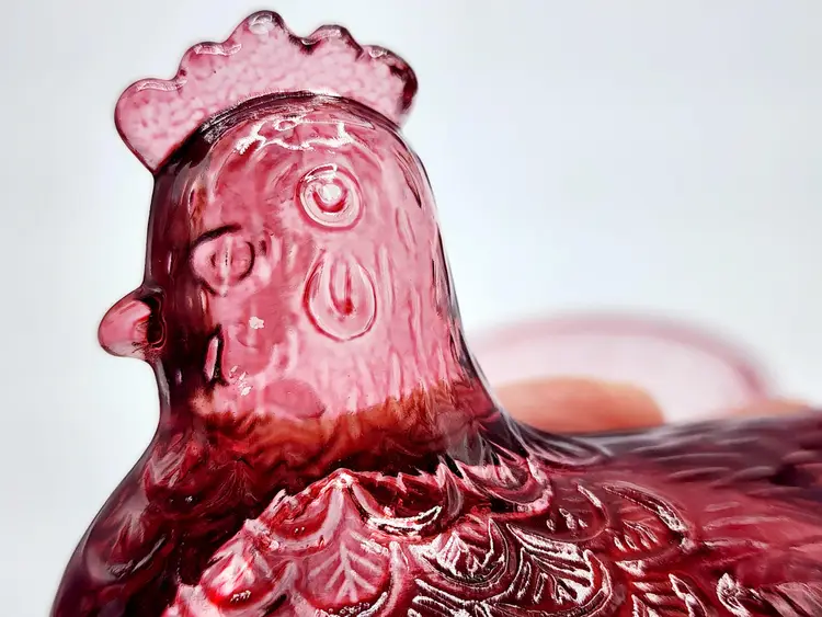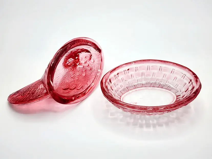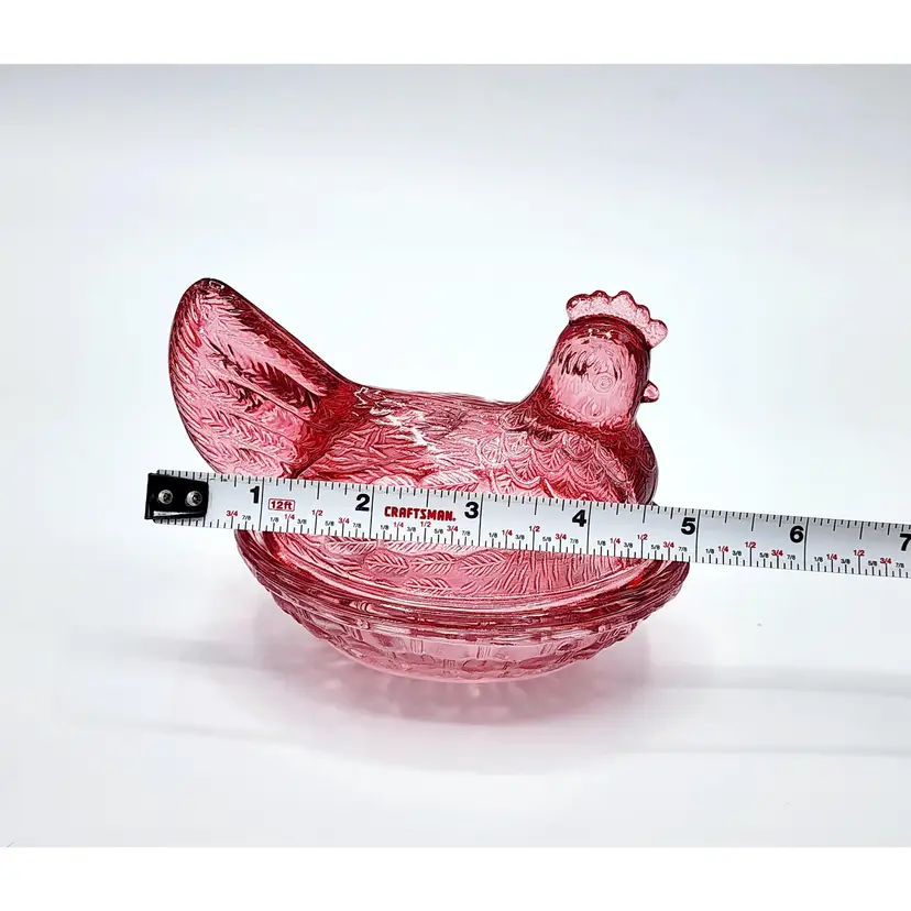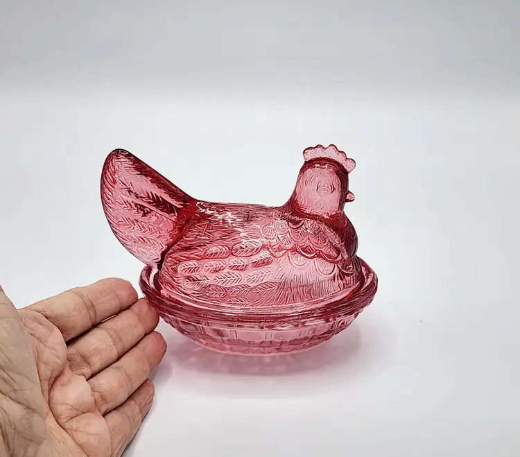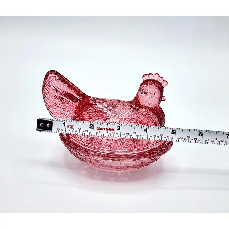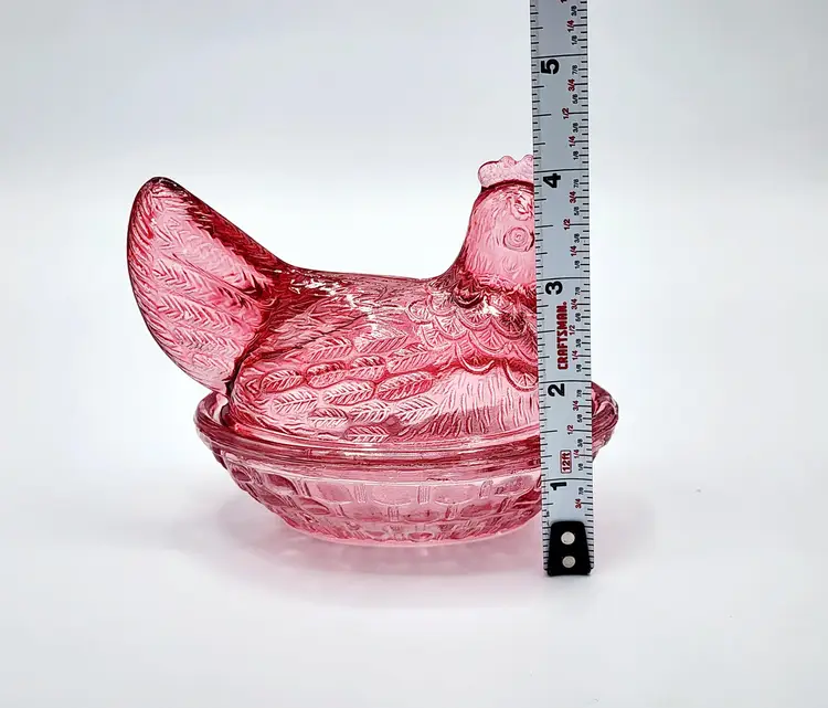 Vintage Indiana Glass Hen on Nest - Rasberry flashed glass, Condition: no chips, couple spots with faded color. Measurements: 5" long, 4" tall.