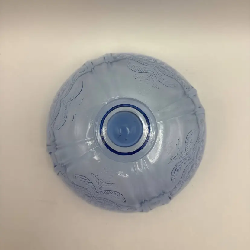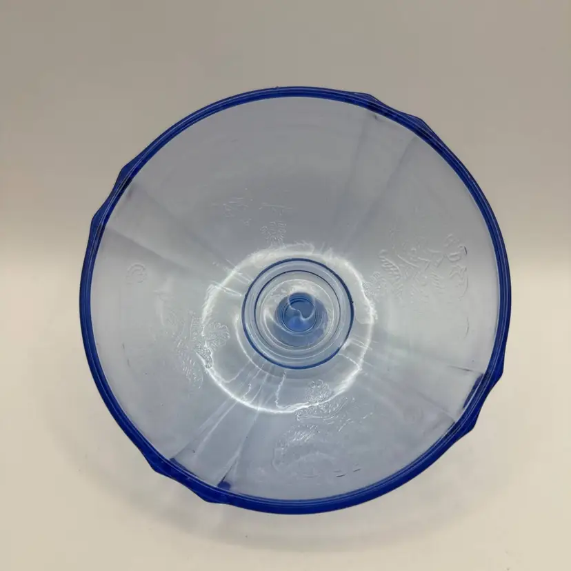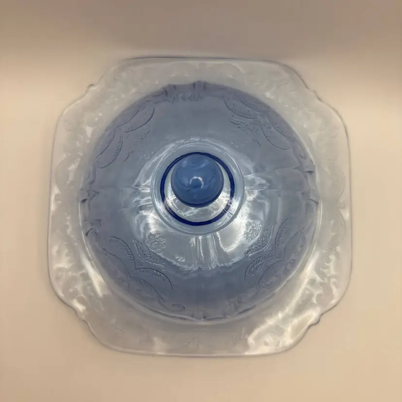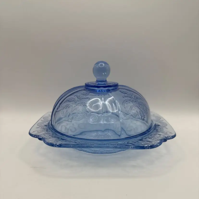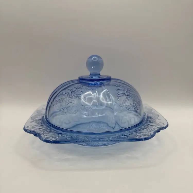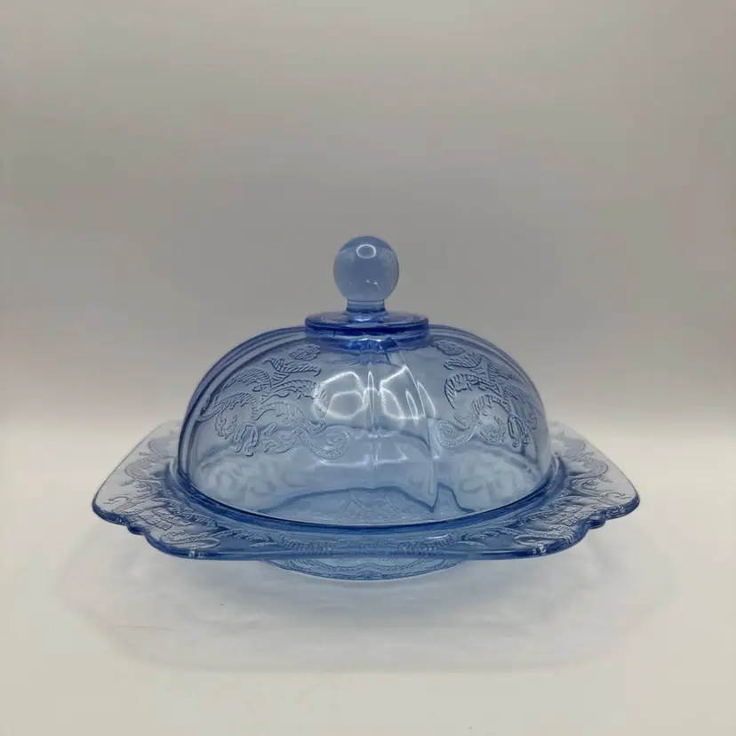 The Indiana Glass Recollection Blue Round Covered Butter Dish is a vintage collectible piece for the kitchen and home. This original butter dish features a round shape and a beautiful blue color, made of glass material.