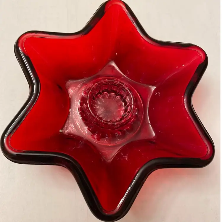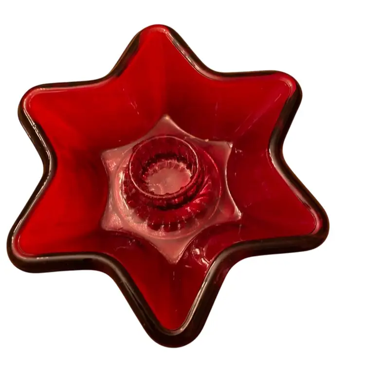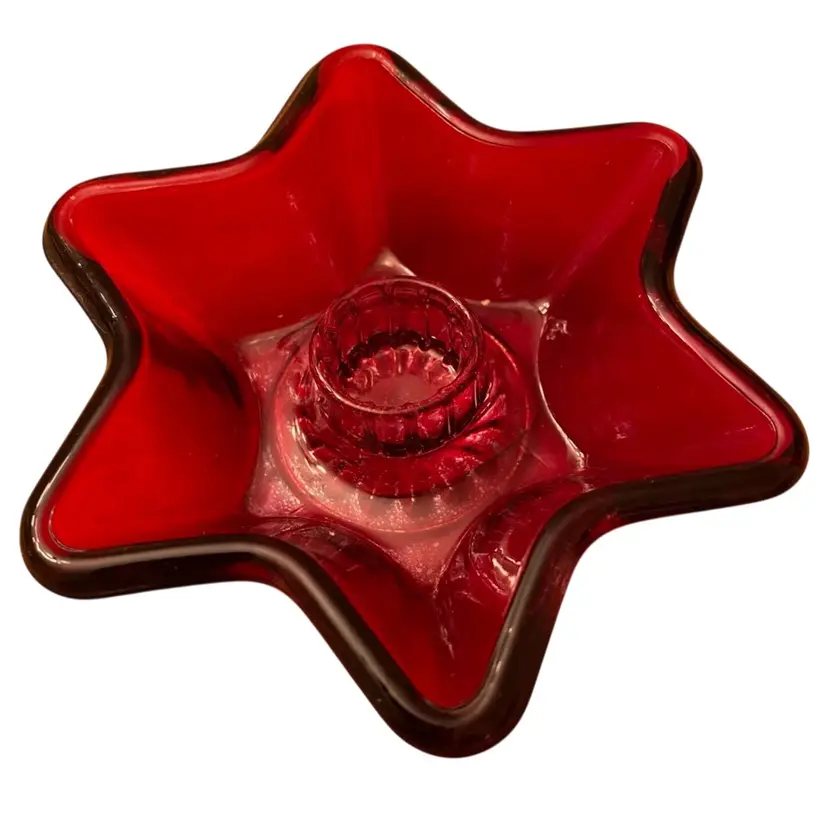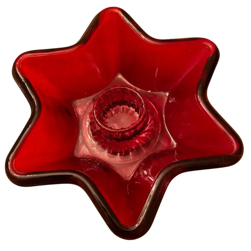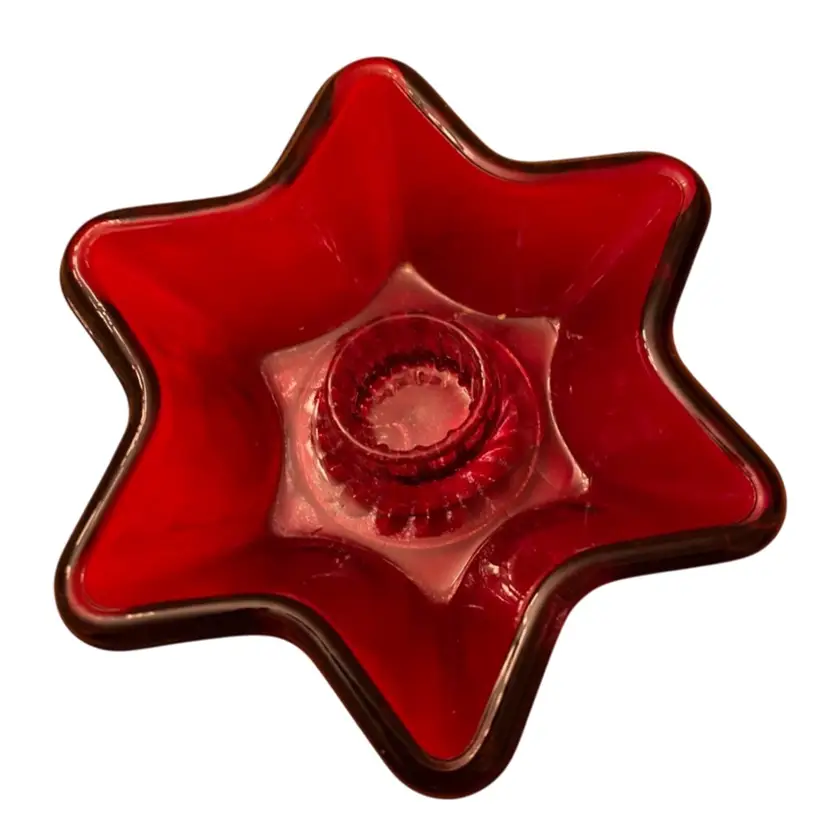 Add a touch of vintage charm to your décor with this beautiful VINTAGE INDIANA GLASS RED STAR-SHAPED CANDLE HOLDER. Crafted from high-quality glass by Indiana Glass, this beautiful candle holder is perfect for adding a touch of elegance to any setting. Featuring a festive red color and star-shaped design, this candle holder would be a lovely addition at the holidays and all year long.