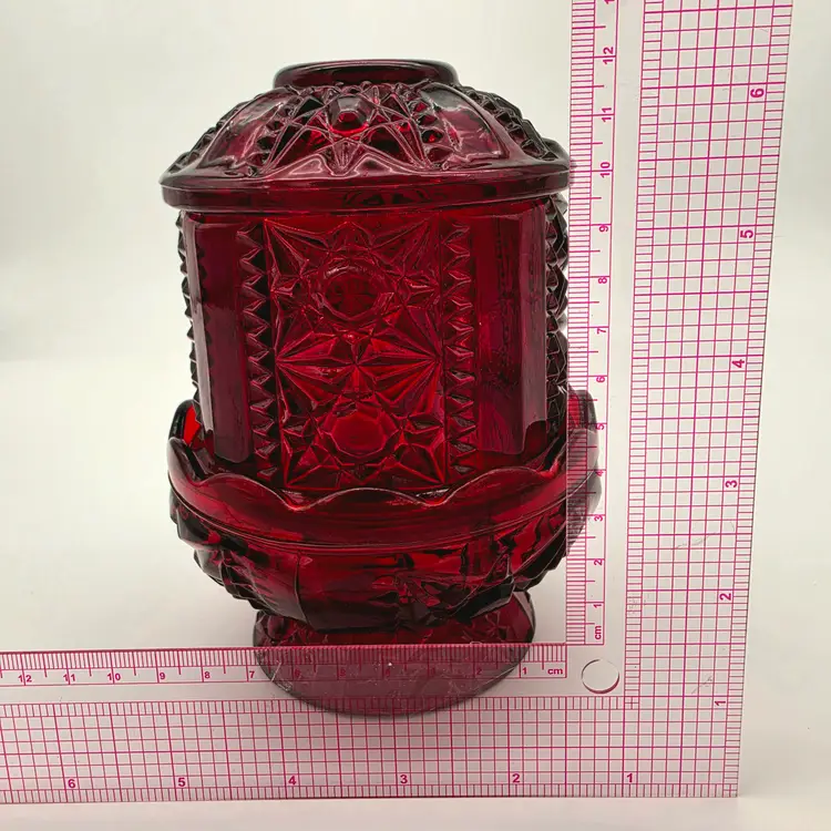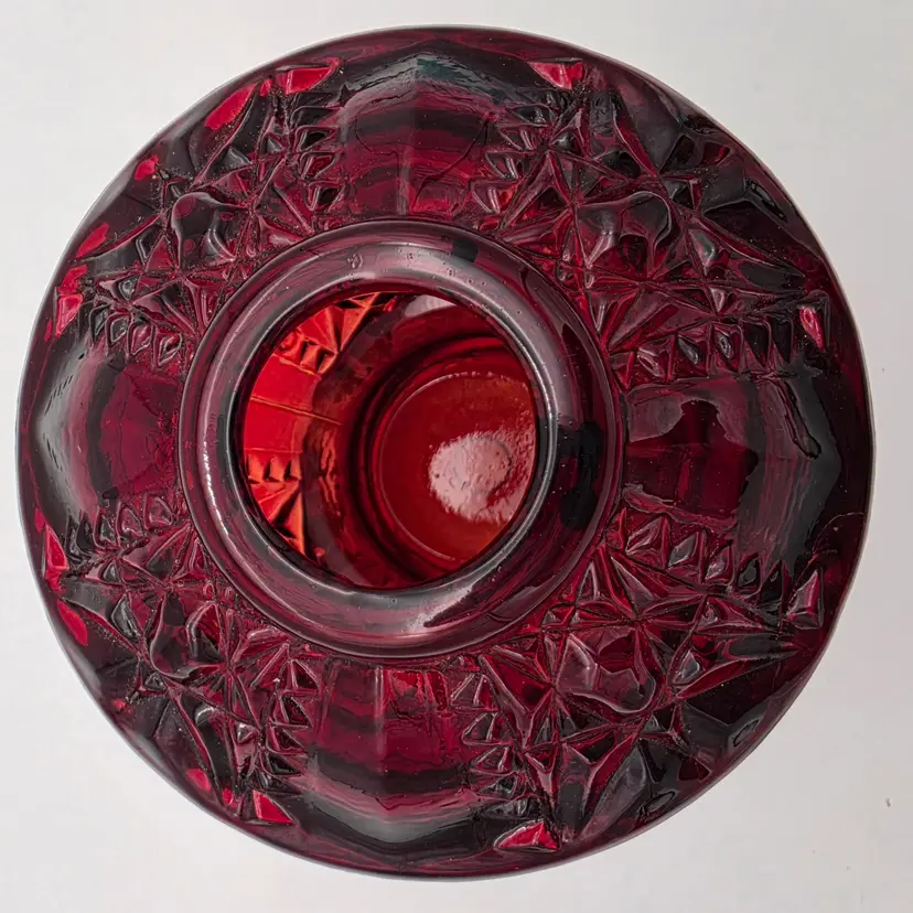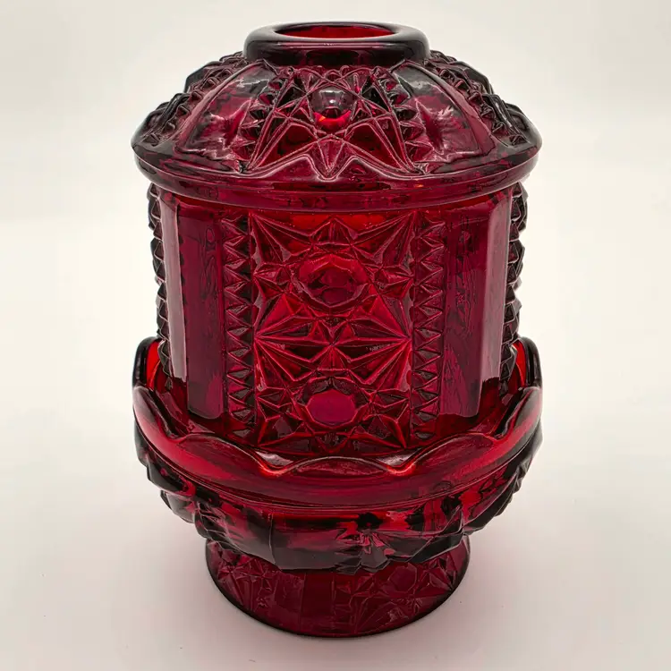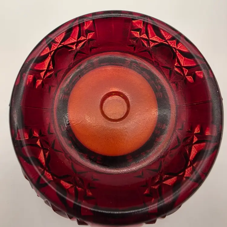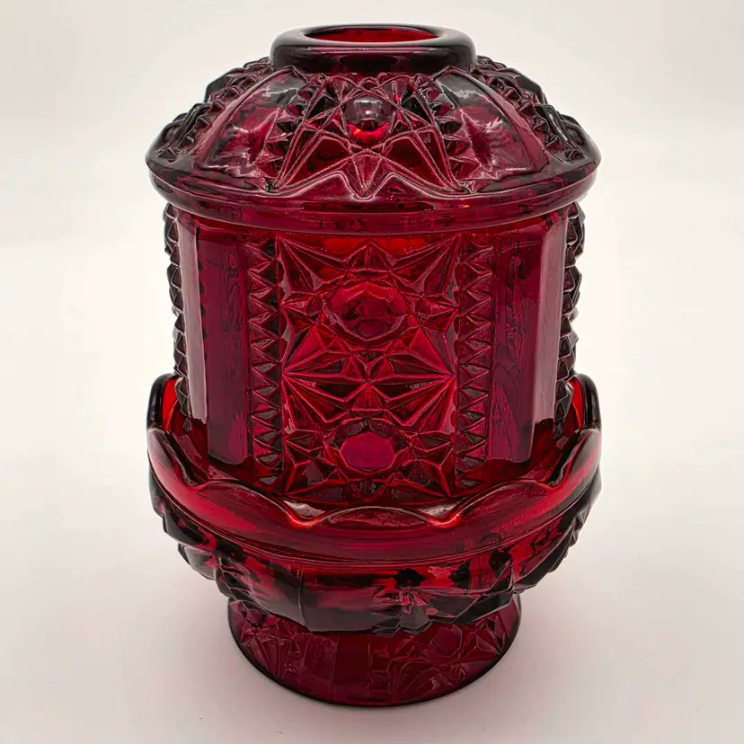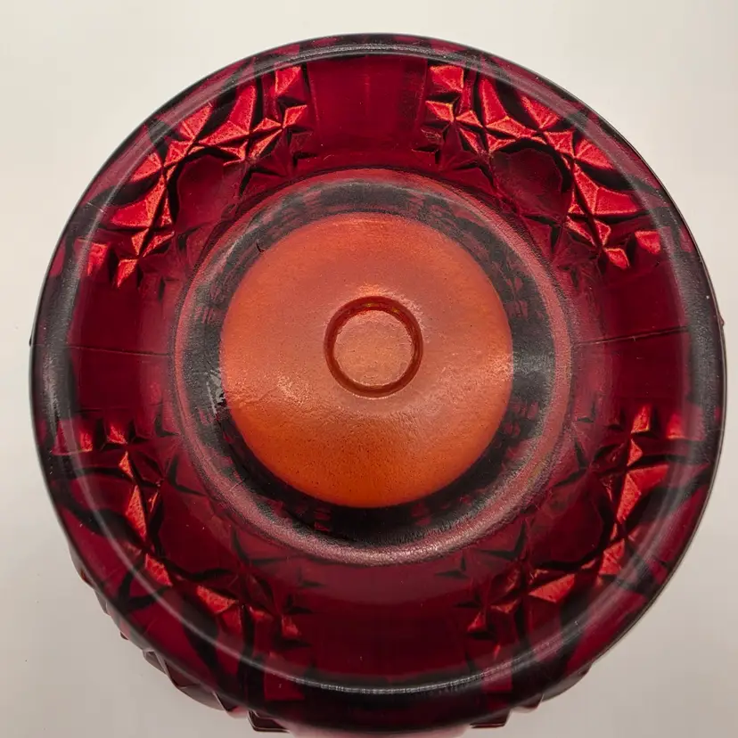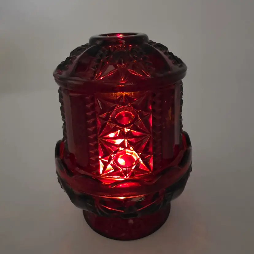 Add a touch of vintage charm to your home with this stunning ruby red fairy lamp from the Indiana Glass Company. Featuring the classic "Stars and Bars" pattern, this piece creates a beautiful, warm glow when lit with a votive or tea light candle.