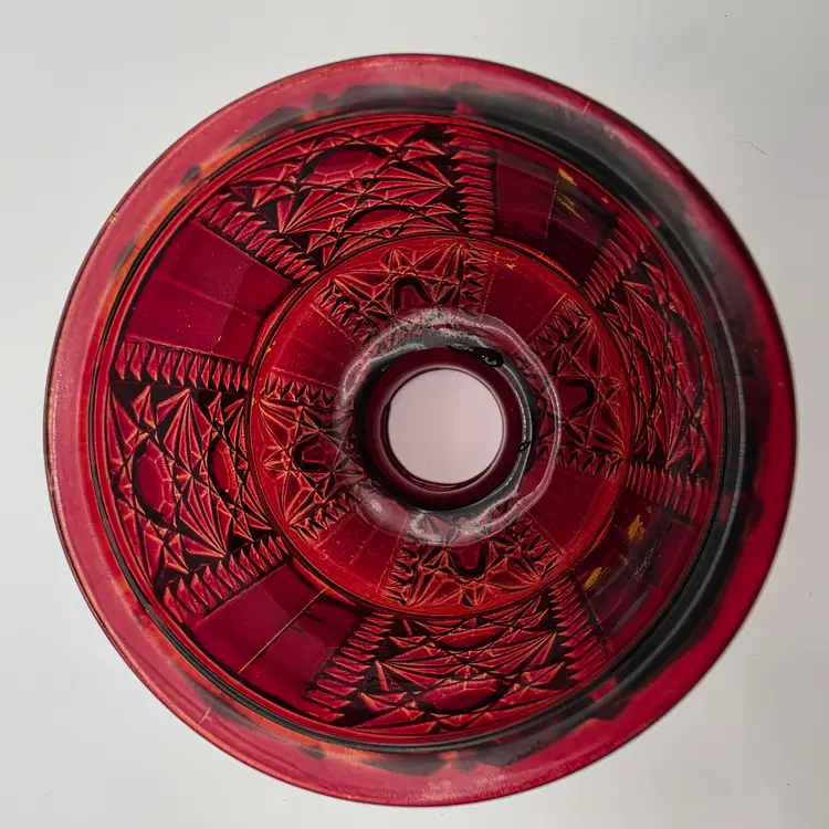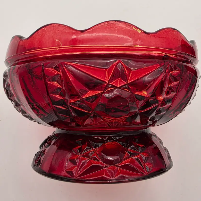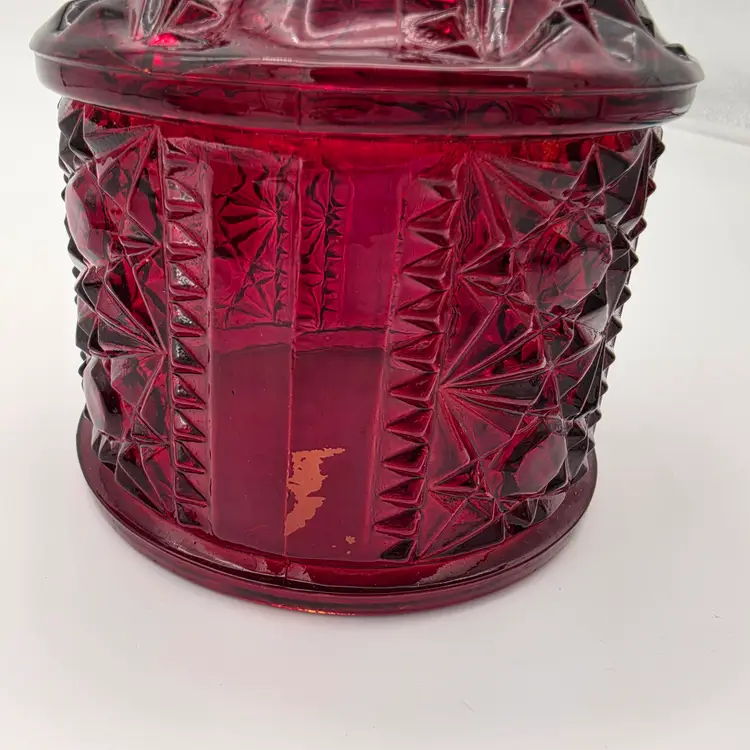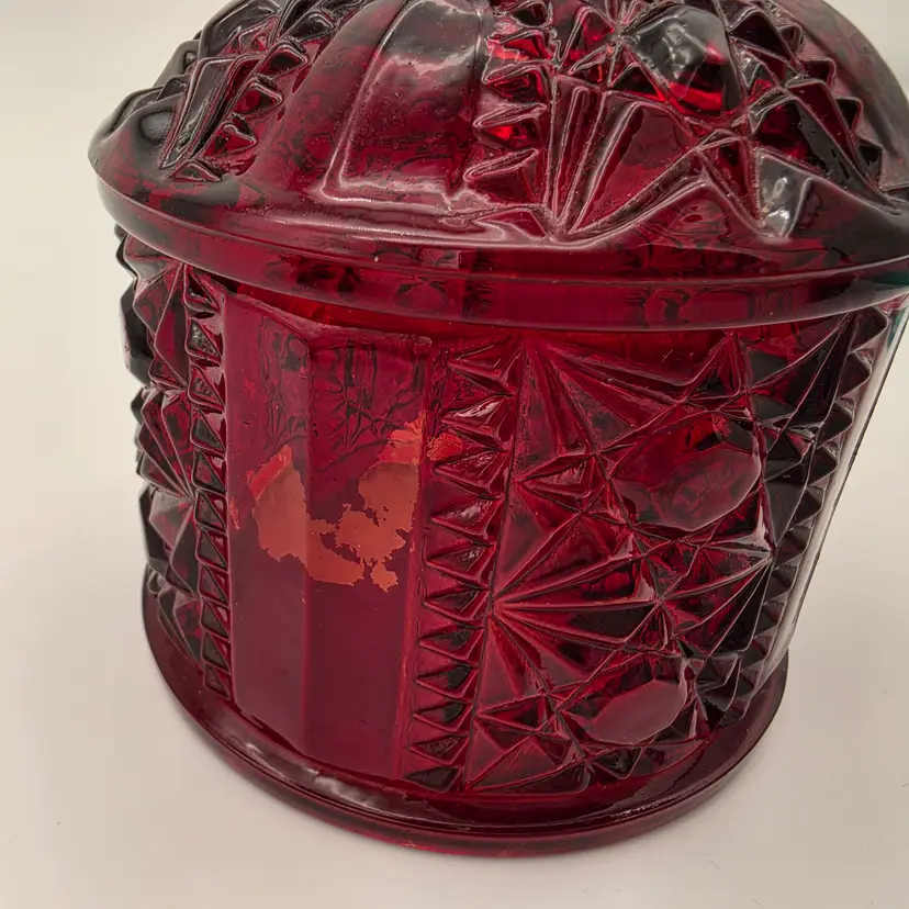 Brand: Indiana Glass Company Pattern: Stars and Bars (highly distinctive geometric design). Color: Ruby Red Flash (red coating over amber pressed glass) Era: Mid-20th Century (approx. 1960s–1970s) Dimensions: Approximately 6.5 inches tall and 5 inches wide Condition: Red flashing wearing off in some areas as detailed in pictures